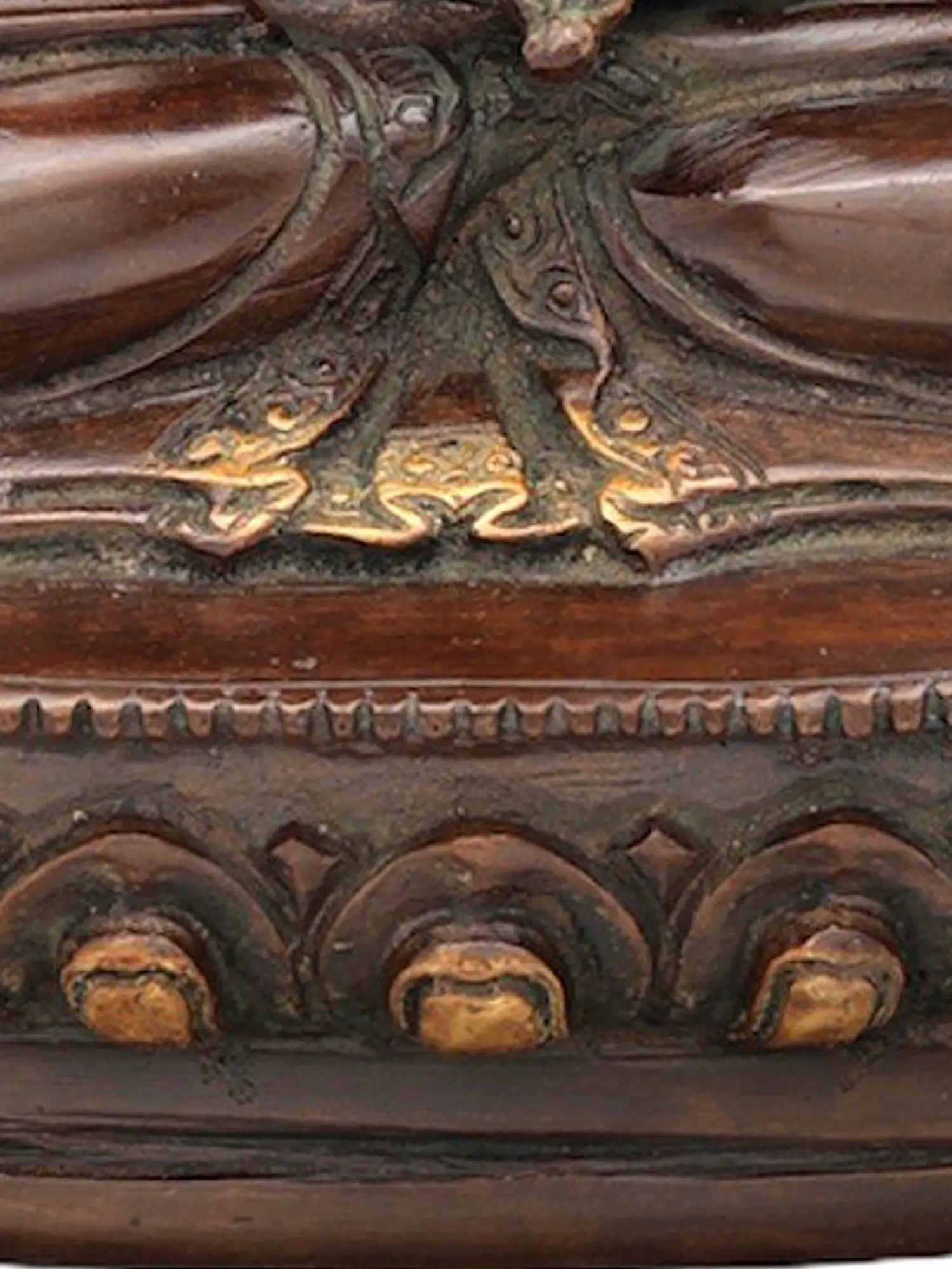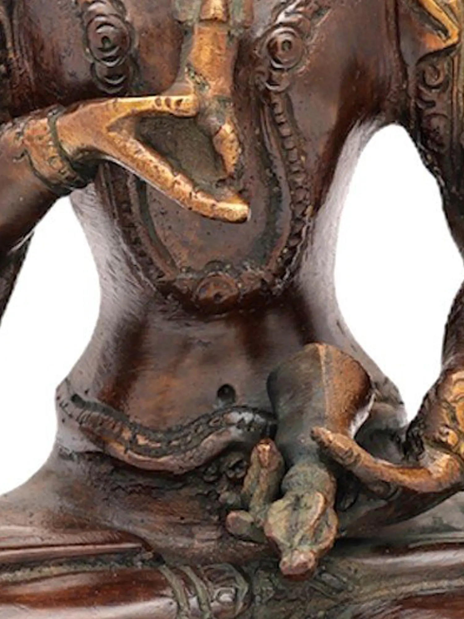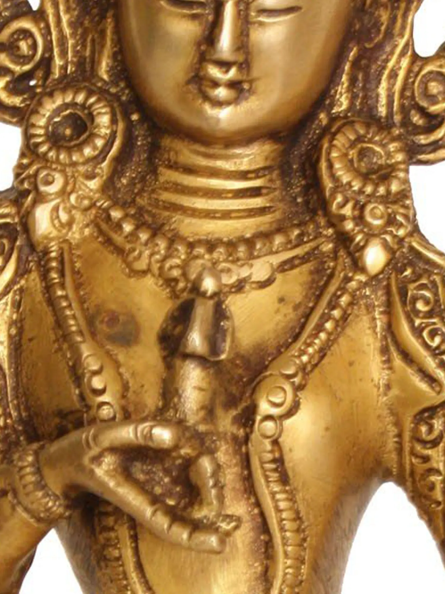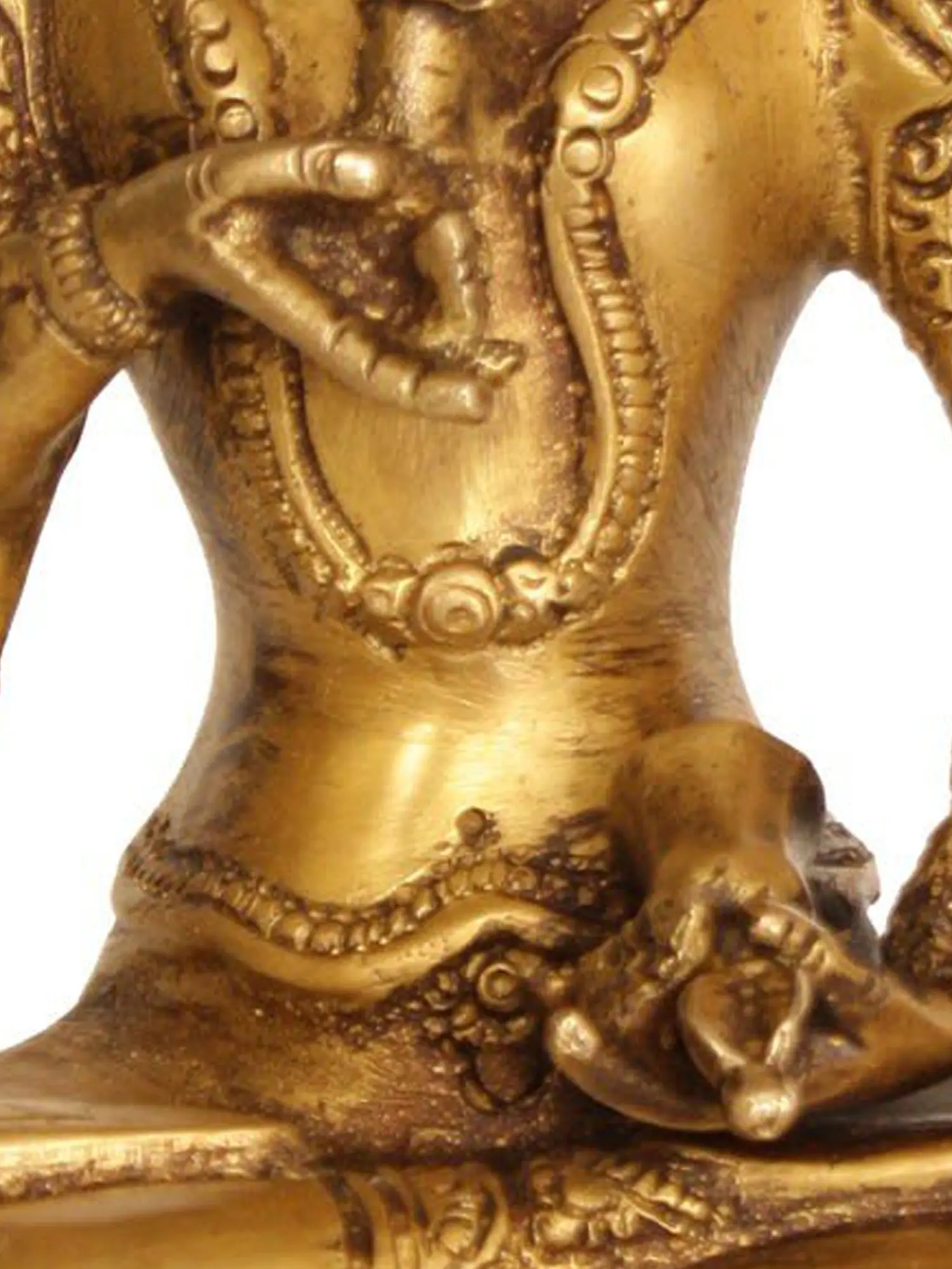 This Brass statue of Tibetan Buddhist Deity Vajrasattva radiates a divine aura with its gold and brown lacquer finish. Vajrasattva, a symbol of purity and spiritual transformation, stands majestically, holding a Vajra (thunderbolt) and a Bell, representing wisdom and compassion in perfect harmony. The Vajra and Bell in his hands signify the union of method and wisdom in the path to enlightenment. His serene countenance and resplendent presence inspire devotees on their journey towards spiritual cleansing and realization. This exquisite brass sculpture encapsulates the profound teachings of Vajrasattva, reminding us of the transformative power of inner purity and the fusion of wisdom and compassion.