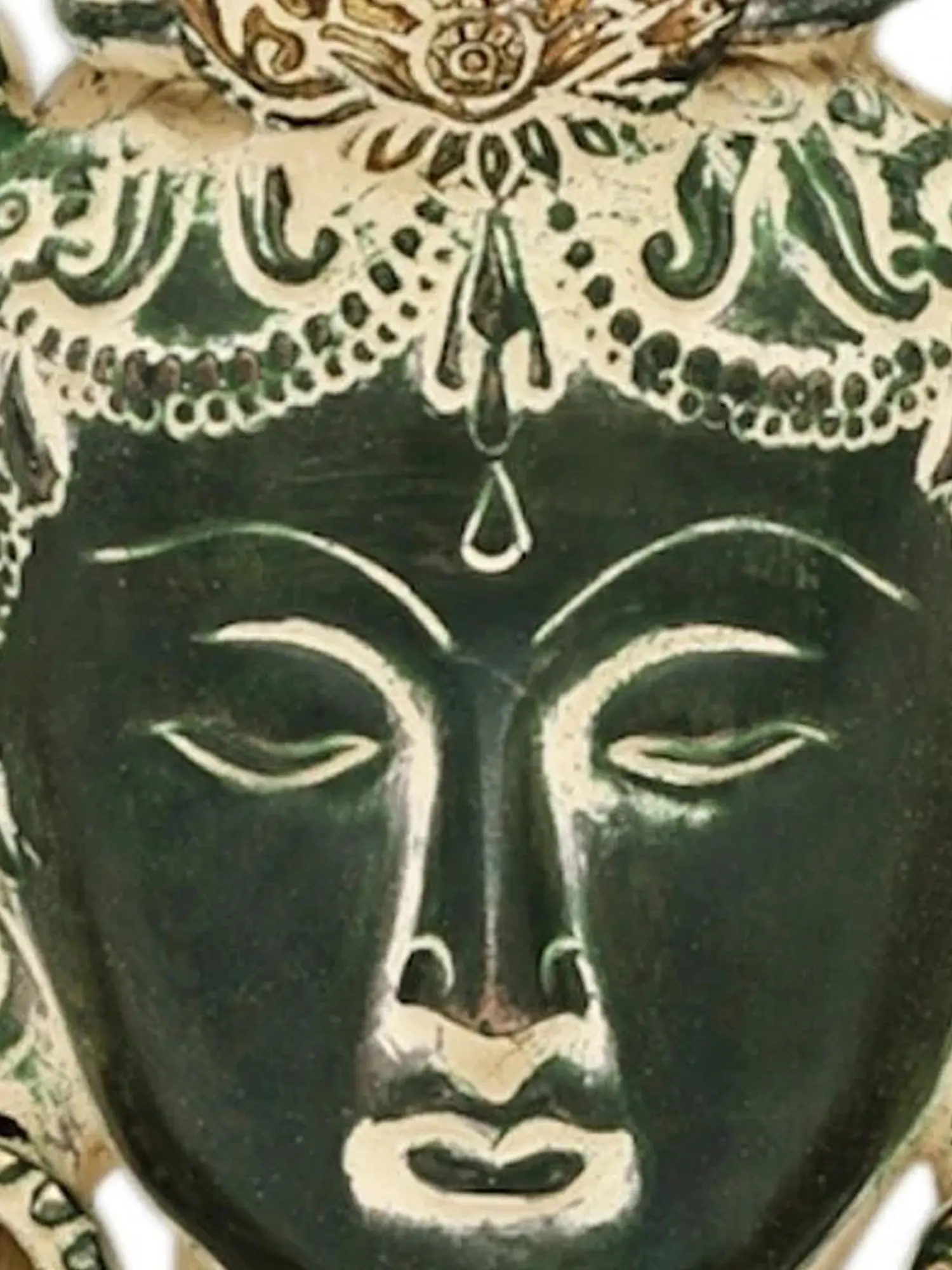 Tara is a prominent figure in Tibetan Buddhism, celebrated as a Bodhisattva of compassion and action. Legends tell of her arising from a tear shed by Avalokiteshvara, the Bodhisattva of Compassion, as he wept for the suffering of the world. Her form is often depicted as youthful and radiant, embodying active compassion and the power to overcome obstacles. She is known by many names and forms, each representing different aspects of her protective and liberating power, such as Green Tara, White Tara, Red Tara, and Yellow Tara. This mask, with its serene countenance, is a visual representation of her benevolent gaze, offering protection and guidance to all who seek her aid. The presence of the Dharma Chakra (Wheel of Law) on either side of her head further signifies her role in turning the wheel of the Dharma and leading beings towards enlightenment.