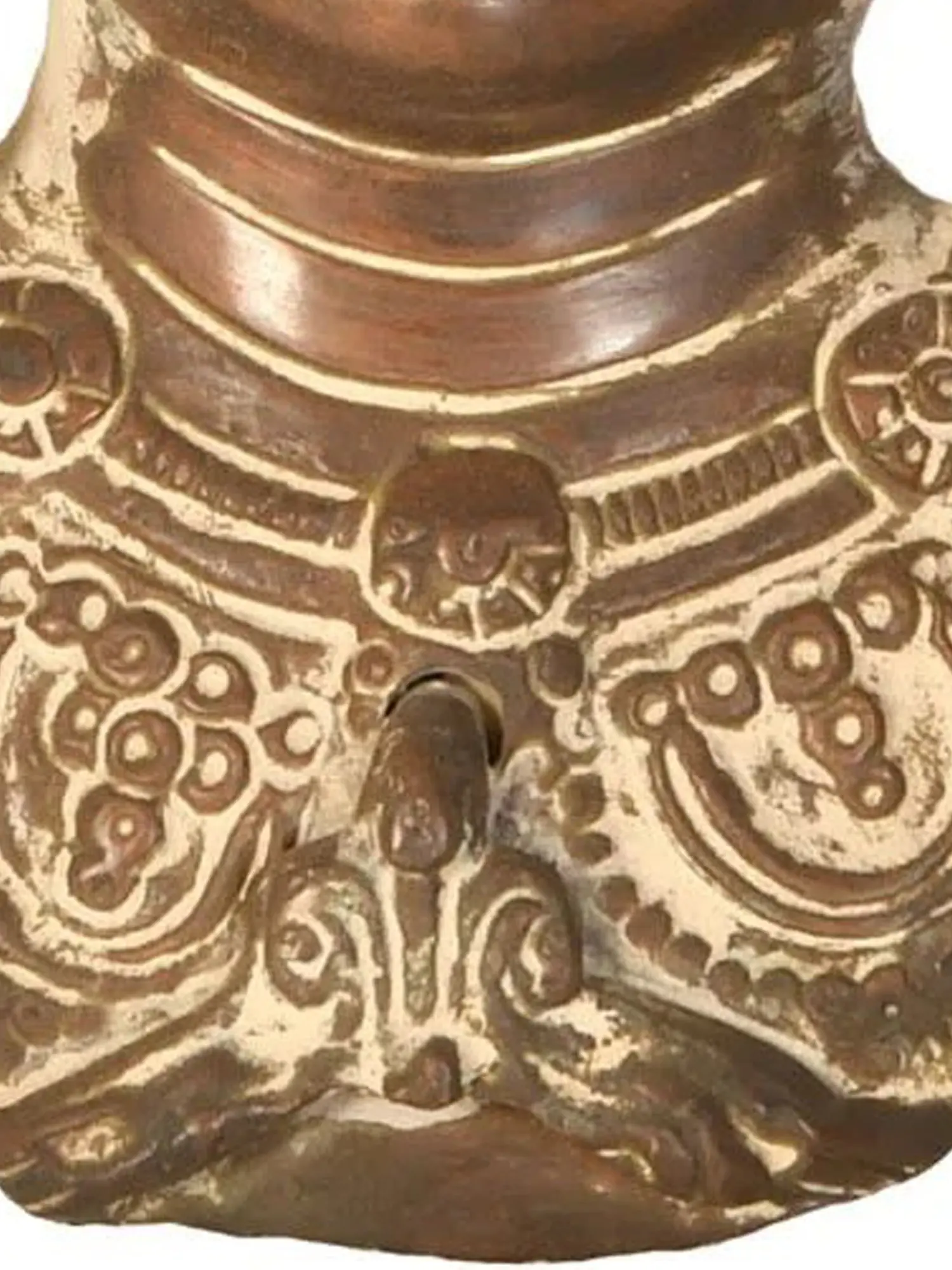 This captivating mask is meticulously handcrafted from brass, a material revered for its durability and ability to capture fine details. The artisan's skilled hands have brought forth a piece that is both robust and delicate, with each curve and contour expertly shaped. The rich patina achieved through the finishing process adds depth and character, highlighting the intricate carvings of her headdress and ornamentation. This mask is not merely a representation but a piece of art that carries the spirit of India within its metallic form. Its dimensions are thoughtfully sized to serve as a striking focal point on any wall, whether in a dedicated meditation room, a living space, or a study. The artistry ensures that each mask possesses a unique quality, making it a truly special piece for your collection.