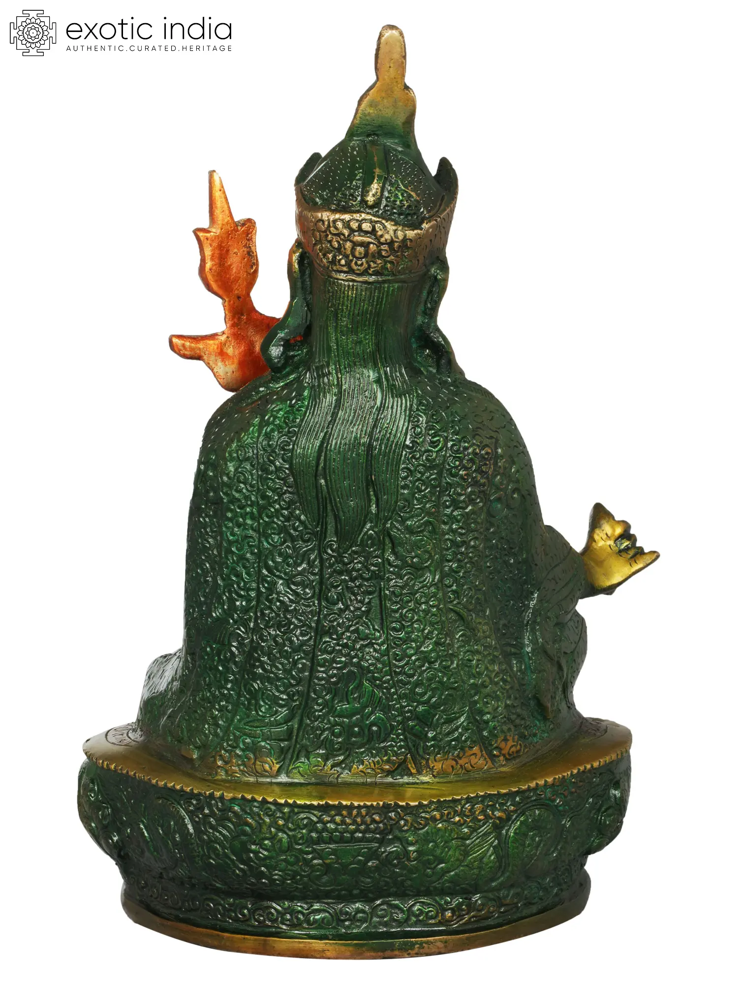 This statue is not merely an object of devotion but also a testament to the enduring legacy of Indian craftsmanship. Made from high-quality brass, the material itself holds significance, being associated with auspiciousness and longevity. The green and subtle copper patination applied to the brass enhances the visual depth and texture, bringing the deity to life. Each statue is handmade, ensuring that it possesses a unique character and spiritual vibration, a quality highly prized in devotional art. The tradition of creating such sacred objects in India has been passed down through generations, blending ancient techniques with artistic sensibility to produce pieces that are both aesthetically captivating and spiritually potent. Displaying this statue in your home or meditation space can serve as a constant reminder of the profound teachings of Padmasambhava and invoke his blessings for wisdom, protection, and spiritual progress.