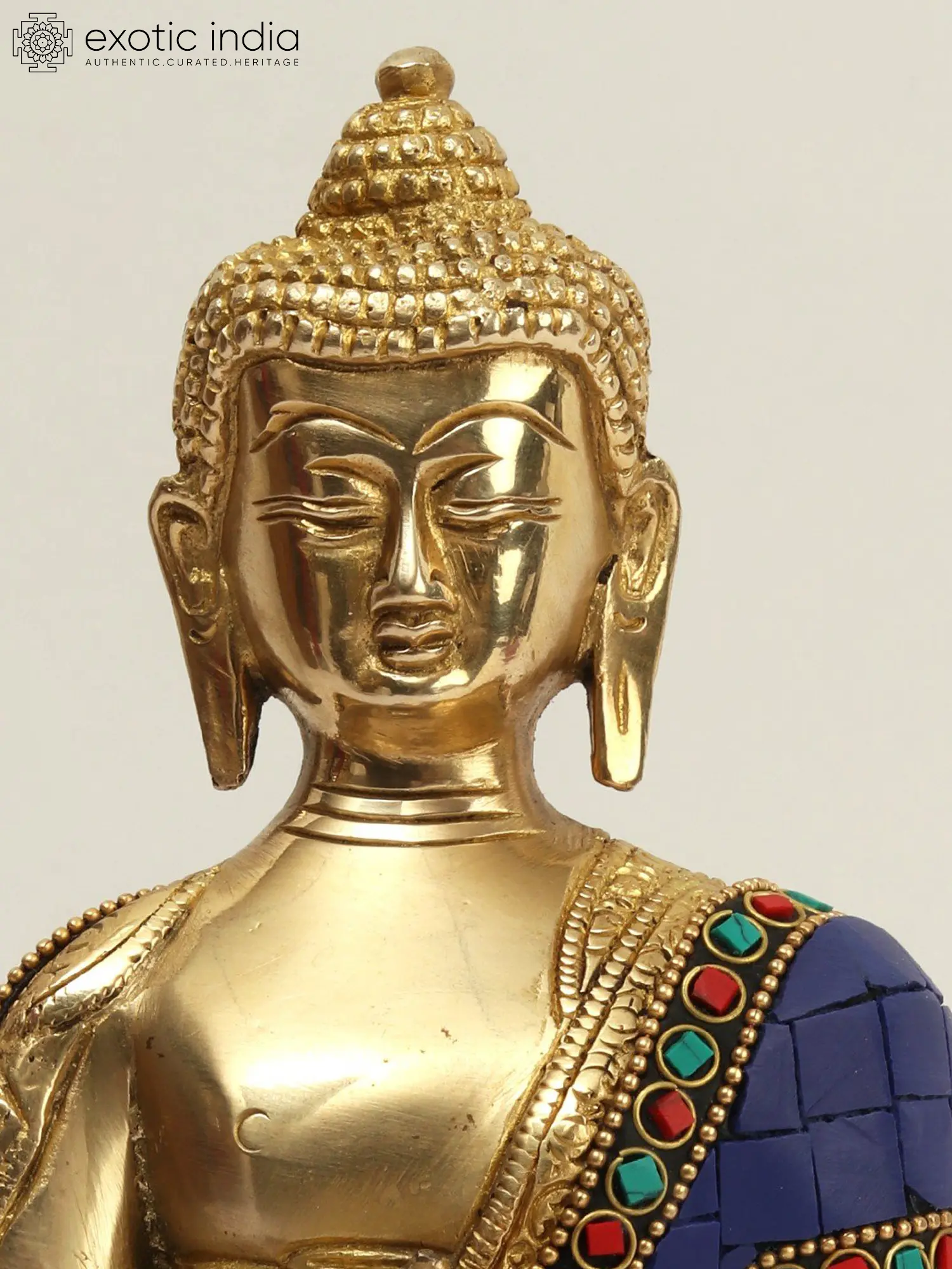 This impressive piece is a product of meticulous handcrafting in India, a land steeped in spiritual heritage and artistic tradition. Each detail, from the delicate curves of the Buddha's form to the precise inlay work of the precious stones, has been executed with devotion and skill by master artisans. The use of brass, a metal revered for its auspiciousness and durability, ensures that this statue will be a cherished companion for years to come, a beacon of healing and peace within any space it graces. Its substantial presence makes it a powerful focal point for meditation, prayer, or simply as a statement of artistic and spiritual appreciation.