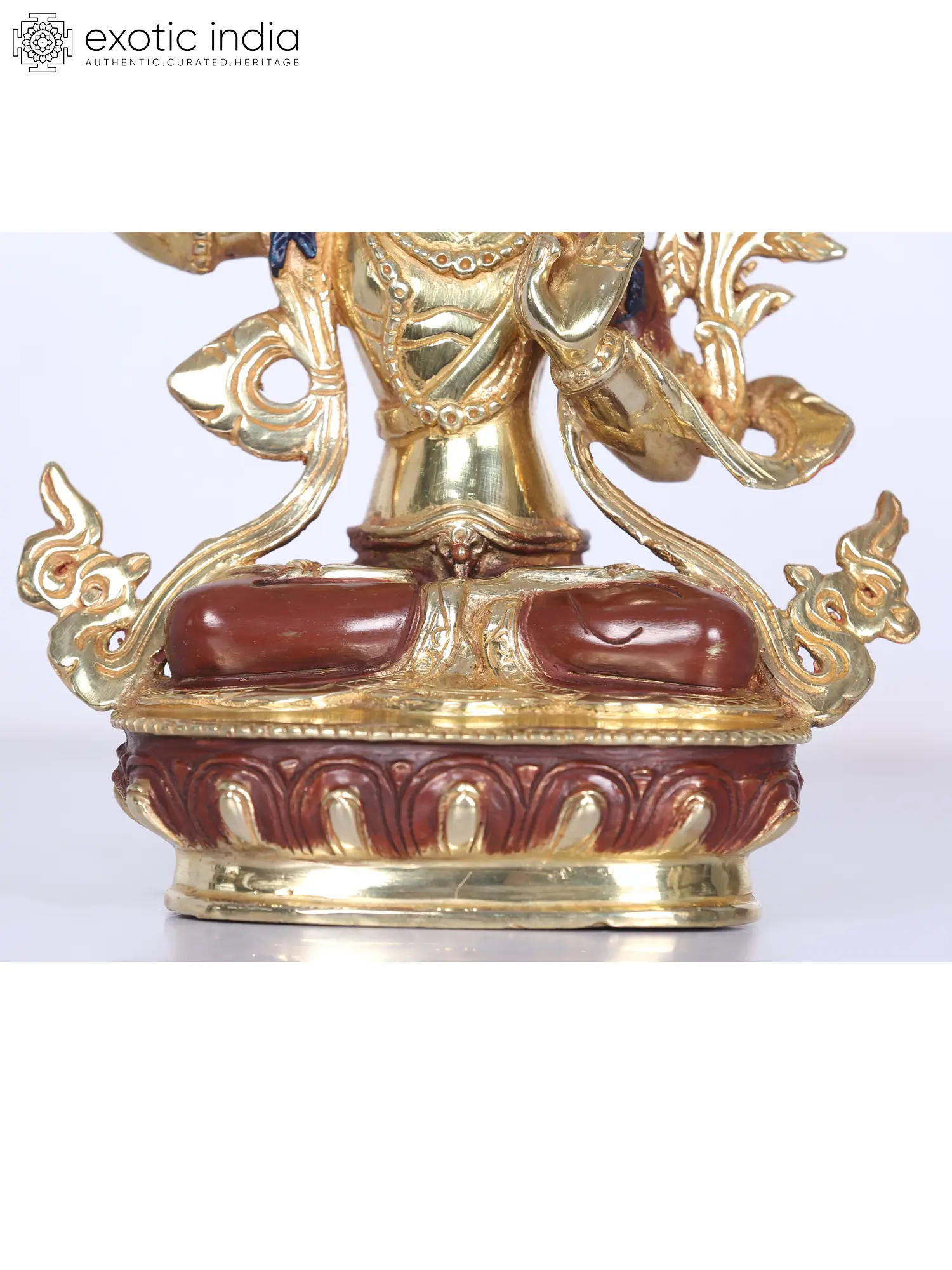 Manjushri is dressed in royal splendor and wears the regalia of transcendence—a crown, necklaces, bracelets, and earrings. The lotus, an emblem of purity and enlightenment, cradles his essence. A meditational deity in Esoteric Buddhism, Manjushri guides seekers into profound introspection. This copper sculpture gilded with gold invites believers to delve into the wisdom that pierces the core of reality.