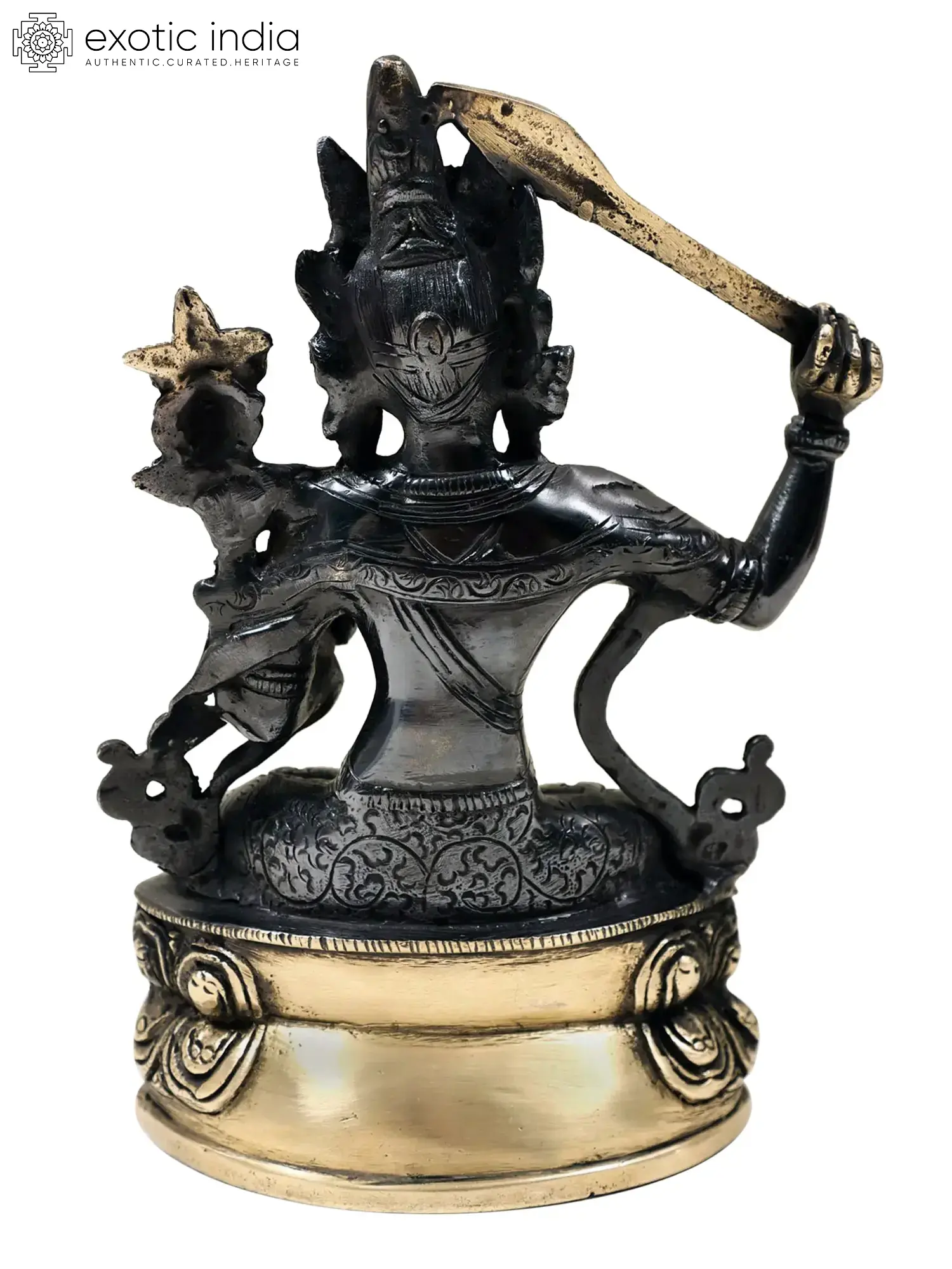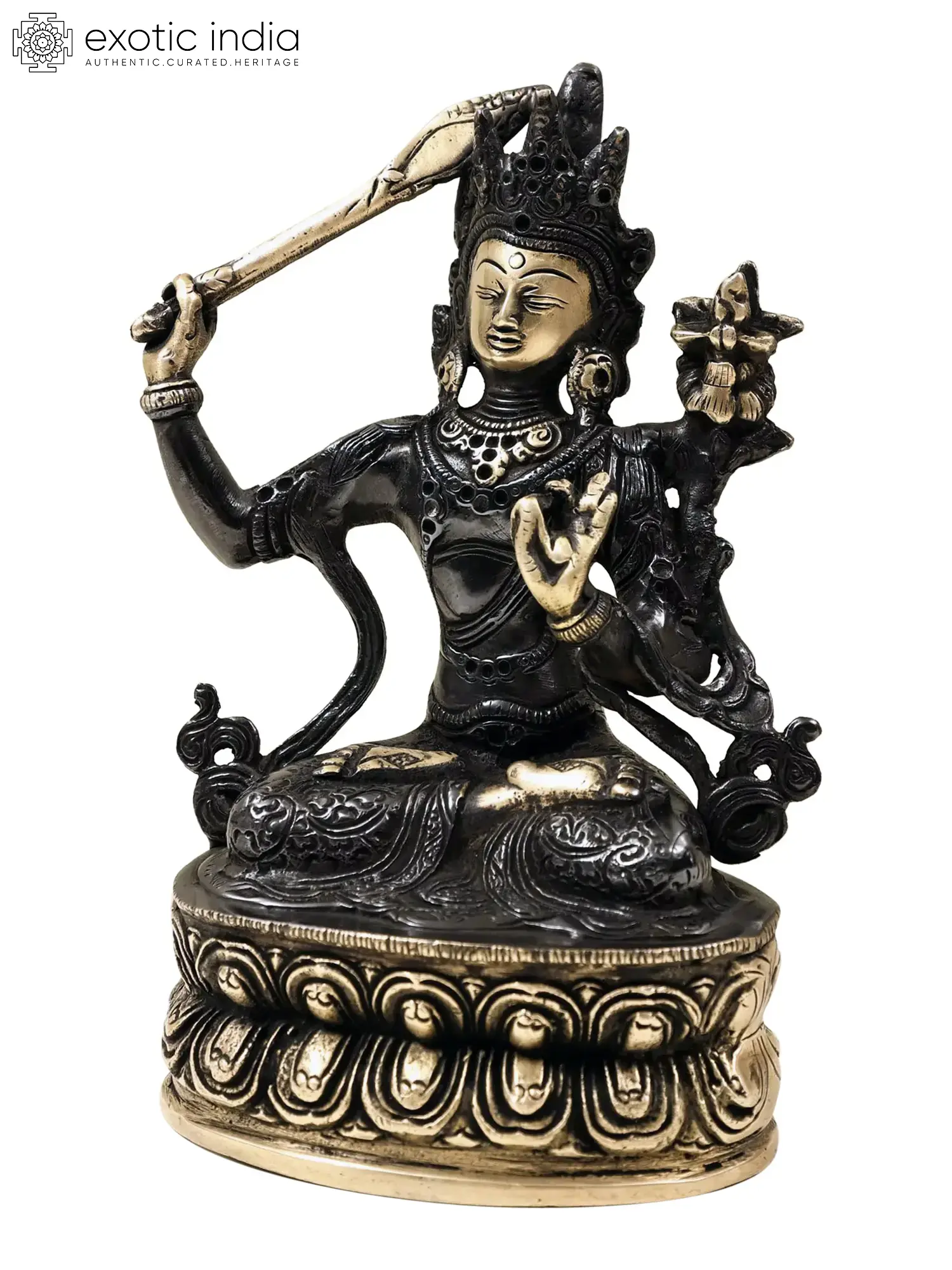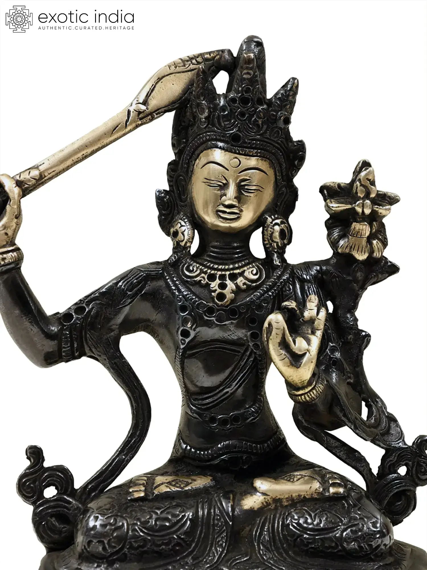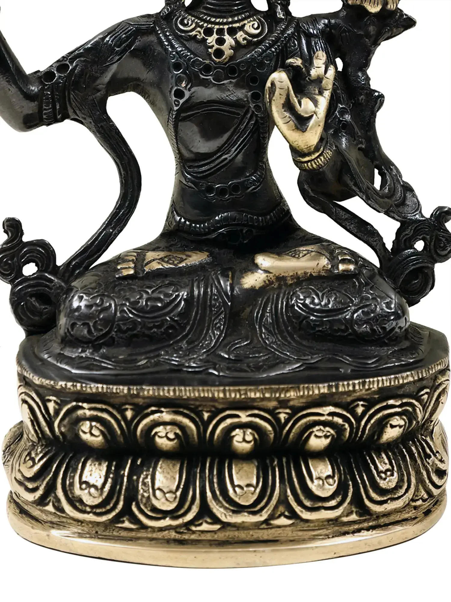Manjushri is often depicted with a flaming sword in his right hand, symbolizing the cutting through of ignorance and delusion. This sword is not for destruction, but for severing the ties of misunderstanding and revealing the truth. In his left hand, he often holds a lotus flower, representing the purity and unfolding of wisdom. The serene yet powerful expression on his face conveys a deep sense of compassion and focus. He is seated in a posture of meditation, signifying inner peace and control. The intricate details of his crown, ornaments, and the lotus base further enhance the sacred aura of the deity. The darkened patina of the brass, contrasted with the golden highlights, adds depth and texture, suggesting the ancient lineage and profound teachings he represents. –––––––––––––––––––
