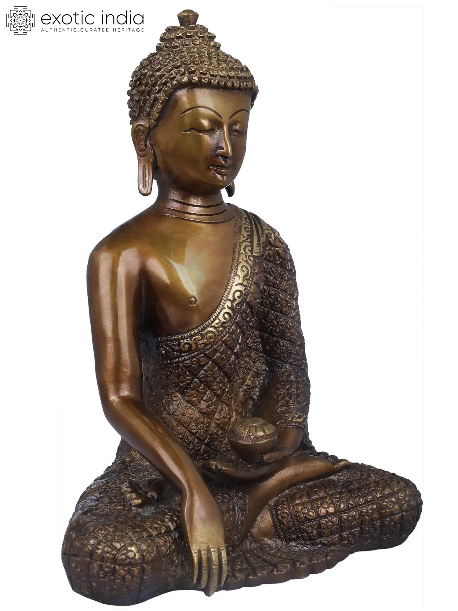 Each aspect of this statue, from the delicate folds of the sanghati (monastic robe) to the tranquil expression on the Buddha's face, speaks of the dedication and artistry involved in its creation. Handmade in India, a land steeped in spiritual heritage and artistic tradition, this piece carries the imprint of generations of craftsmanship. The meticulous attention to detail in rendering the textures and patterns of the robes, and the subtle yet powerful expression of inner peace, make this a truly remarkable work of art. Whether placed in a personal sanctuary, a meditation space, or a living area, this Shakyamuni Buddha statue serves as a constant reminder of the path to liberation and the enduring power of compassion.