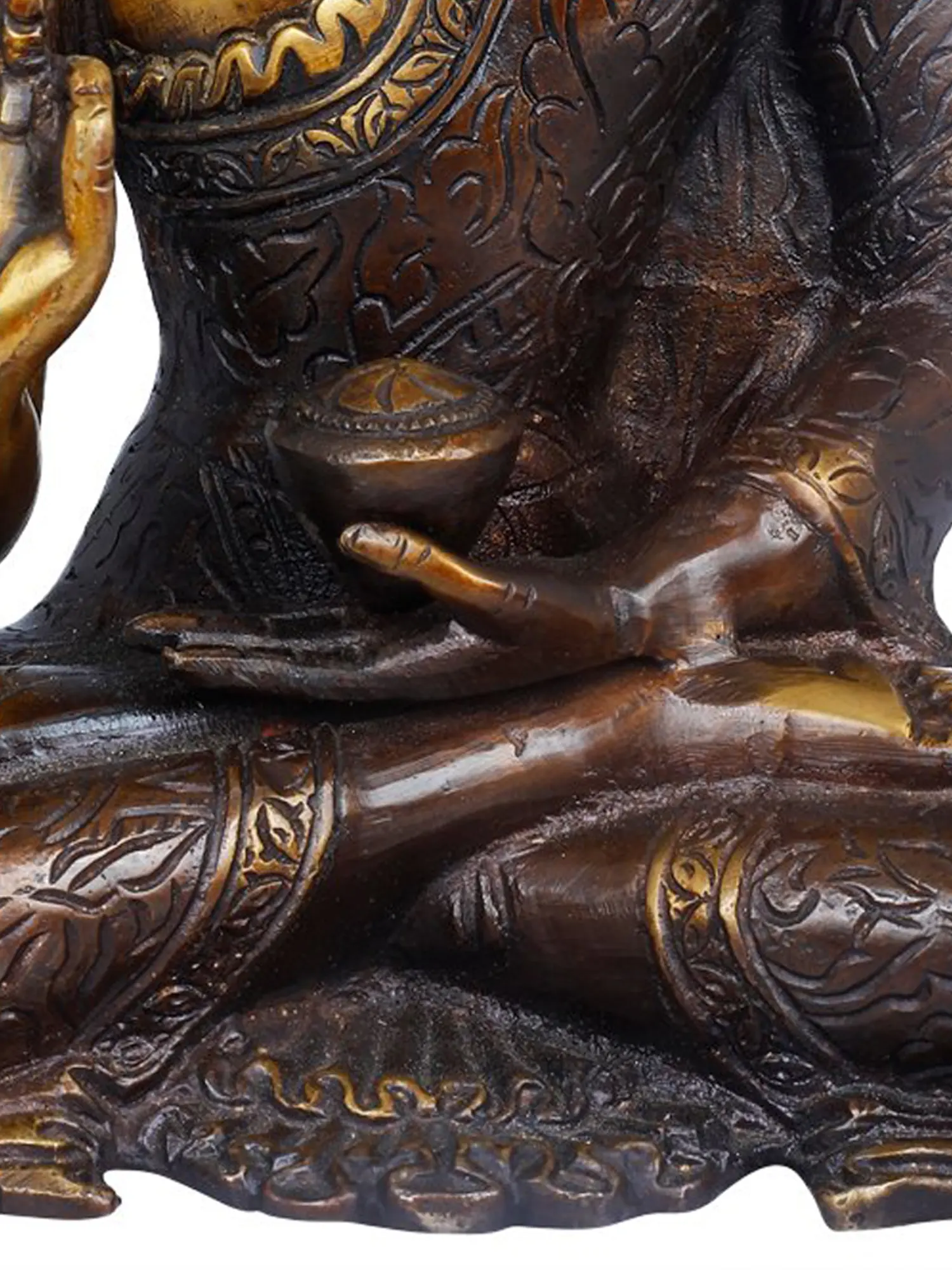 This exquisite brass statue captures the serene and compassionate essence of Shakyamuni Buddha, the historical figure who achieved enlightenment and founded Buddhism. Crafted with meticulous detail by skilled artisans in India, this piece is more than just a decorative object; it is a gateway to contemplation and spiritual inspiration. The rich, lustrous brass, expertly patinated, lends an aura of antiquity and profound wisdom to the representation. The Buddha is depicted in a classic seated posture, with legs crossed in the lotus position, symbolizing stability and inner peace. His posture, known as the *vitarka mudra*, with the right hand raised in a gesture of teaching and reassurance, invites viewers to absorb his wisdom and find clarity. ––––––––––––––––––––