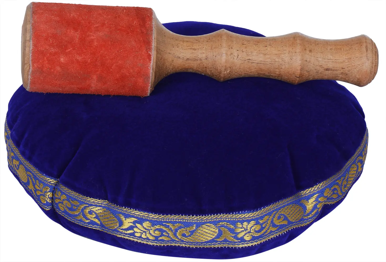 This singing bowl is not limited to monastic settings. It is a powerful tool for anyone seeking to cultivate mindfulness, reduce stress, or simply create a more peaceful environment. When struck or played around the rim with the accompanying striker, it emits a rich, sustained tone that vibrates not only through the air but also through the very being of those who listen. This ethereal sound can help quiet the restless mind, promoting a state of deep relaxation and focused awareness. It is perfect for personal meditation, yoga sessions, sound healing practices, or as a beautiful and meaningful decorative piece that brings a touch of spiritual serenity to your home. The accompanying plush cushion, in a vibrant royal blue and adorned with a traditional gold brocade, not only provides a stable and elegant resting place for the bowl but also enhances its aesthetic appeal, hinting at the richness and vibrancy of spiritual traditions. Whether you are a seasoned practitioner or new to the world of meditation, this Tibetan Singing Bowl offers a tangible connection to ancient wisdom and a pathway to profound inner calm.