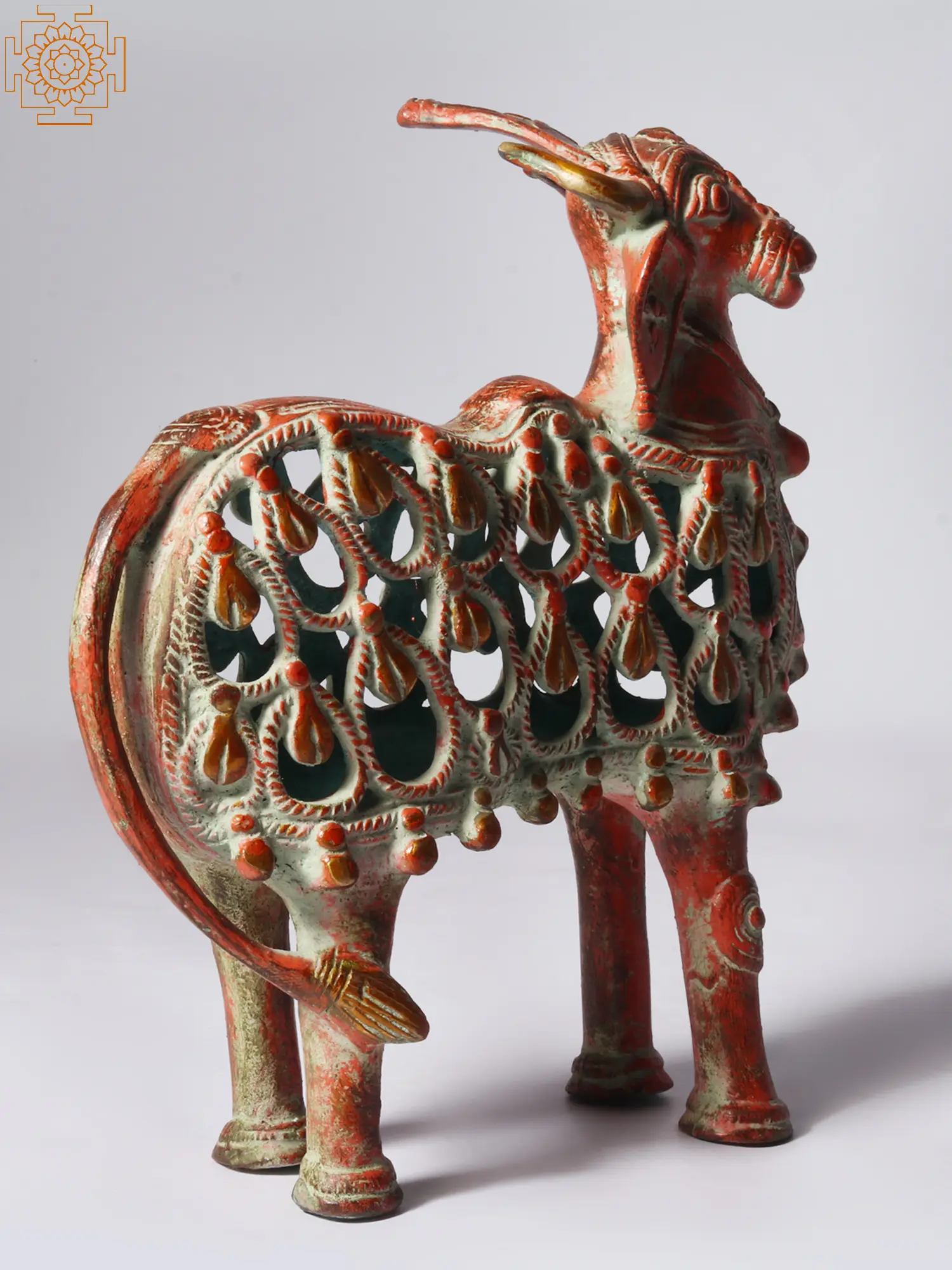This exquisite brass statue captures the essence of the cow, a creature revered across numerous cultures and mythologies. The cow is more than just an animal; it is a symbol of abundance, motherhood, life-giving nourishment, and divine generosity. In many traditions, it is considered a sacred creature, representing prosperity and the bounty of the earth. This piece, crafted with meticulous detail, embodies this profound symbolism, making it a captivating addition to any home or sacred space. The artistry of this statue is evident in its tribal aesthetic, which speaks to ancient traditions and a deep connection with nature. The intricate lattice work, reminiscent of ceremonial adornments worn during festivals and rituals, highlights the skilled craftsmanship involved. Each opening in the pattern reveals a glimpse of the inner form, creating a dynamic play of light and shadow that adds depth and character. The carefully placed beads and dangling ornaments further enhance its decorative appeal, suggesting the adornment of a prized animal participating in a significant cultural event. The choice of brass as the medium is significant. Brass, an alloy of copper and zinc, is known for its durability, luster, and its association with prosperity and positive energy in many cultures. The aged patina, with its hints of red and turquoise, lends a sense of timelessness and authenticity to the sculpture, evoking the feeling of an ancient artifact unearthed from a forgotten era. The warm metallic tones are beautifully complemented by the rustic, earthy colors, creating a visual narrative of heritage and spiritual significance. The cow, particularly in Vedic traditions, is often linked to the goddess Surabhi, the celestial cow that fulfills all desires. Surabhi is also known as Kamadhenu, the mother of all cows, who emerged from the ocean during the cosmic churning. This statue can be seen as a tribute to this divine lineage, bringing a sense of peace, prosperity, and spiritual well-being into your environment. It is a piece that not only enriches your decor but also serves as a constant reminder of the interconnectedness of life and the blessings of the divine.