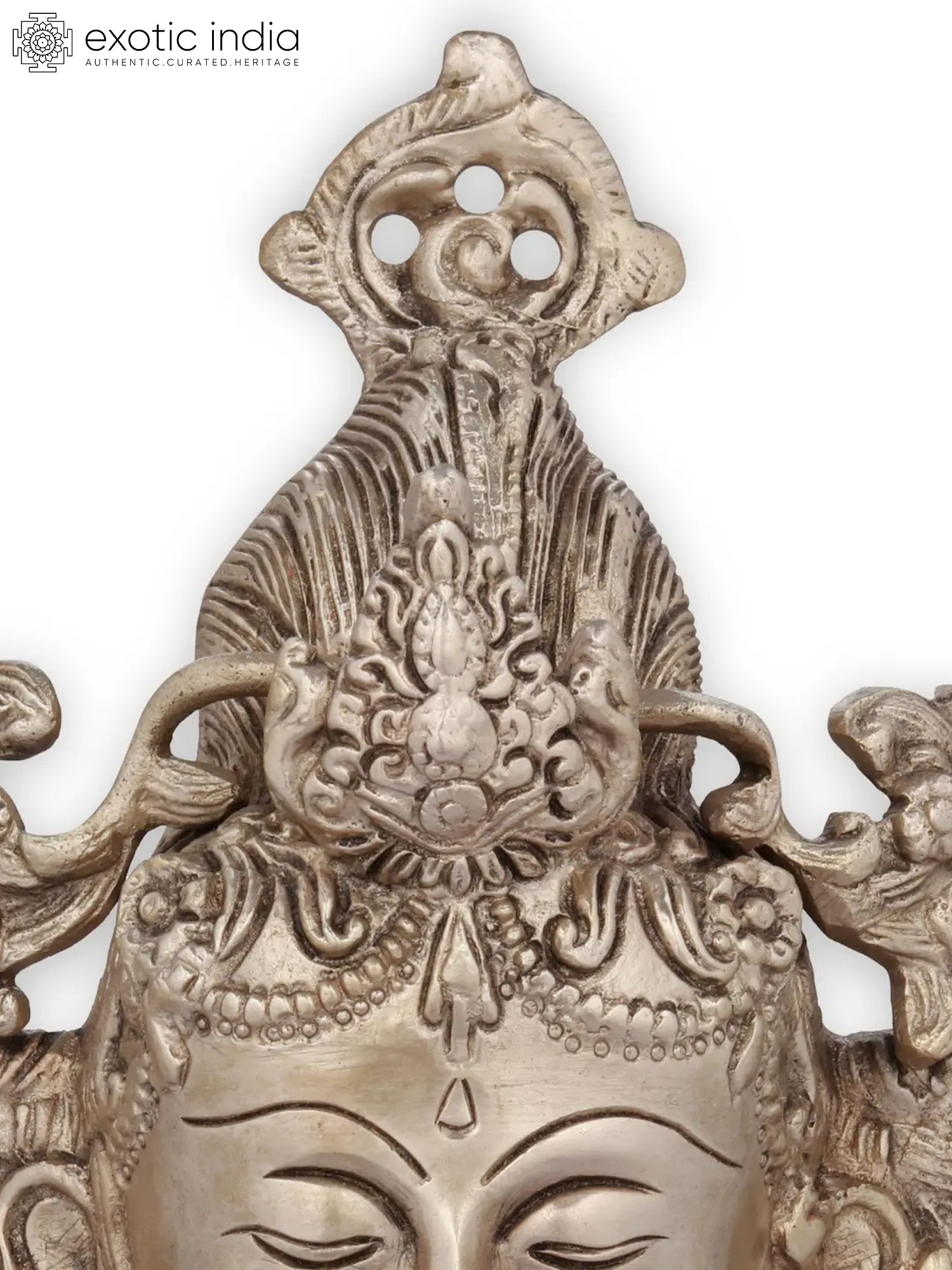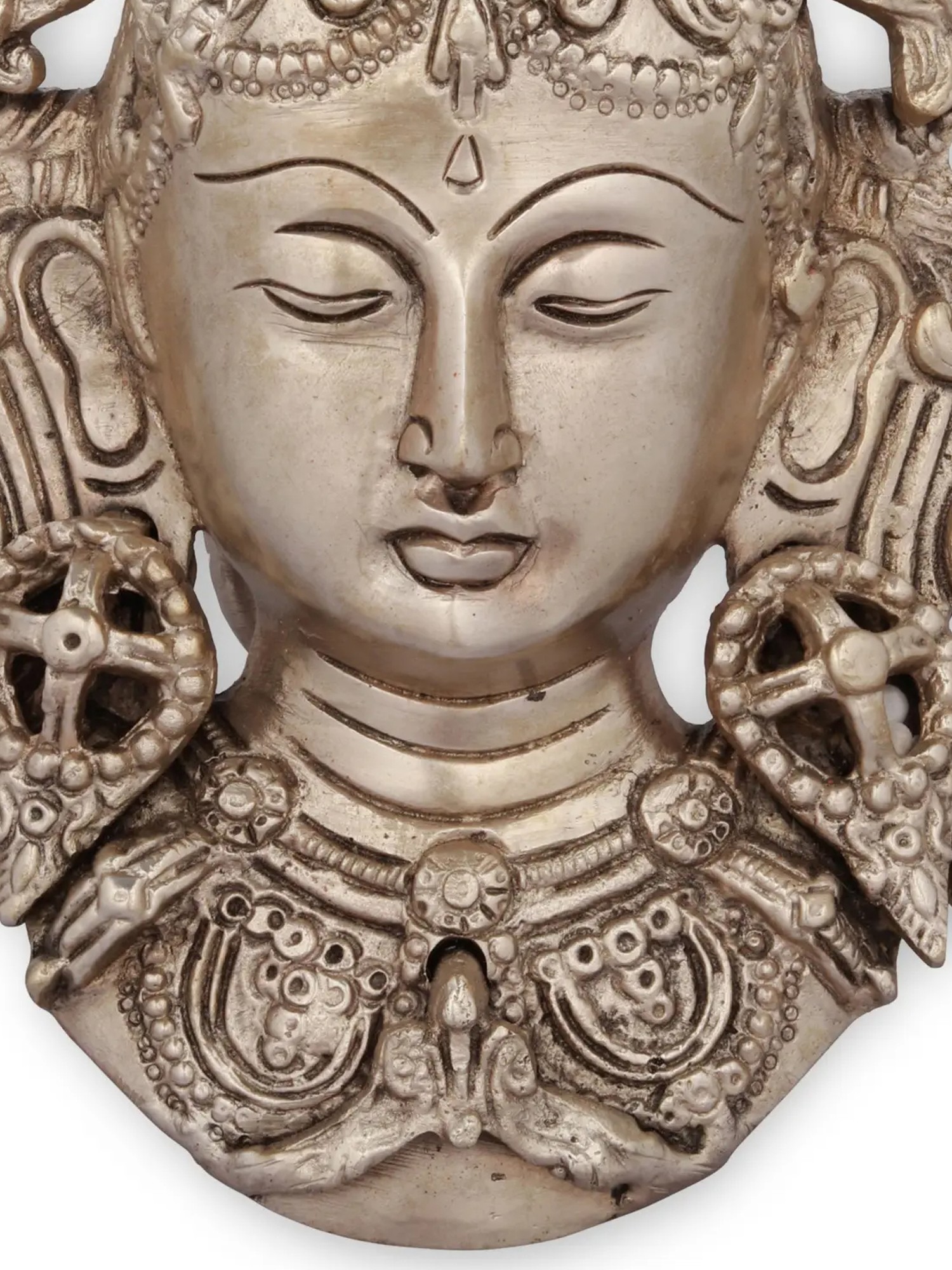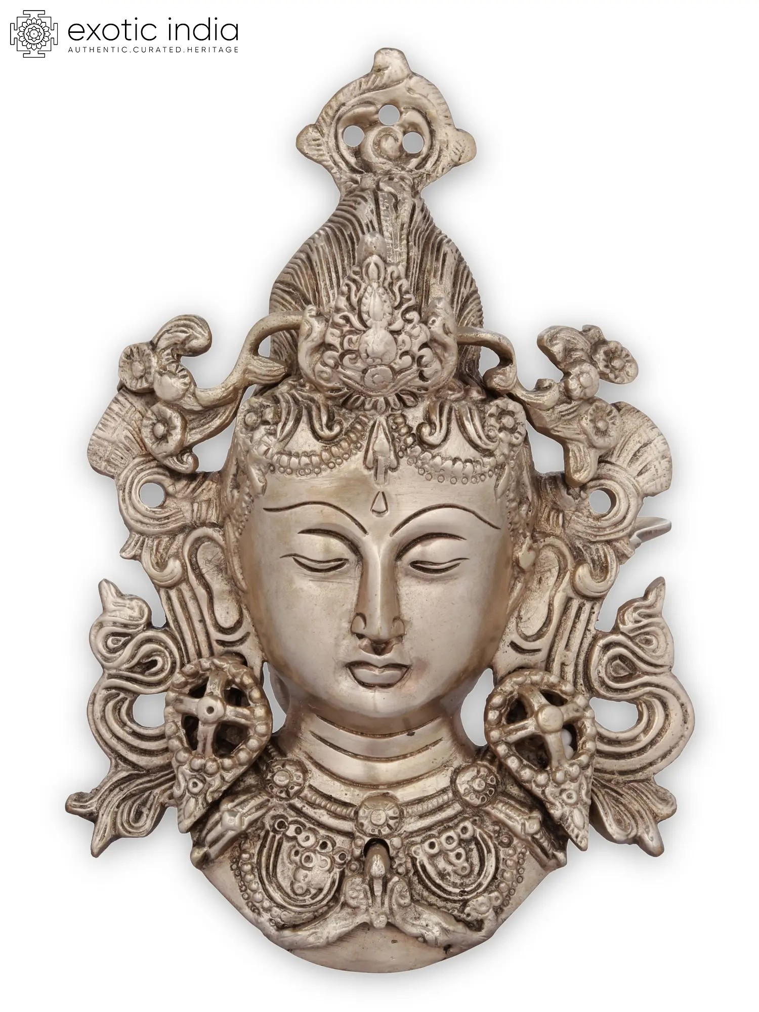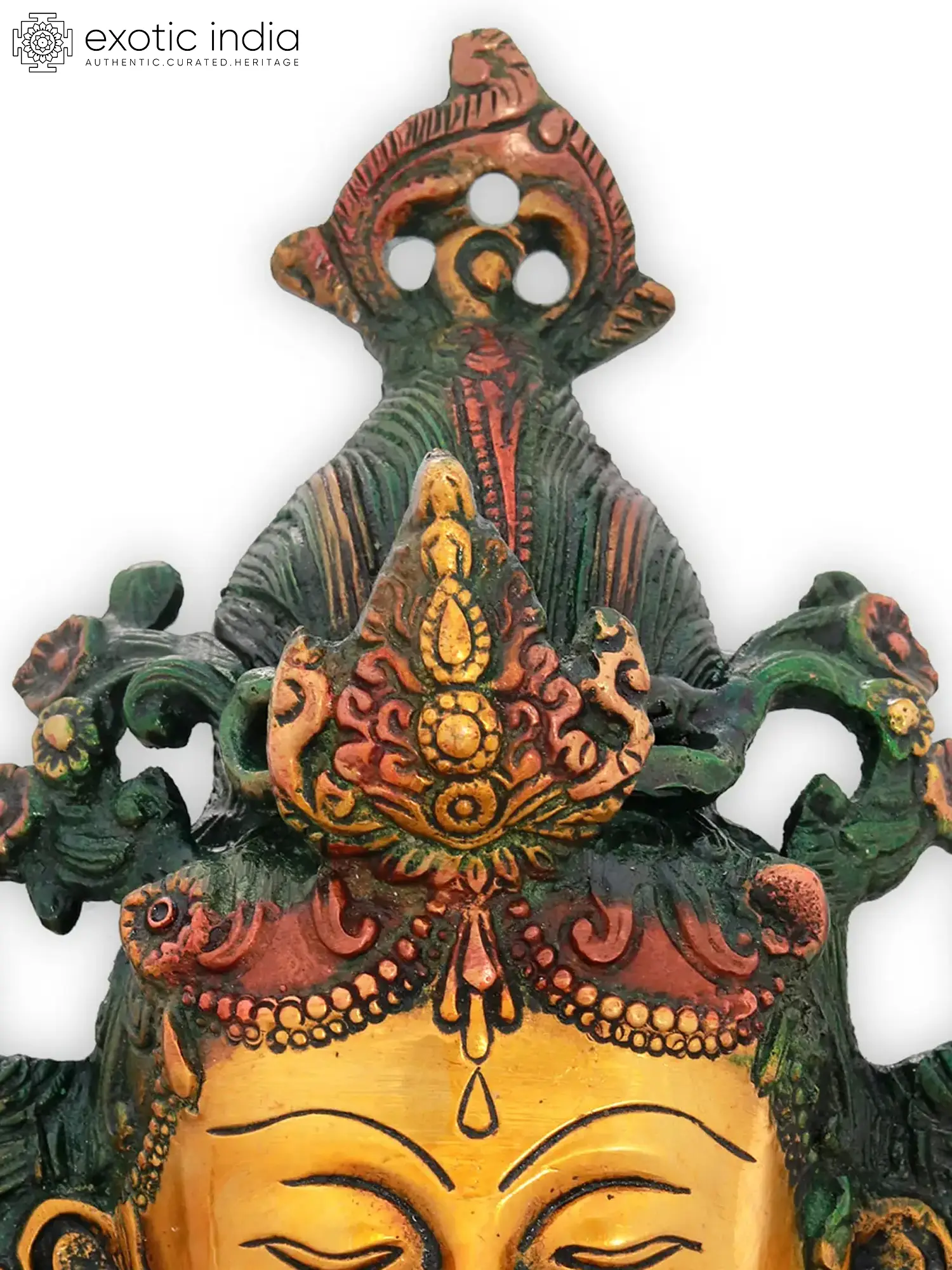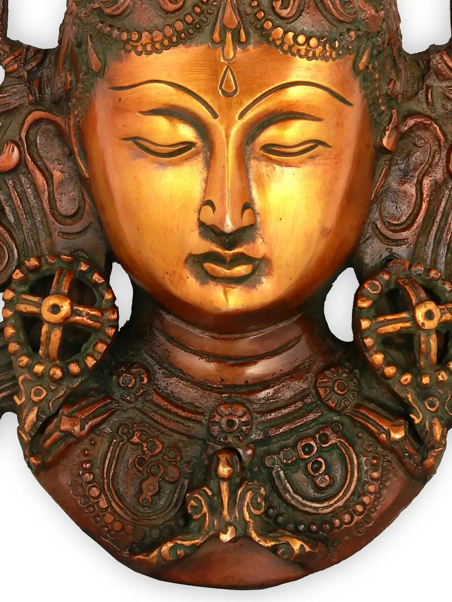 Embrace the spiritual energy and wisdom of Tara, the Tibetan Buddhist deity, with our finely crafted brass wall-hanging mask. Handmade with deep respect in India, this artwork embodies the essence of compassion, protection, and wisdom, central to Tibetan Buddhist philosophy. As you gaze upon the mask, you'll appreciate the intricate details that convey Tara's serene countenance and the symbolism in every aspect of her form. Tara's role as the protector and guide is central to Tibetan Buddhist philosophy, and this wall hanging serves as a constant reminder of compassion, wisdom, and the path to spiritual enlightenment.
