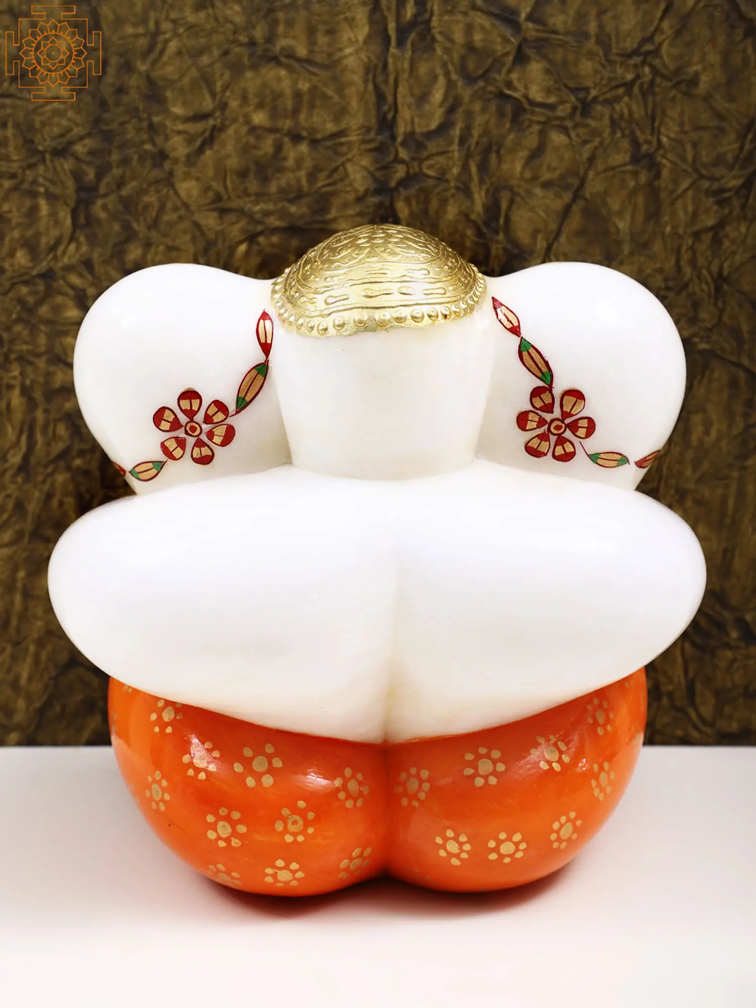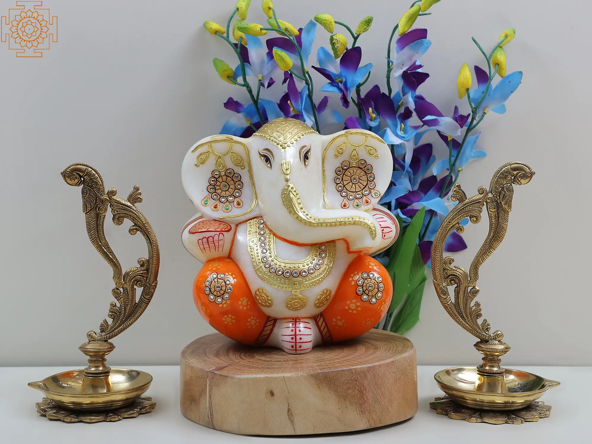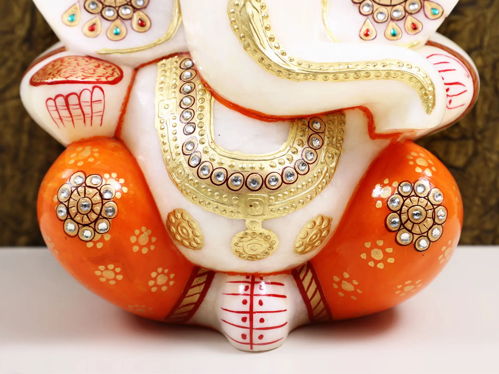 This exquisite statue showcases the unparalleled skill of our artisans. Each detail, from the gentle curve of Ganesha's trunk to the intricate ornamentation adorning his body, is brought to life with remarkable precision. The pristine white marble serves as a perfect canvas, highlighting the delicate golden brushstrokes and the sparkling embellishments that mimic precious jewels. The vibrant orange hues painted on his garments add a touch of warmth and regality, creating a harmonious blend of colors that is both sophisticated and captivating. This handmade creation is a true masterpiece, destined to become a cherished centerpiece in your sacred space or a distinguished addition to your collection of fine art.
