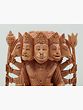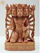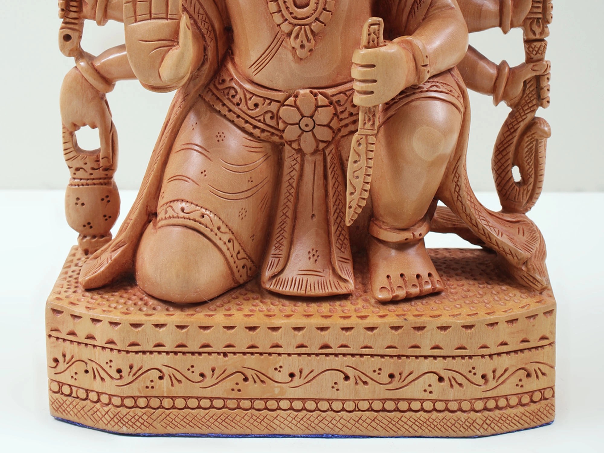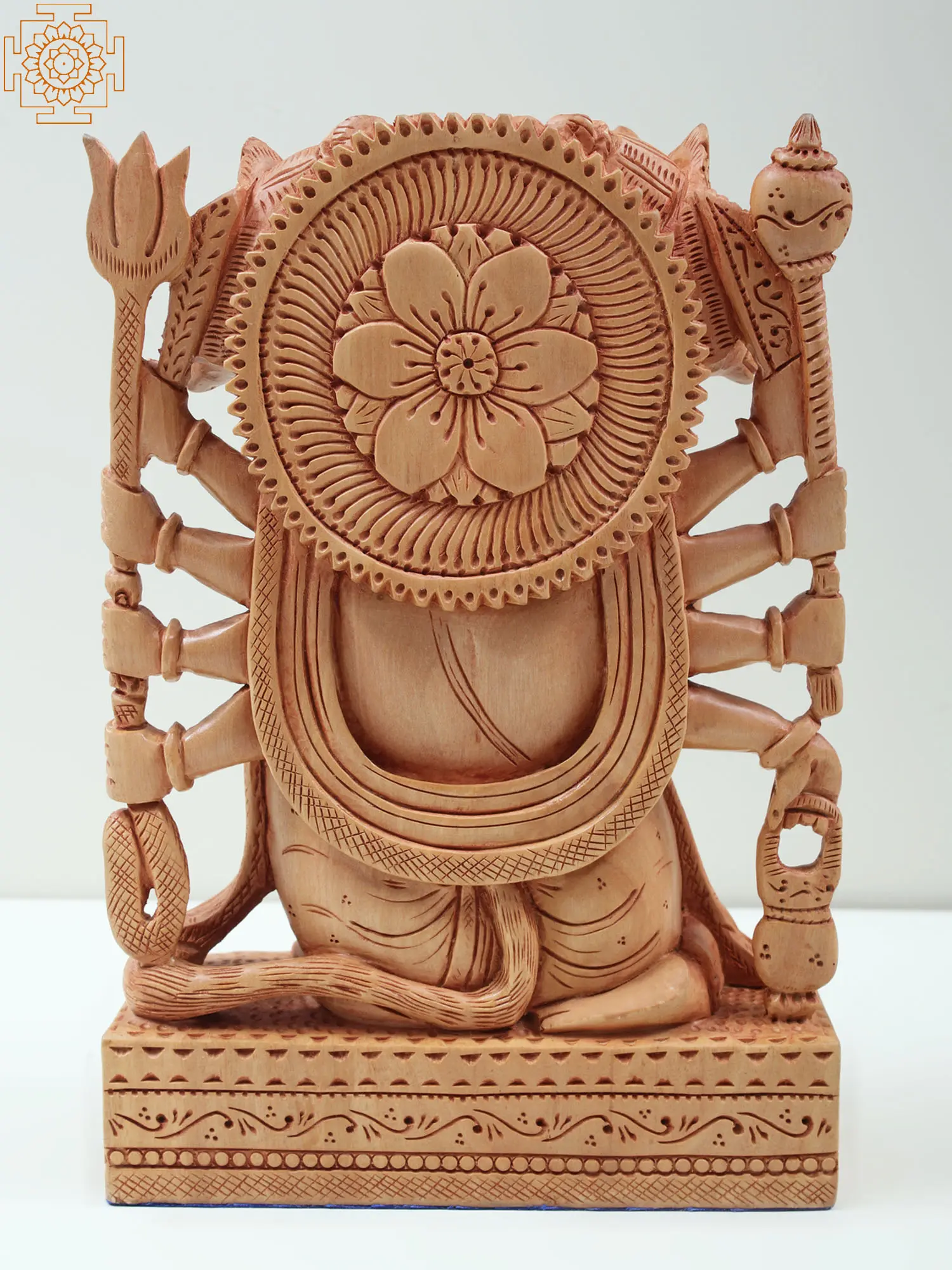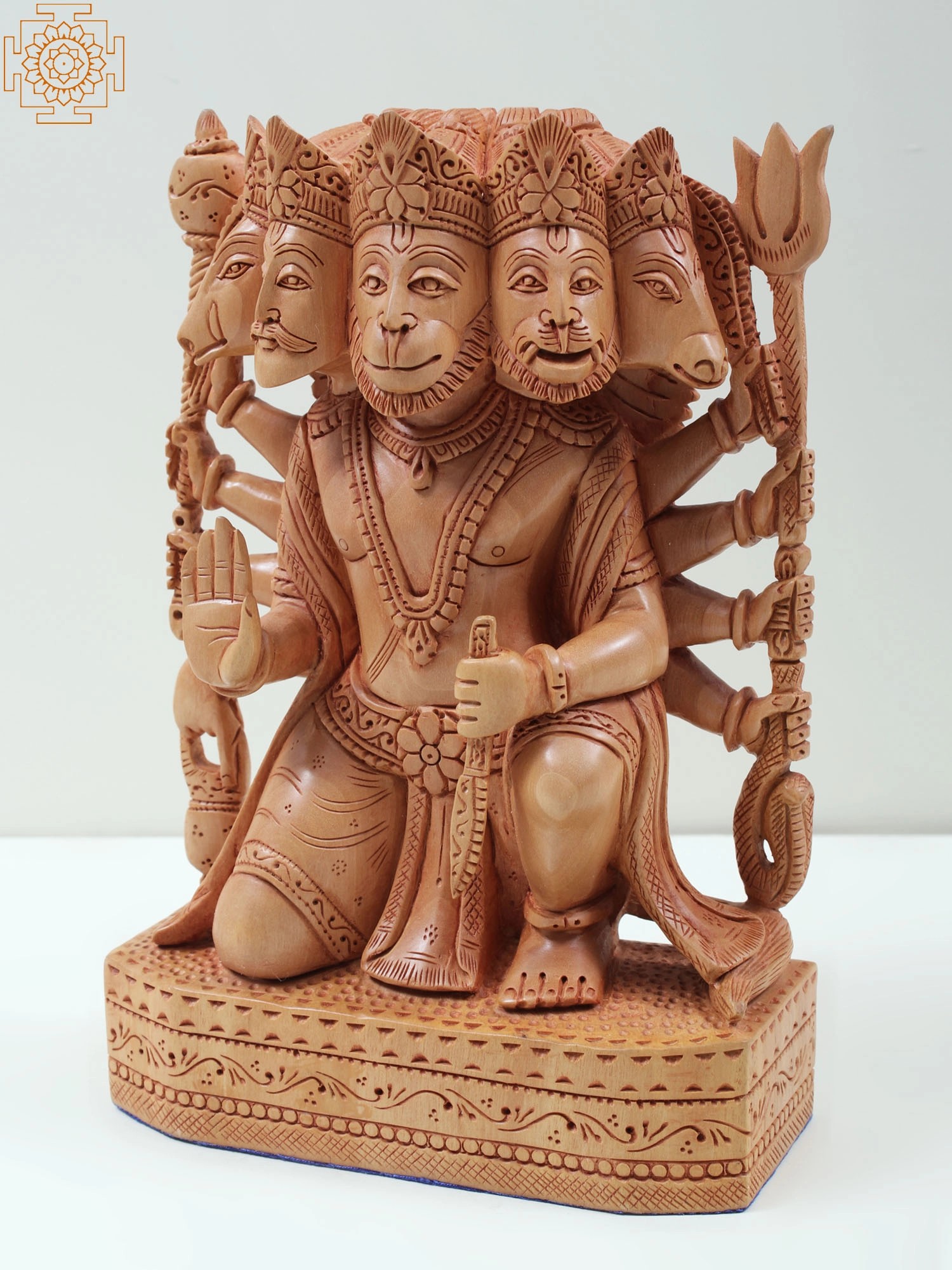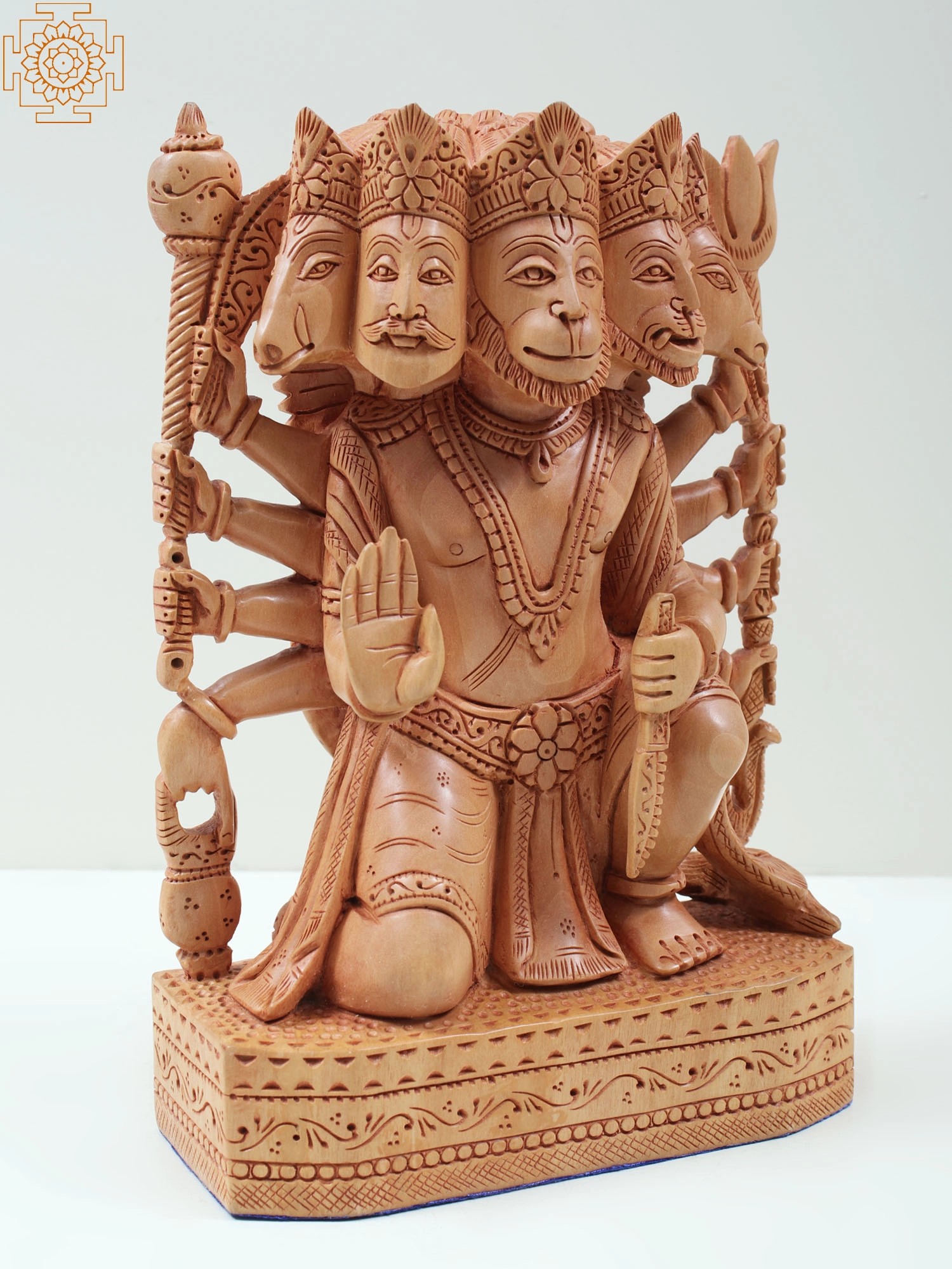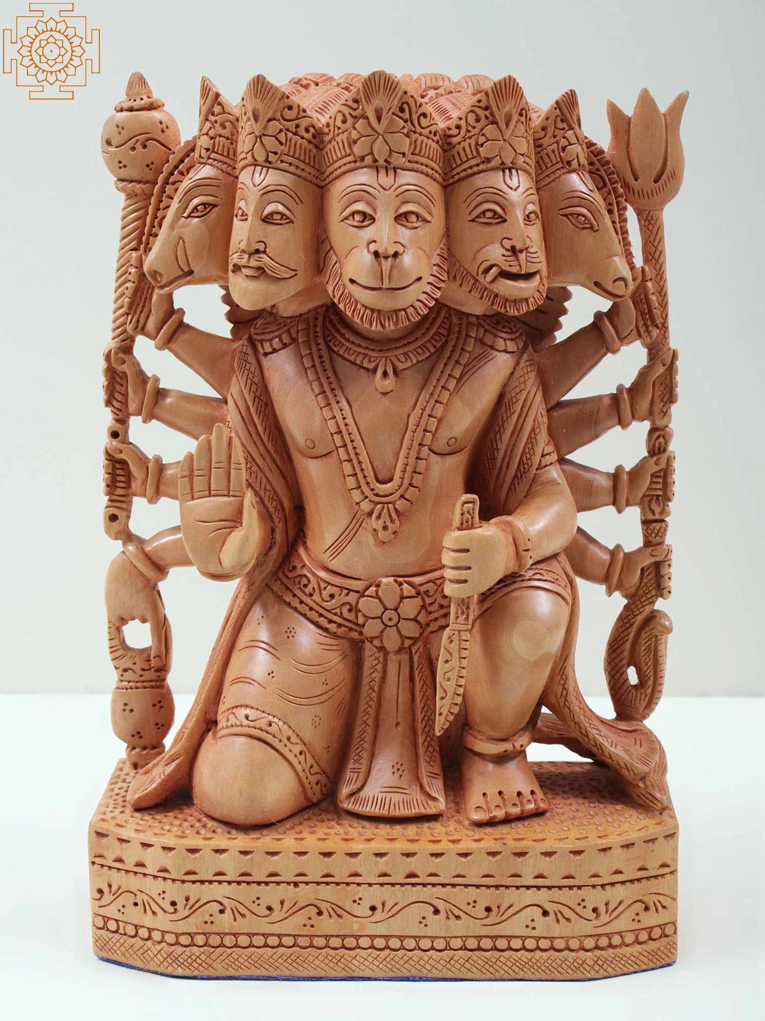 Carved from high-quality Kadam wood, this statue showcases the intricate artistry of traditional wood carving. The rich, warm tones of the wood lend a natural elegance to the piece, highlighting the detailed rendering of each face, the multiple arms holding various divine weapons and symbols, and the ornate clothing and adornments. The artist's skill is evident in the delicate expressions on each face and the dynamic posture of Lord Hanuman, suggesting his readiness to act. The base of the statue is also meticulously carved with traditional motifs, adding to its overall aesthetic appeal and spiritual resonance. In Hindu mythology, Panchamukhi Hanuman is invoked for protection against negative energies, black magic, and unforeseen dangers. He is also a patron of strength, courage, and success in all endeavors. Devotees believe that worshipping this form can bestow immense courage, help overcome challenges, and lead to spiritual enlightenment. This beautifully crafted representation serves not only as a decorative piece but also as a powerful spiritual artifact, bringing blessings and a sense of divine presence into your home or sacred space. Its compact size makes it suitable for placement on altars, shelves, or desks, allowing you to keep the divine energy of Panchamukhi Hanuman close.