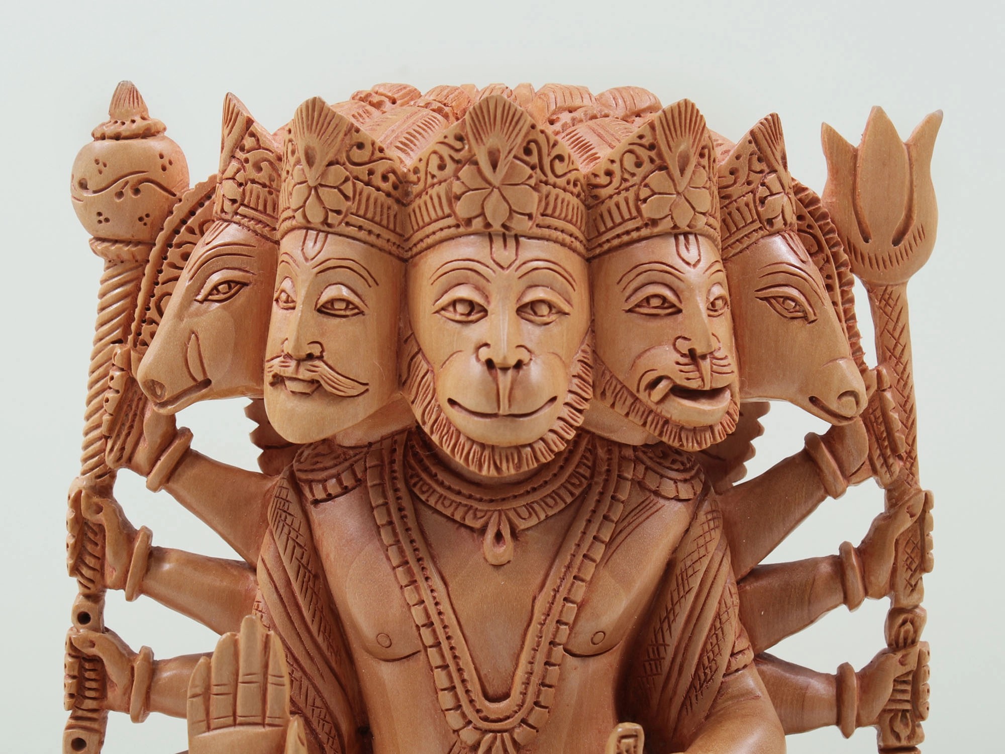 This exquisite Kadam wood carving depicts the revered Panchamukhi Hanuman, a divine form embodying immense power, devotion, and protection. Hanumana, the devoted servant of Lord Rama, is a central figure in the epic Ramayana, celebrated for his unwavering loyalty, courage, and miraculous abilities. The Panchamukhi form, with its five faces, represents his multifaceted prowess and mastery over various aspects of life and spiritual growth. Each face is said to bestow specific blessings and ward off different evils. The central face, that of Lord Hanuman himself, gazes forward with calm determination, radiating peace and strength. To its left, the Garuda face, the mythical eagle, symbolizes the power to overcome diseases and poisons. The Narasimha face, a fierce incarnation of Lord Vishnu, stands for courage and the destruction of fear. The Varaha face, the divine boar, signifies victory over obstacles and the ability to manifest abundance. Finally, the Hayagriva face, a form of Vishnu with a horse's head, represents ultimate knowledge and wisdom.