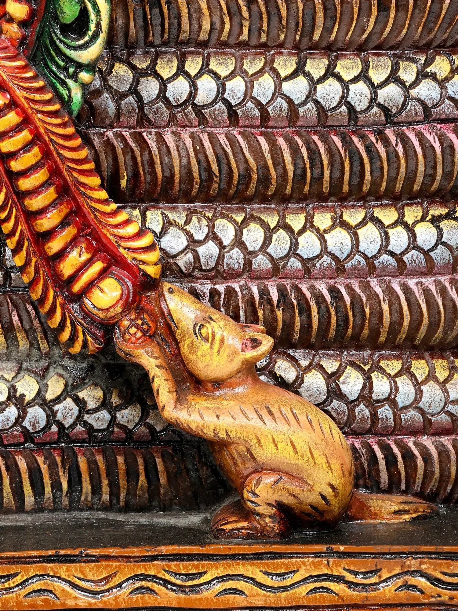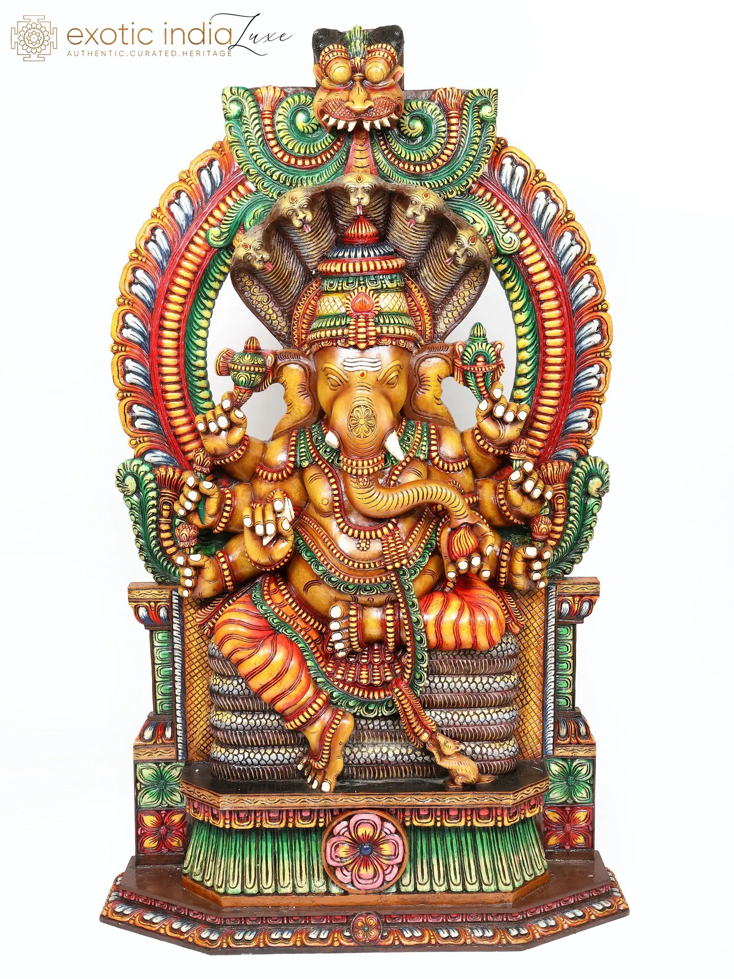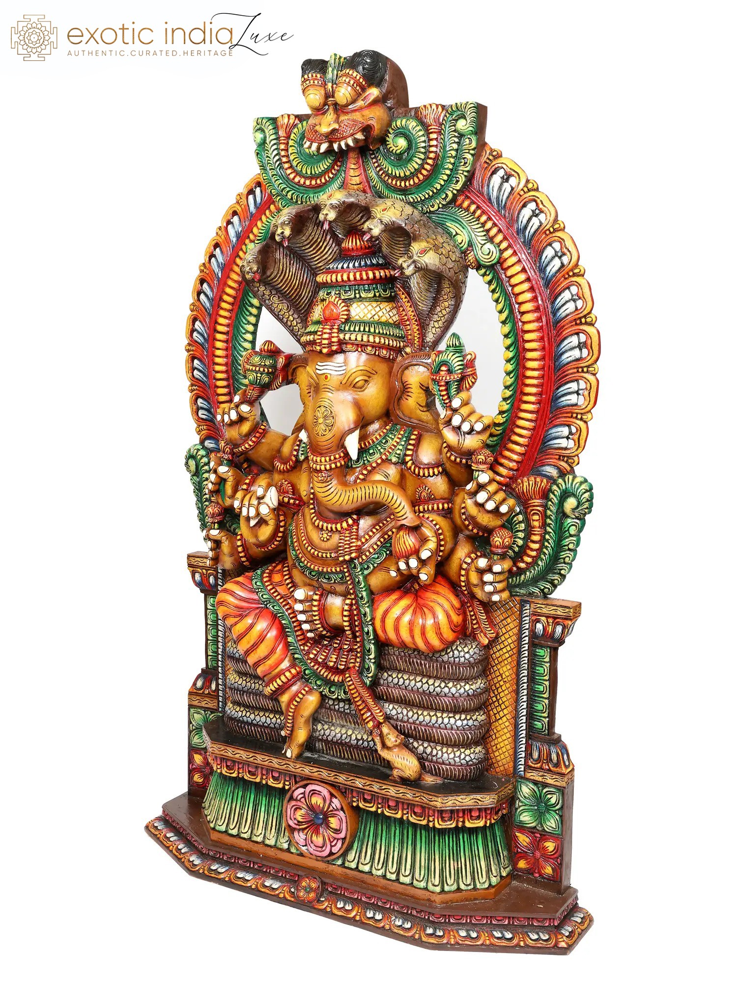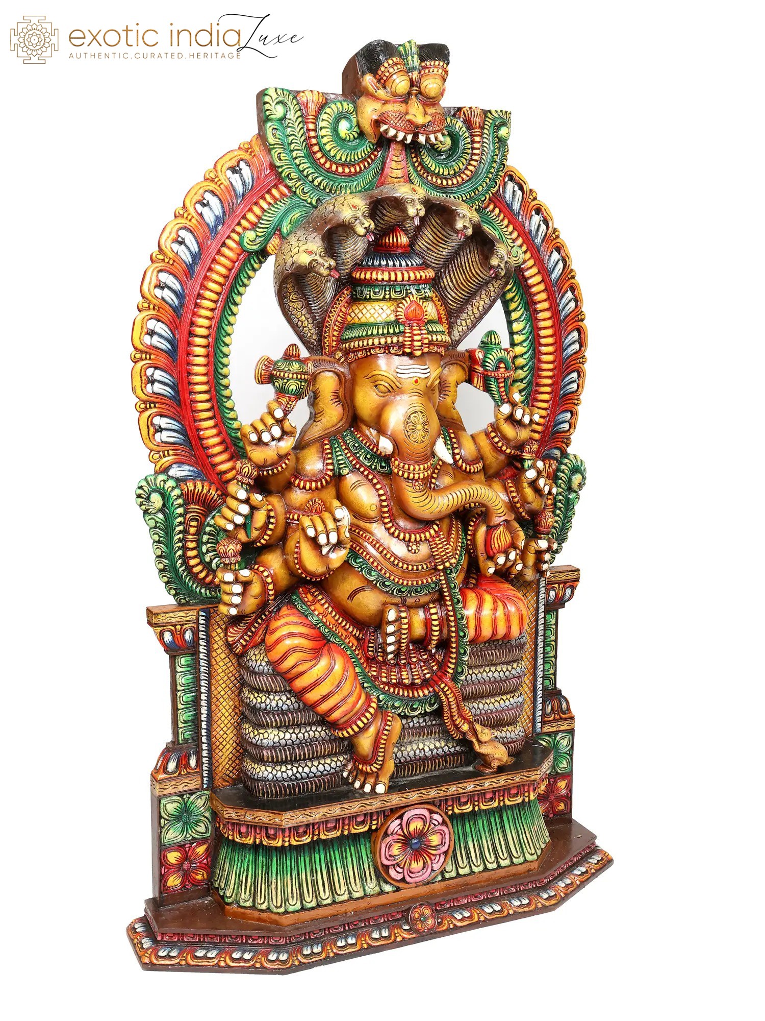 This magnificent statue is meticulously carved from Vaagai wood, renowned for its durability and rich, warm tones. Vaagai wood is a sustainable resource native to Southern India, adding to the statue’s cultural significance. The artisans behind this piece have poured their hearts and souls into its creation, employing centuries-old techniques passed down through generations. Every curve, every detail, reflects the skill and dedication involved in producing such a stunning work of art. The richly colored paints further enhance the intricate carving and highlight the exquisite detail in the portrayal of Ganesha's divine form and the Kirtimukha throne. This piece is not merely a statue; it's a living testament to the enduring spirit of traditional Indian artistry.