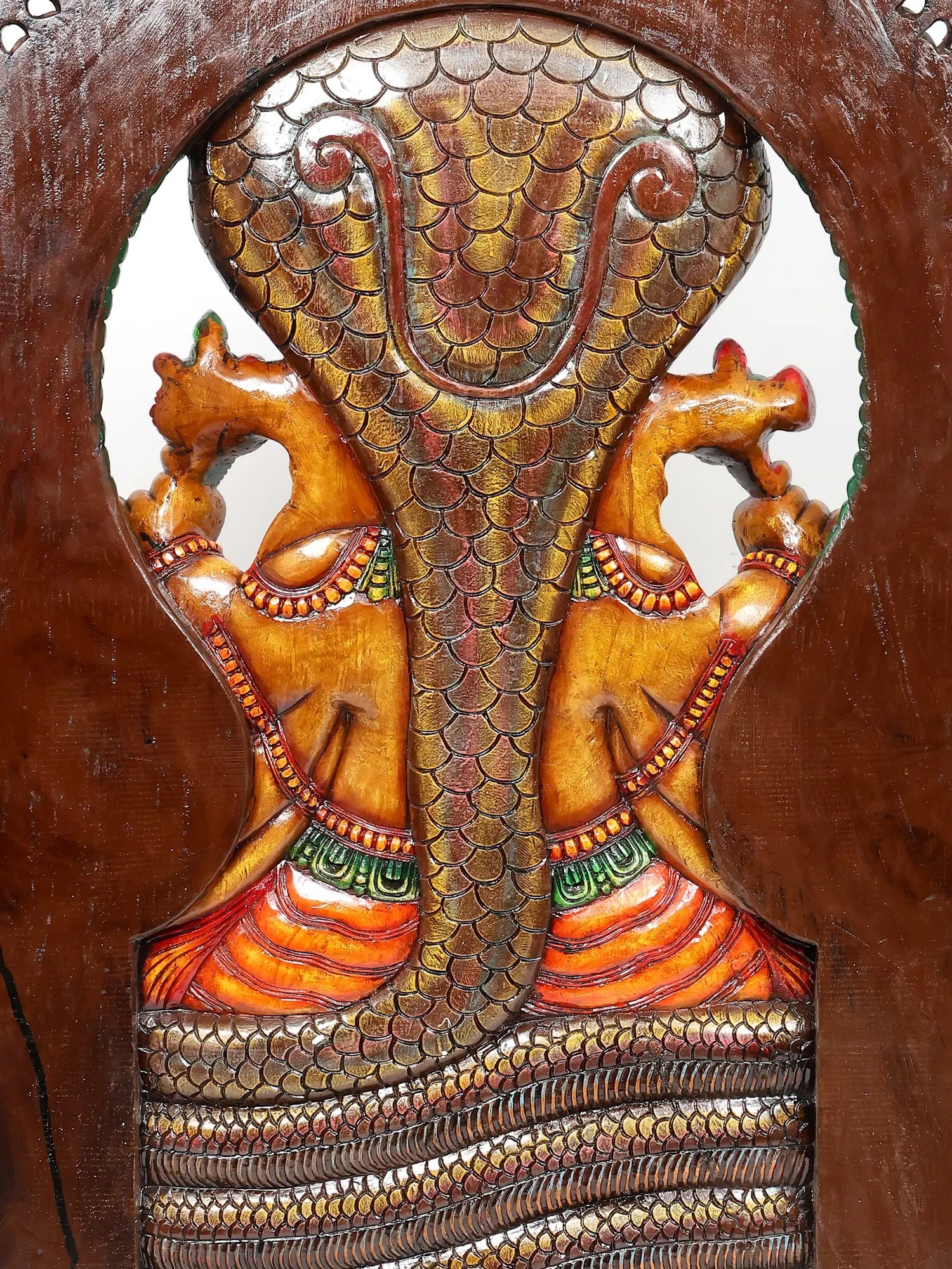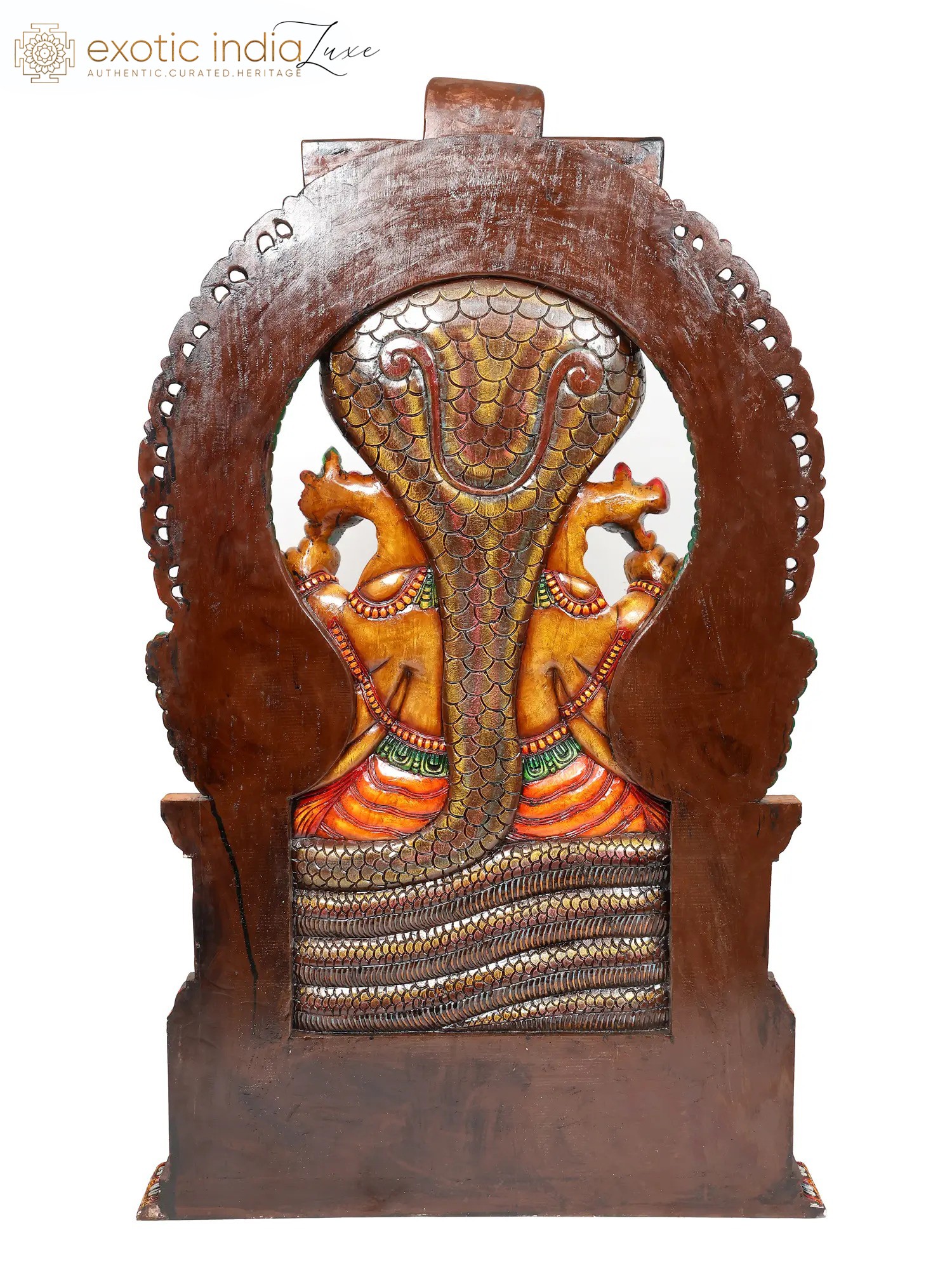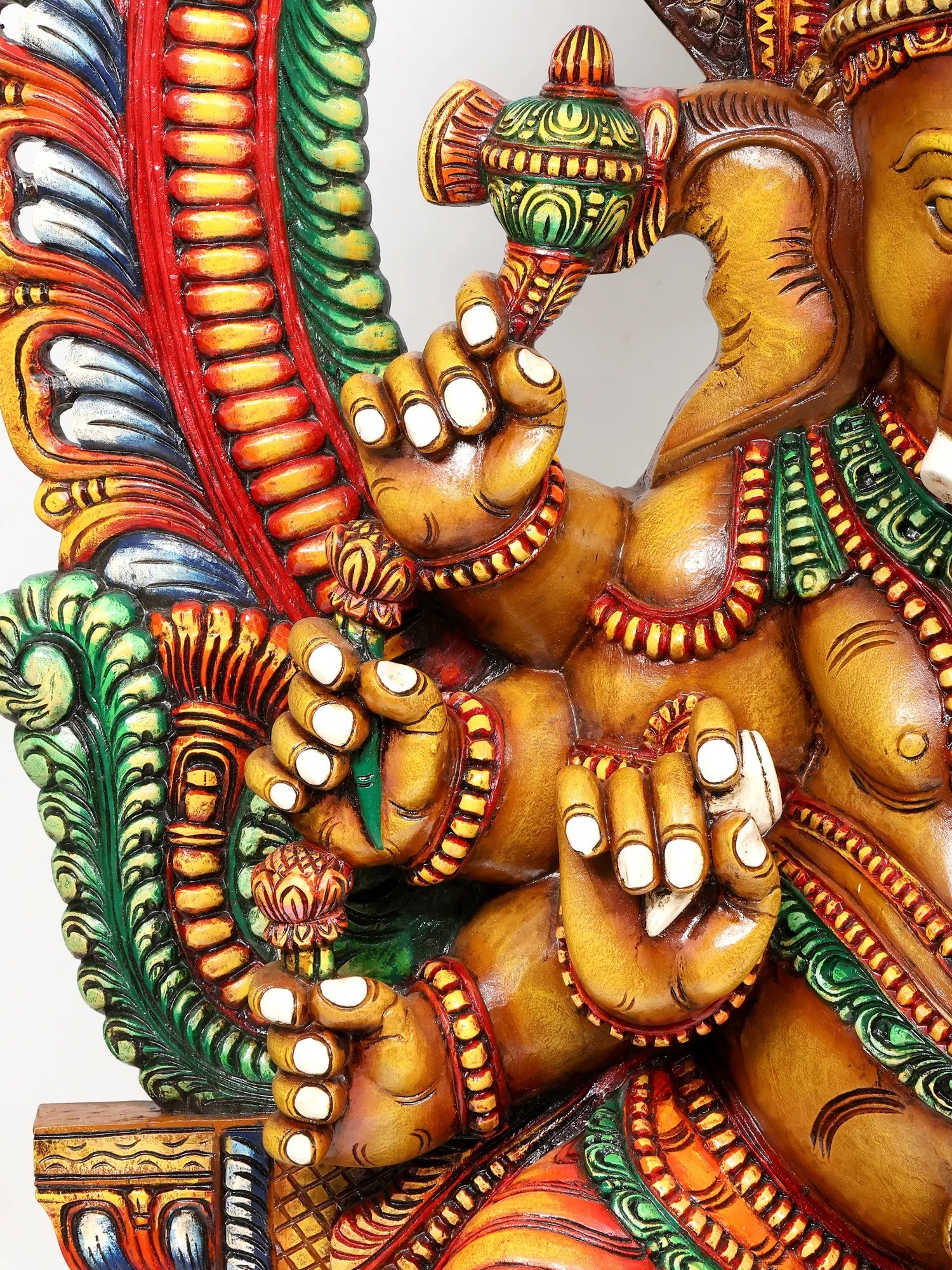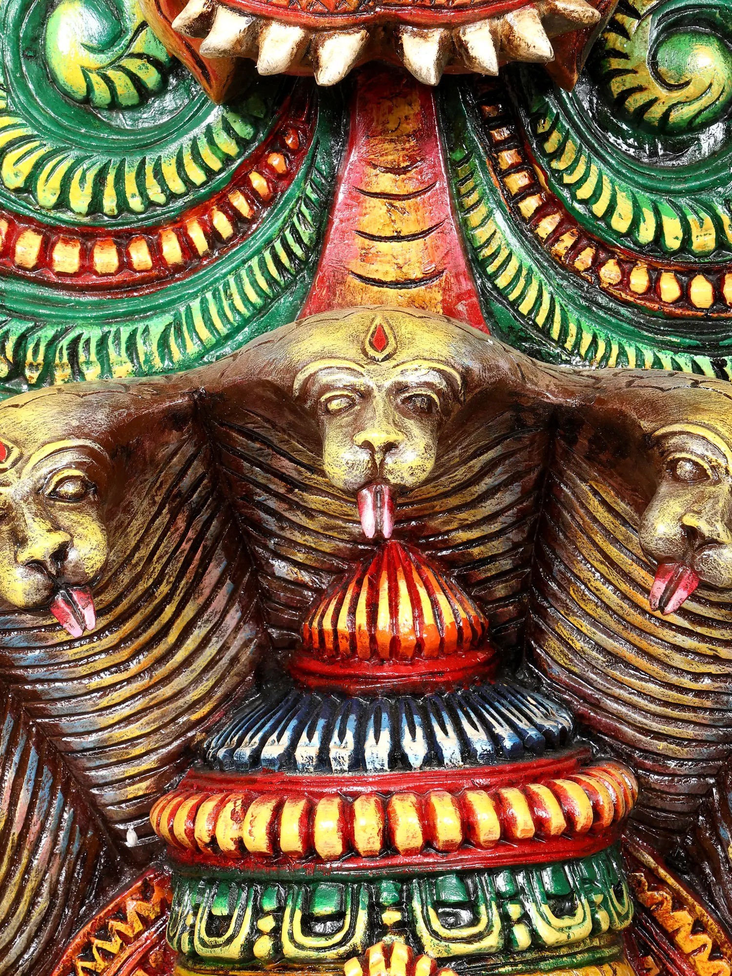 This magnificent statue is meticulously carved from Vaagai wood, renowned for its durability and rich, warm tones. Vaagai wood is a sustainable resource native to Southern India, adding to the statue’s cultural significance. The artisans behind this piece have poured their hearts and souls into its creation, employing centuries-old techniques passed down through generations. Every curve, every detail, reflects the skill and dedication involved in producing such a stunning work of art. The richly colored paints further enhance the intricate carving and highlight the exquisite detail in the portrayal of Ganesha's divine form and the Kirtimukha throne. This piece is not merely a statue; it's a living testament to the enduring spirit of traditional Indian artistry.