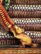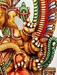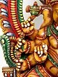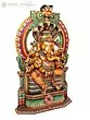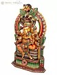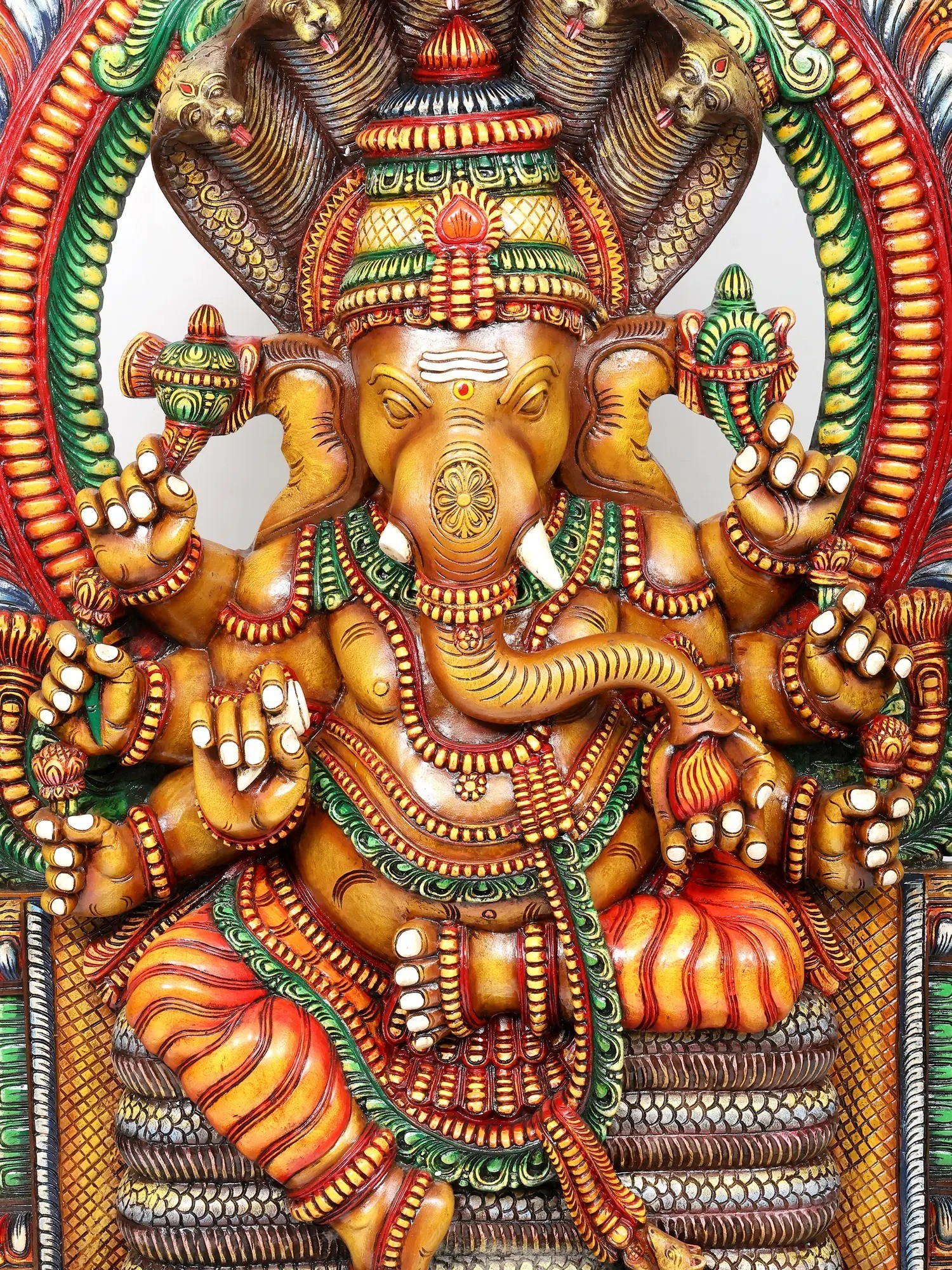 This breathtaking 80" Ashtabhuj Lord Ganesha statue, crafted from exquisite Vaagai wood, is a testament to the rich artistic heritage of India. Ganesha, the elephant-headed god, is revered as the remover of obstacles and the bestower of good fortune. This magnificent depiction showcases him in his eight-armed (Ashtabhuj) form, symbolizing his immense power and ability to handle multiple tasks with effortless grace. The intricate details, vibrant colors, and masterful craftsmanship make this a truly exceptional piece, ideal for adorning temples, homes, or galleries, inspiring awe and reverence. His seated posture on the Kirtimukha throne further enhances his regal presence. The Kirtimukha, a fearsome yet auspicious face, is a guardian figure found in many Indian temples and sculptures, warding off negative energies and protecting the sacred space.