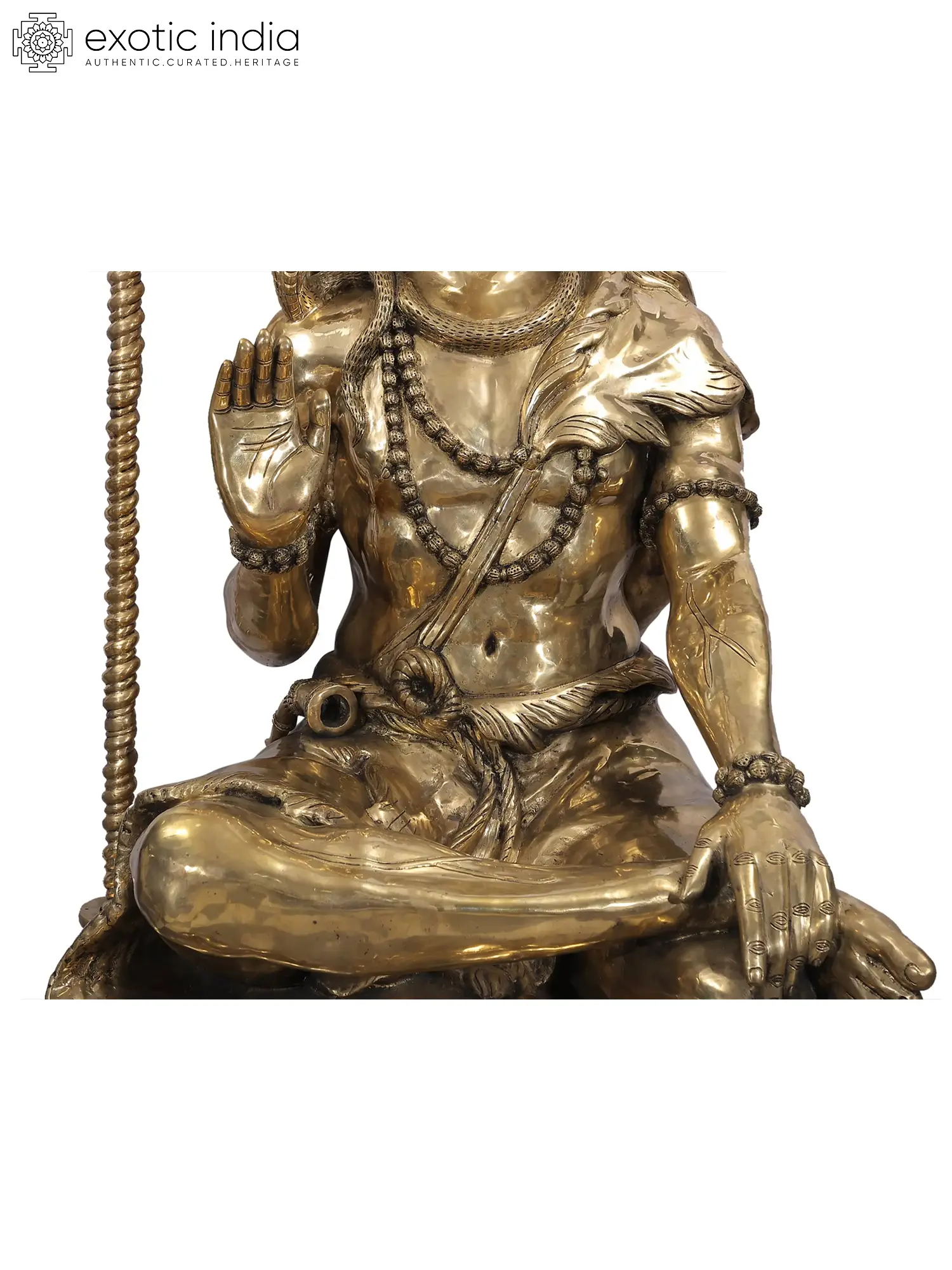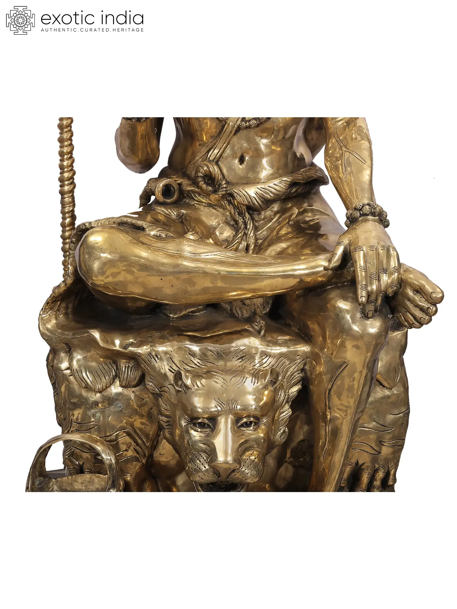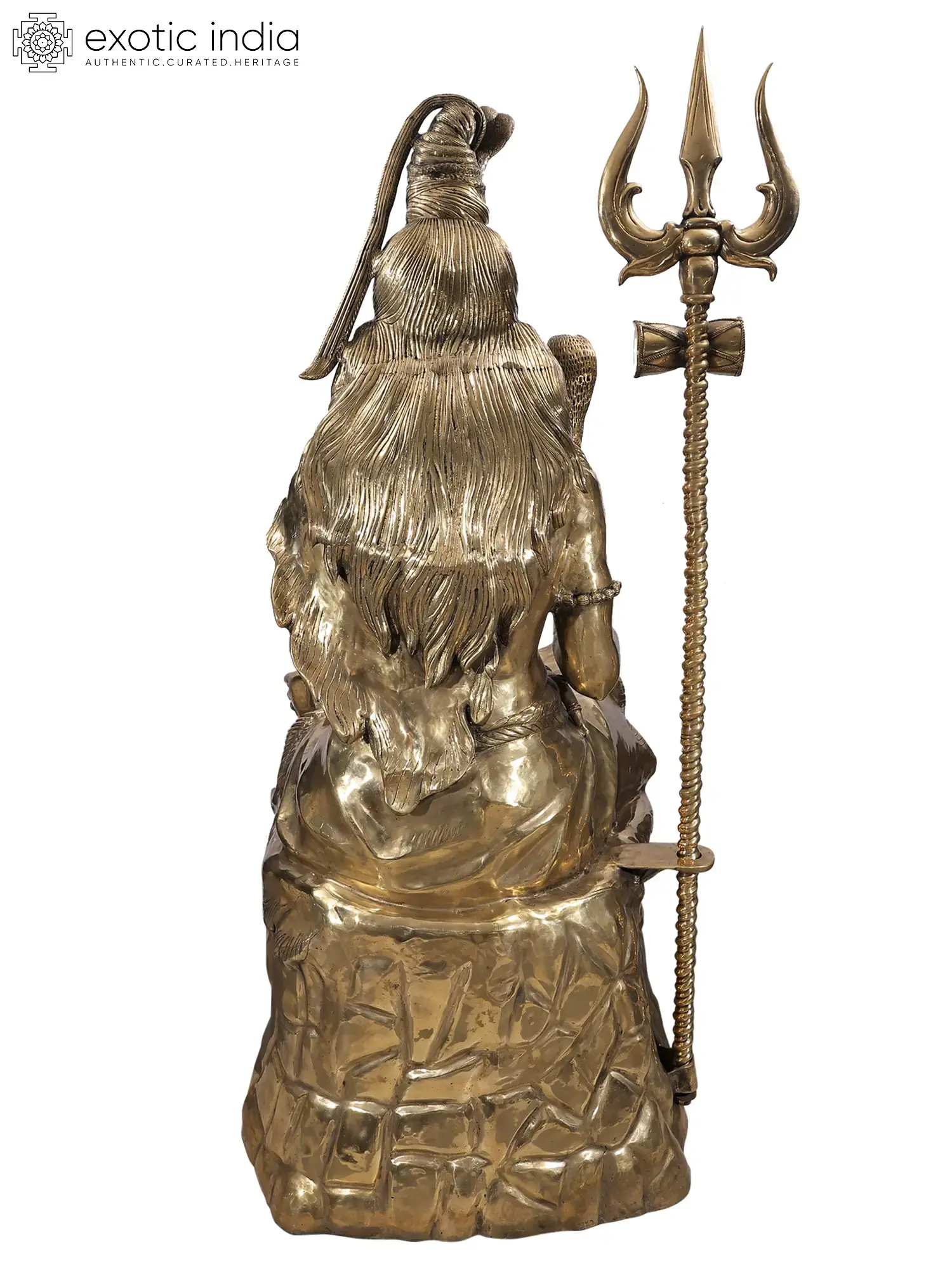 A larger-than-life (big) Shiva statue that would look great in your interiors or garden space. On a mound of Himalayan rock sits the ascetic of all ascetics. His limbs are gathered in lalitasana, and the right hand is raised in blessing over Shivagana. This Lord Shiva big statue is made from pure brass, which explains the glimmering gold colour.