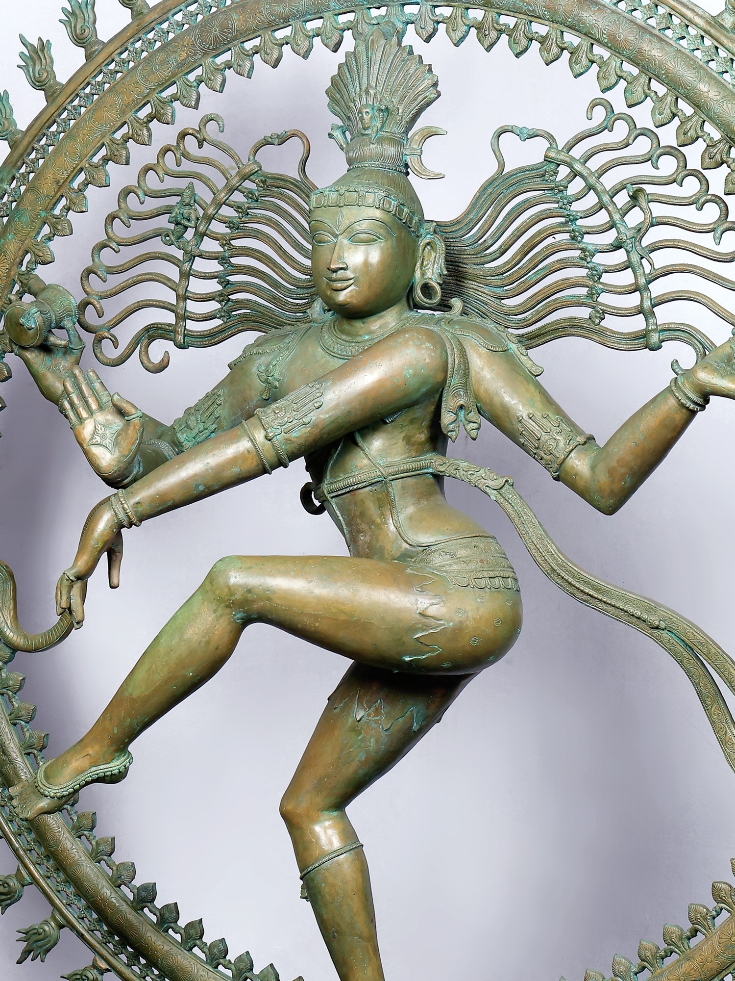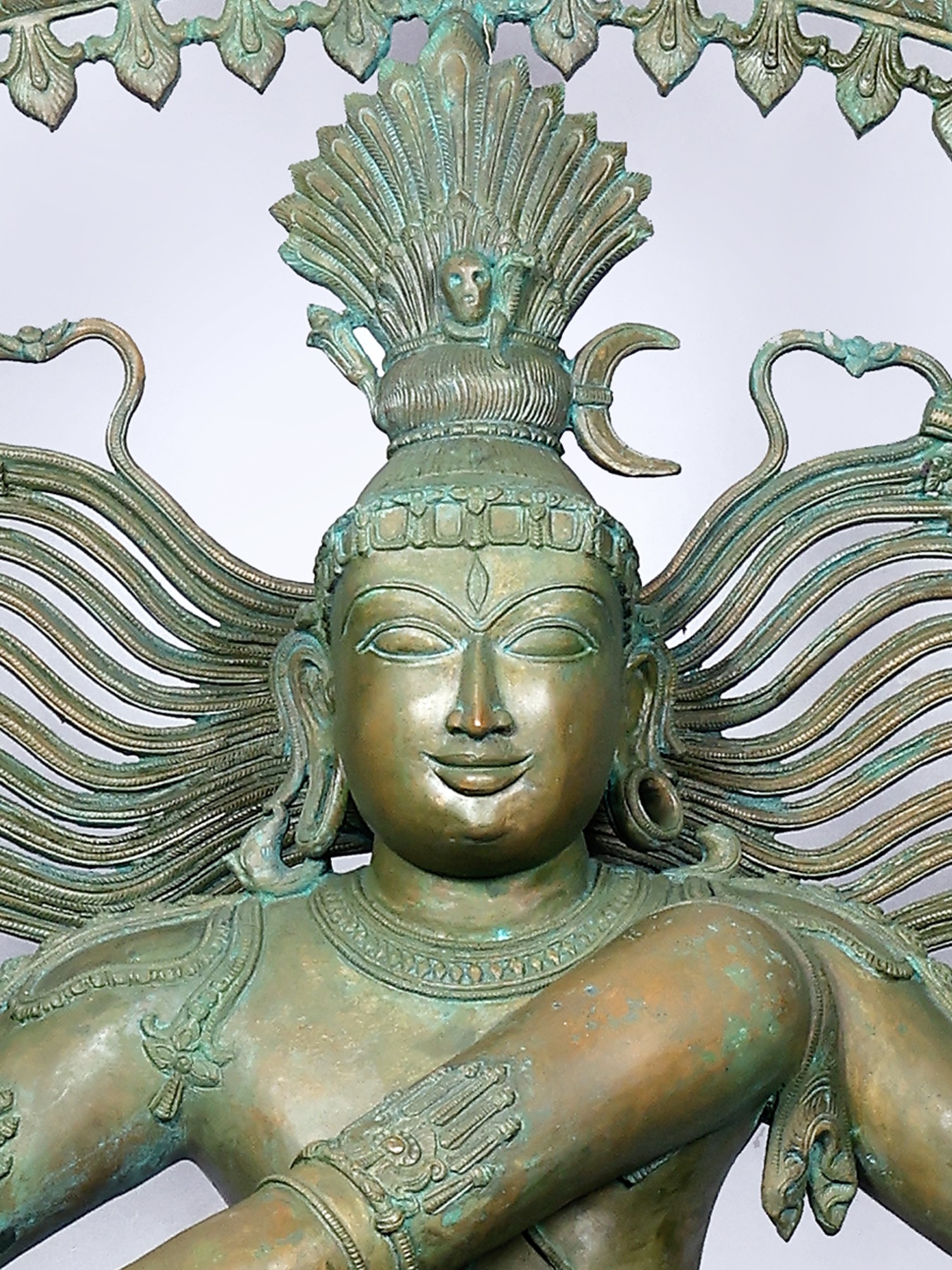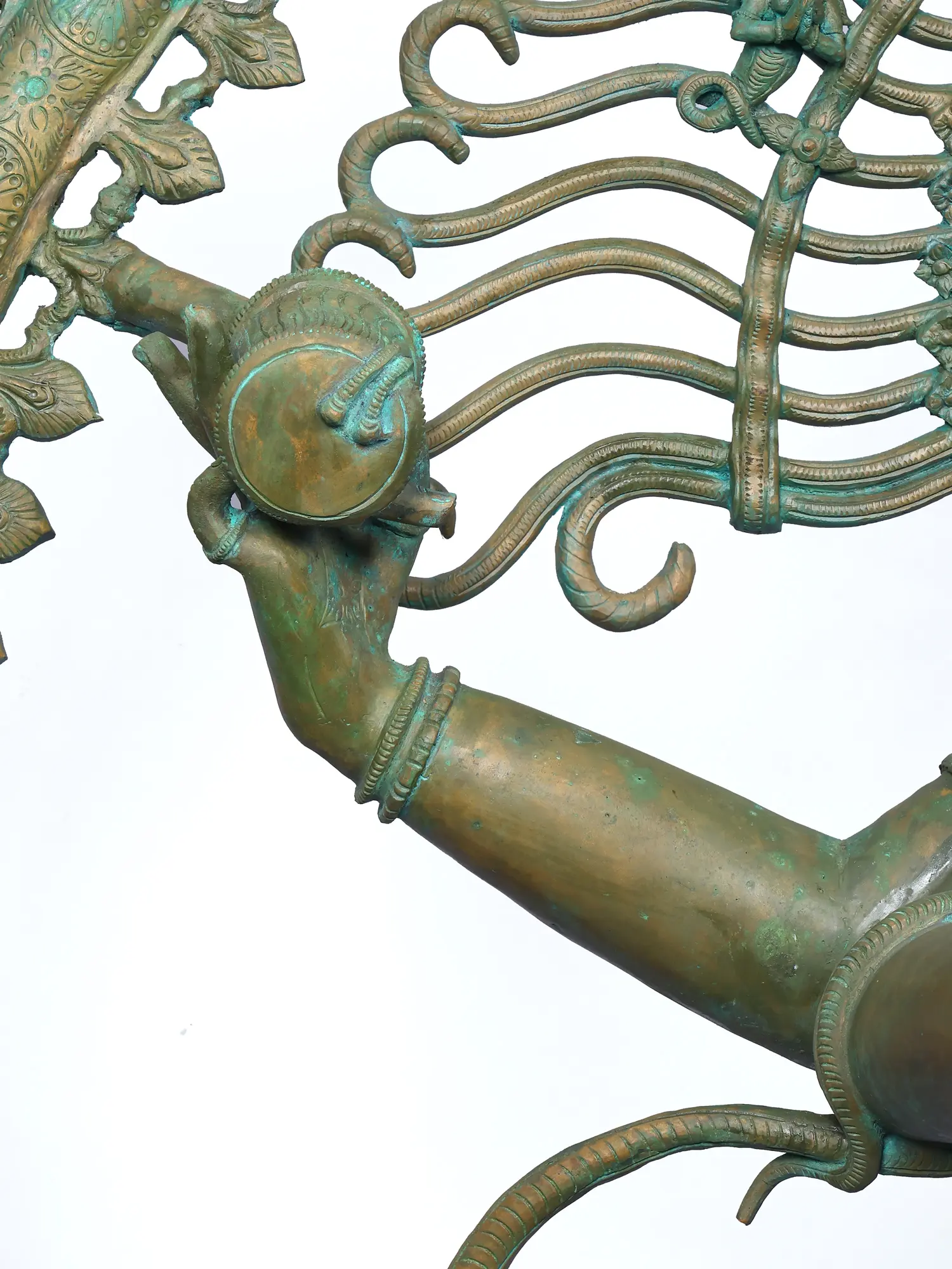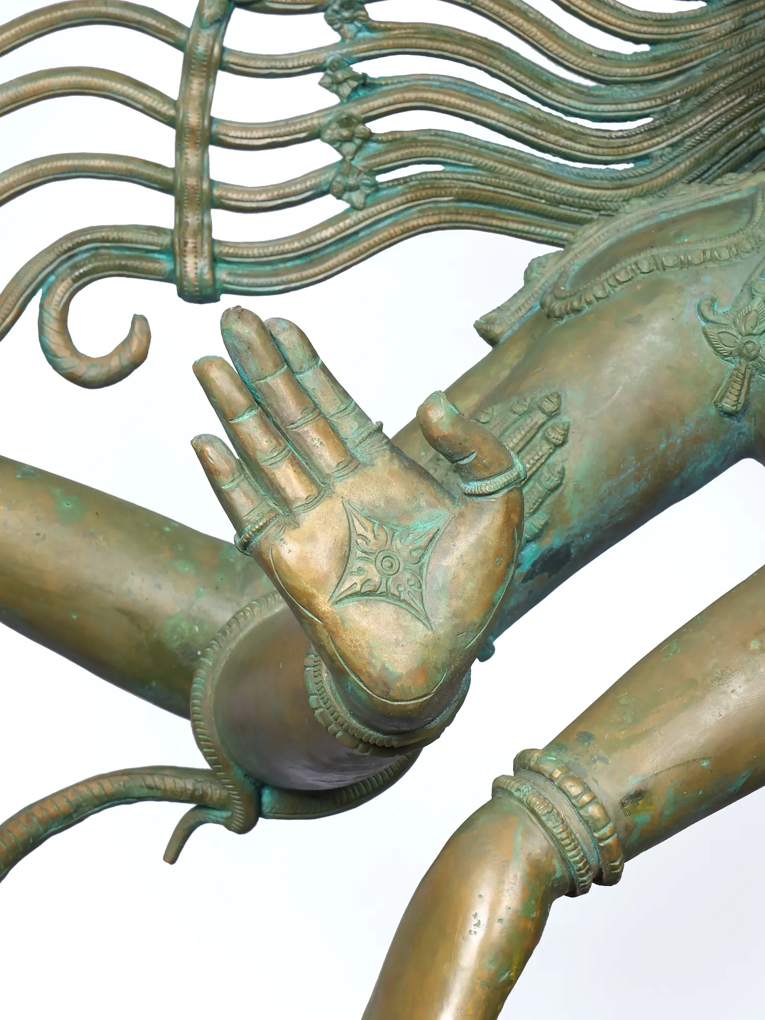 This awe-inspiring Nataraja sculpture is a profound representation of Hindu cosmology and philosophy. The undulating patterns within the aureole echo the cyclical movement of time and the ebb and flow of universal energy. The cobra coiled around Shiva's neck is a symbol of his control over primal forces and his transcendence of fear. The gentle smile on his face signifies his detachment from the material world and his inherent peacefulness amidst the universal chaos. This magnificent piece serves as a focal point for meditation and contemplation, inviting devotees to connect with the divine energy of transformation and renewal that Nataraja embodies. Its sheer scale and intricate craftsmanship make it a commanding presence, suitable for large halls, temples, or as a statement piece in a culturally rich environment. The patina, a result of the casting process and time, adds depth and character, hinting at the stories and millennia of worship it has witnessed.