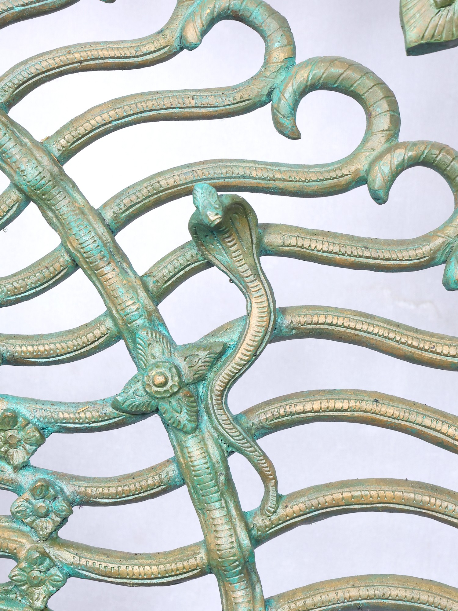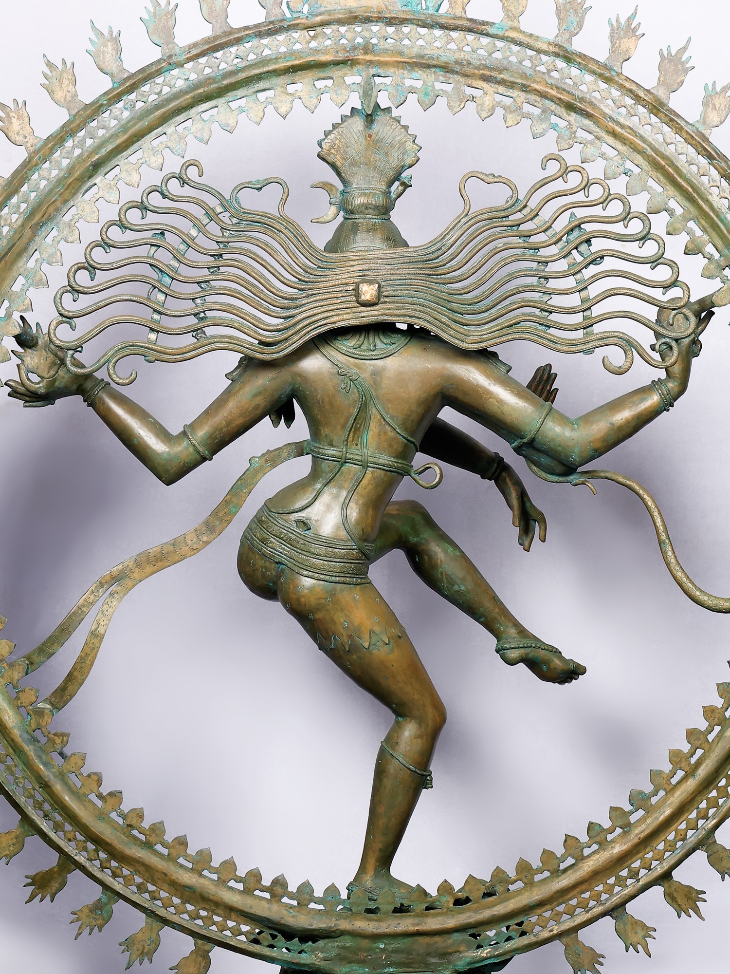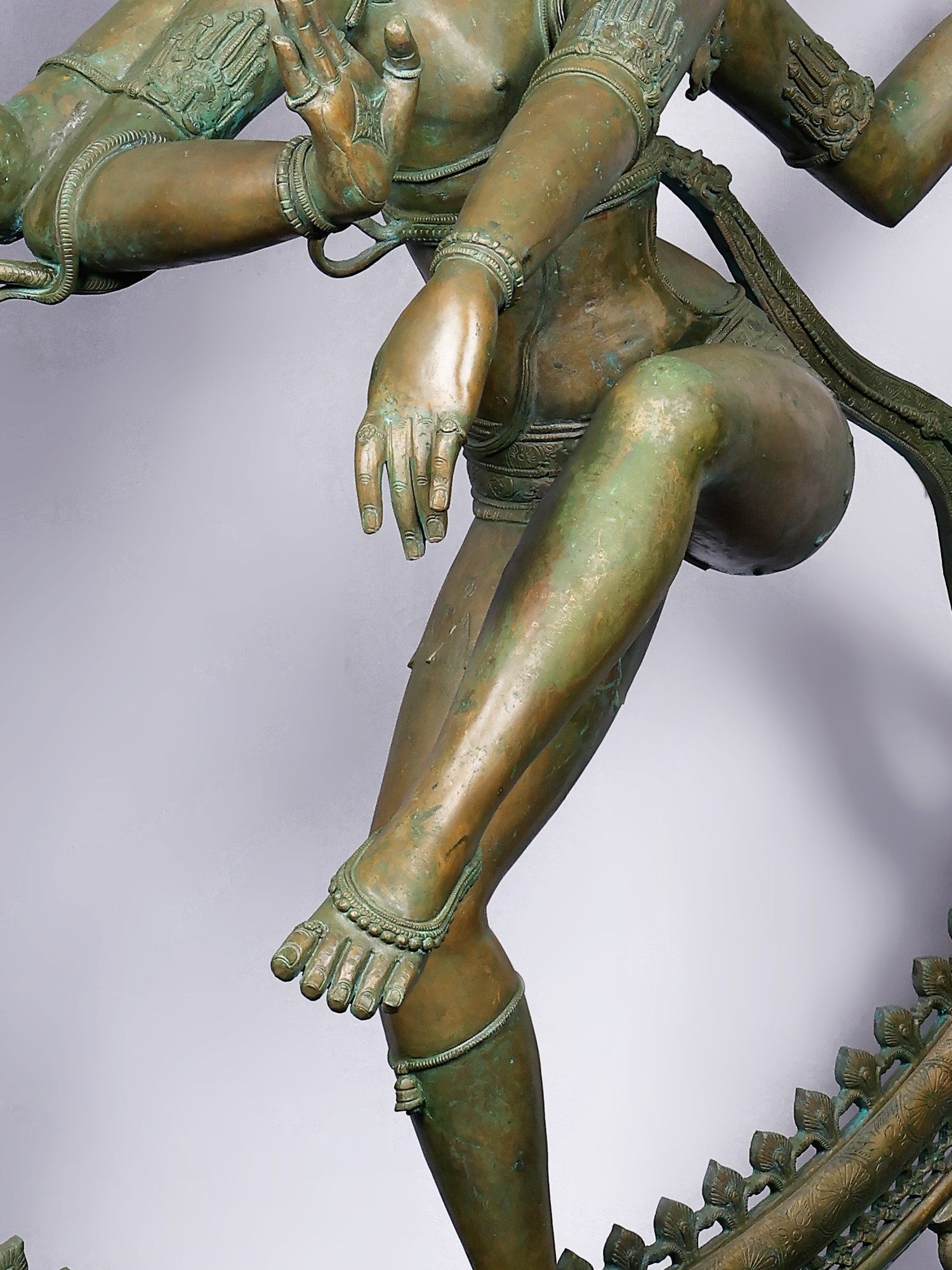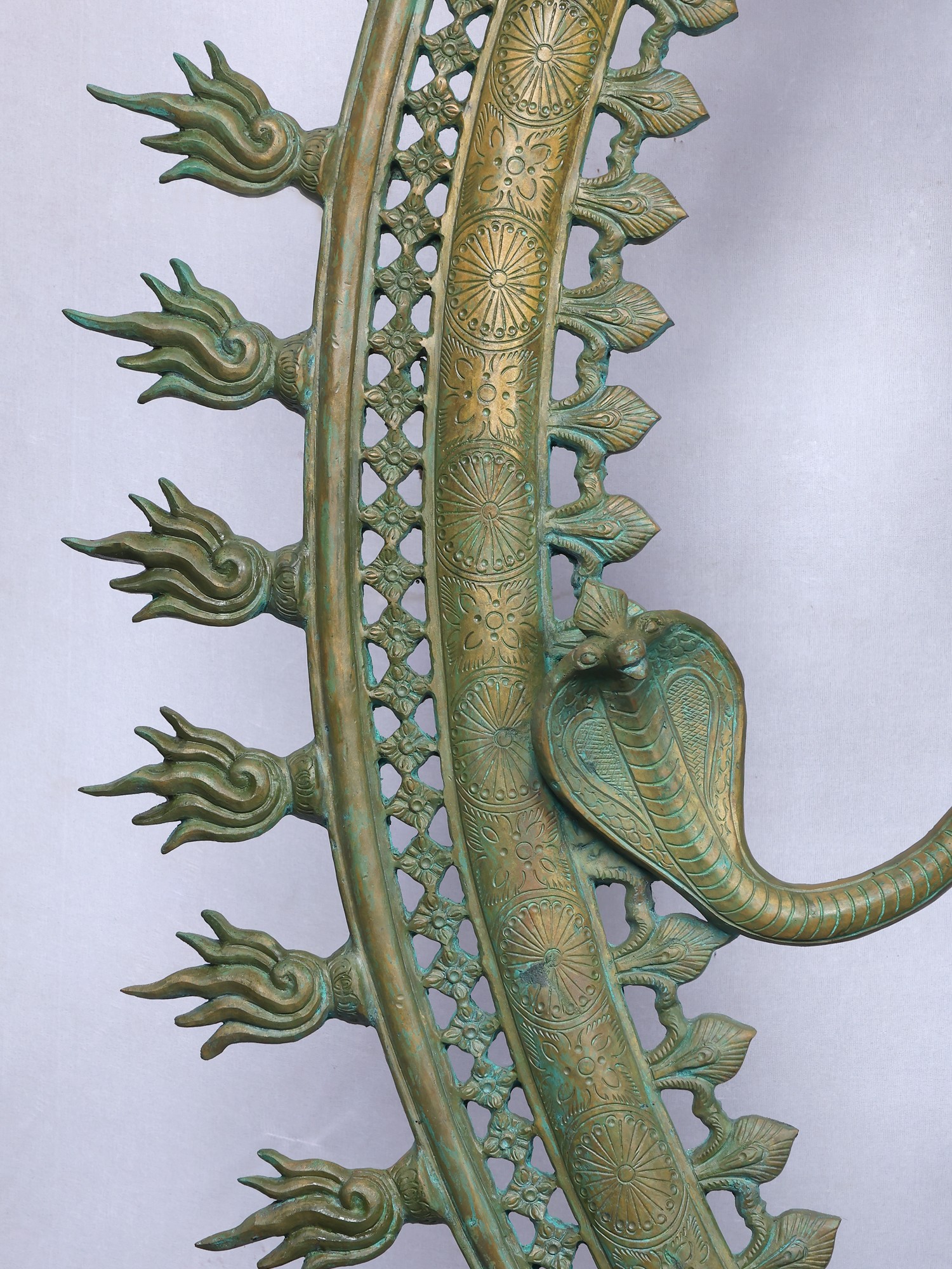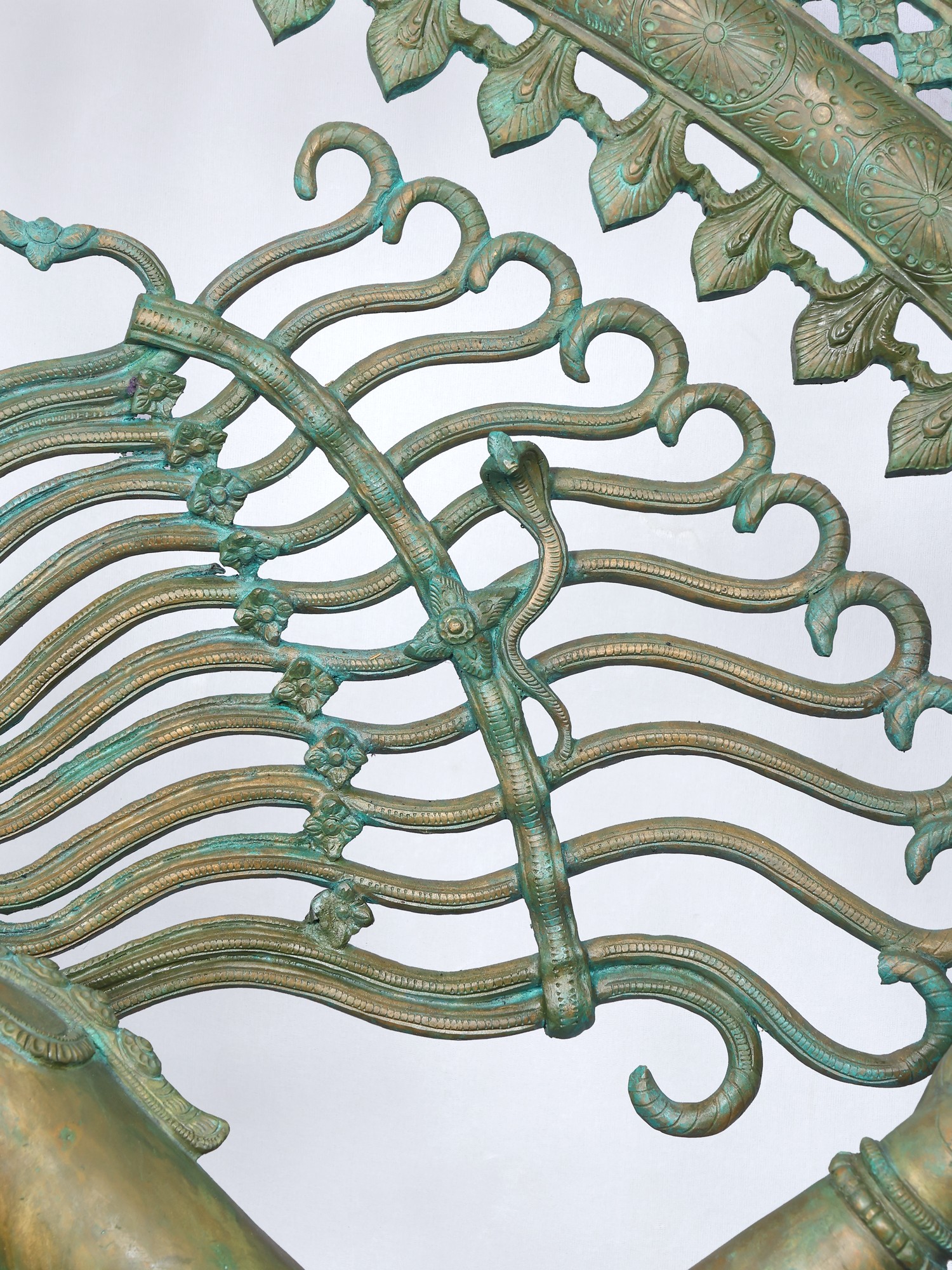 This awe-inspiring Nataraja sculpture is a profound representation of Hindu cosmology and philosophy. The undulating patterns within the aureole echo the cyclical movement of time and the ebb and flow of universal energy. The cobra coiled around Shiva's neck is a symbol of his control over primal forces and his transcendence of fear. The gentle smile on his face signifies his detachment from the material world and his inherent peacefulness amidst the universal chaos. This magnificent piece serves as a focal point for meditation and contemplation, inviting devotees to connect with the divine energy of transformation and renewal that Nataraja embodies. Its sheer scale and intricate craftsmanship make it a commanding presence, suitable for large halls, temples, or as a statement piece in a culturally rich environment. The patina, a result of the casting process and time, adds depth and character, hinting at the stories and millennia of worship it has witnessed.