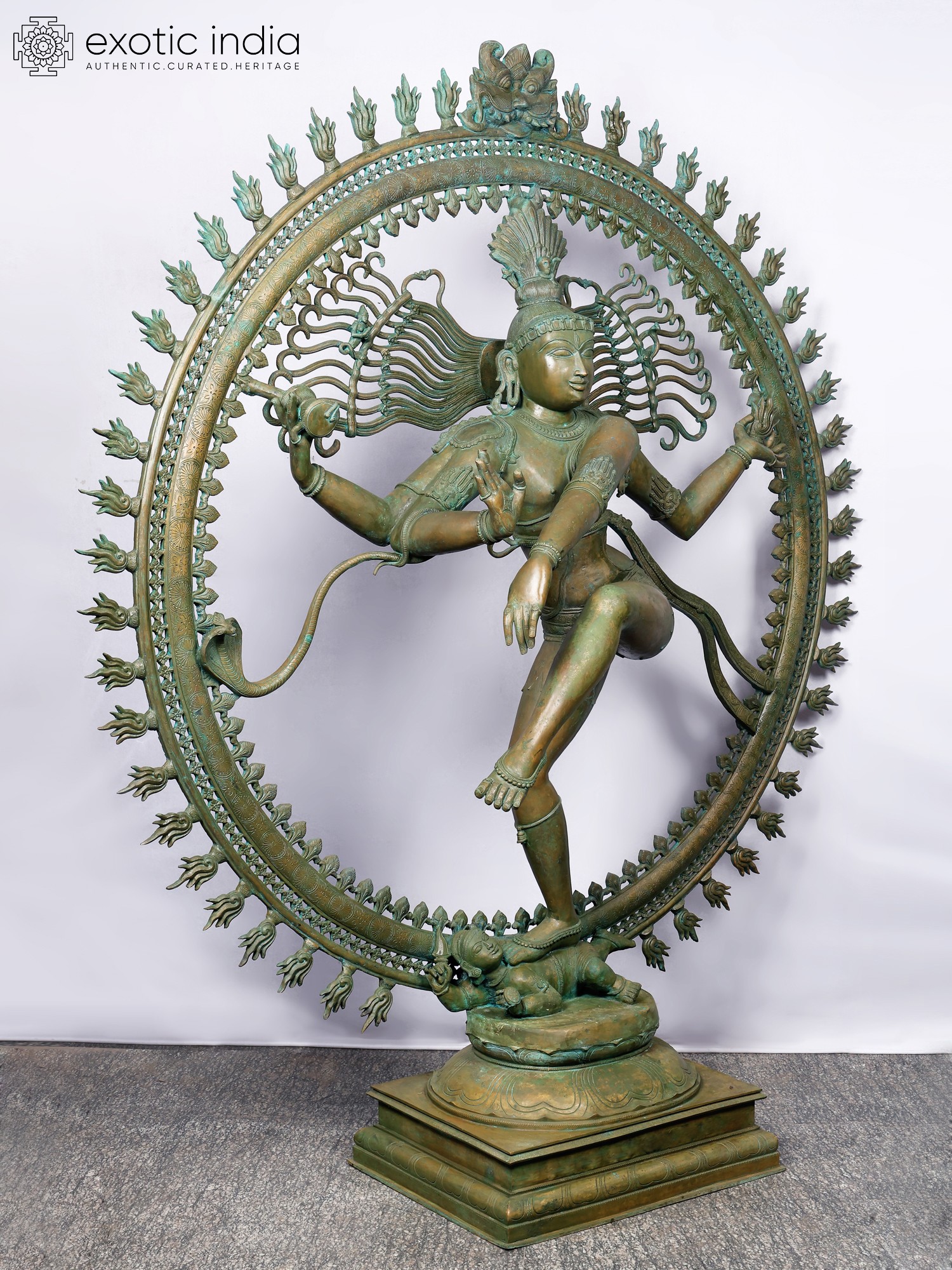 Witness the divine energy of Lord Shiva in his most dynamic form, Nataraja, the Lord of the Dance. This monumental bronze masterpiece, standing at an impressive 84 inches, is not merely a sculpture but a vibrant depiction of the eternal cosmic dance that sustains the universe. Crafted using the ancient and revered Madhuchista Vidhana, or lost-wax casting technique, by master artisans in Swamimalai, a region renowned for its bronze casting heritage, this artwork embodies centuries of tradition and spiritual devotion. The Panchaloha, a sacred alloy of five metals – gold, silver, copper, zinc, and tin – imparts a unique patina and enduring quality to the sculpture, believed to possess auspicious properties.
