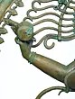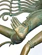 The Nataraja form captures the essence of Shiva's Ananda Tandava, the cosmic dance of bliss, which symbolizes the cyclical nature of creation, preservation, and destruction. Shiva, with his serene yet powerful expression, is poised within a circular aureole adorned with flames, representing the cosmic fire that both illuminates and consumes. His right foot crushes the demon Apasmara, symbolizing the annihilation of ignorance and ego, while his raised left foot signifies liberation and release. The upper right hand holds a drum (damaru), the sound of which is said to be the primal rhythm of creation, while the upper left hand holds the flame of destruction and transformation. The flowing locks of hair, imbued with the waters of the sacred Ganges, spread outwards like wings, suggesting the vast expanse of the cosmos.
