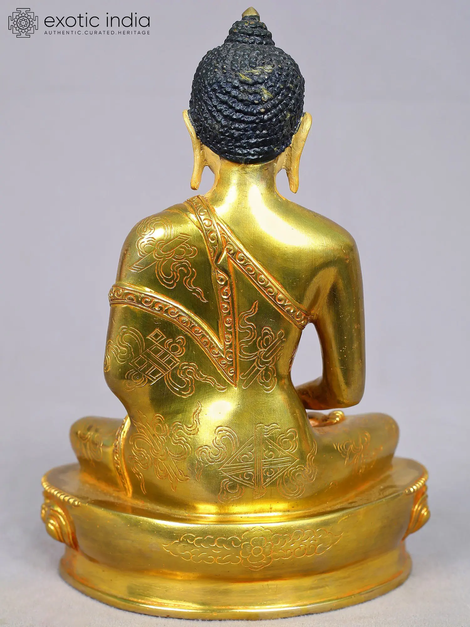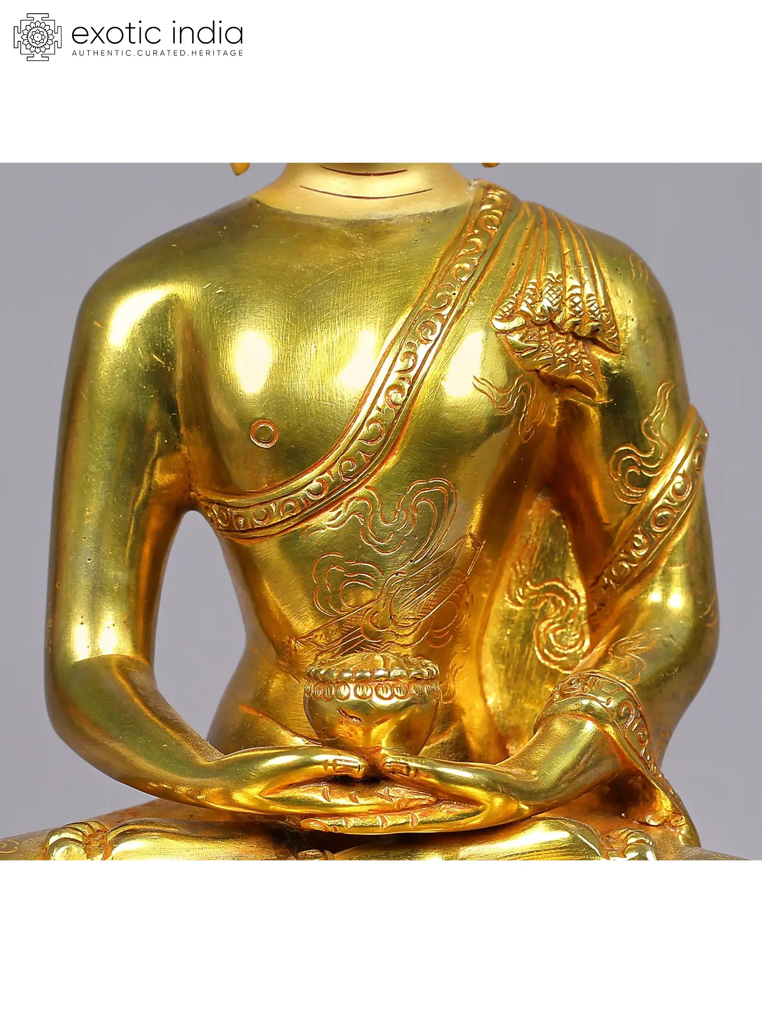 Amitabha is shown seated in a meditative posture with both hands gently folded over his lap and palms facing upward. The lotus posture in which he sits symbolizes spiritual attainment, while the begging bowl he holds signifies non-attachment. His lotus throne represents the state of enlightenment, making him a significant figure in Buddhism, particularly in the context of the afterlife and spiritual liberation.
