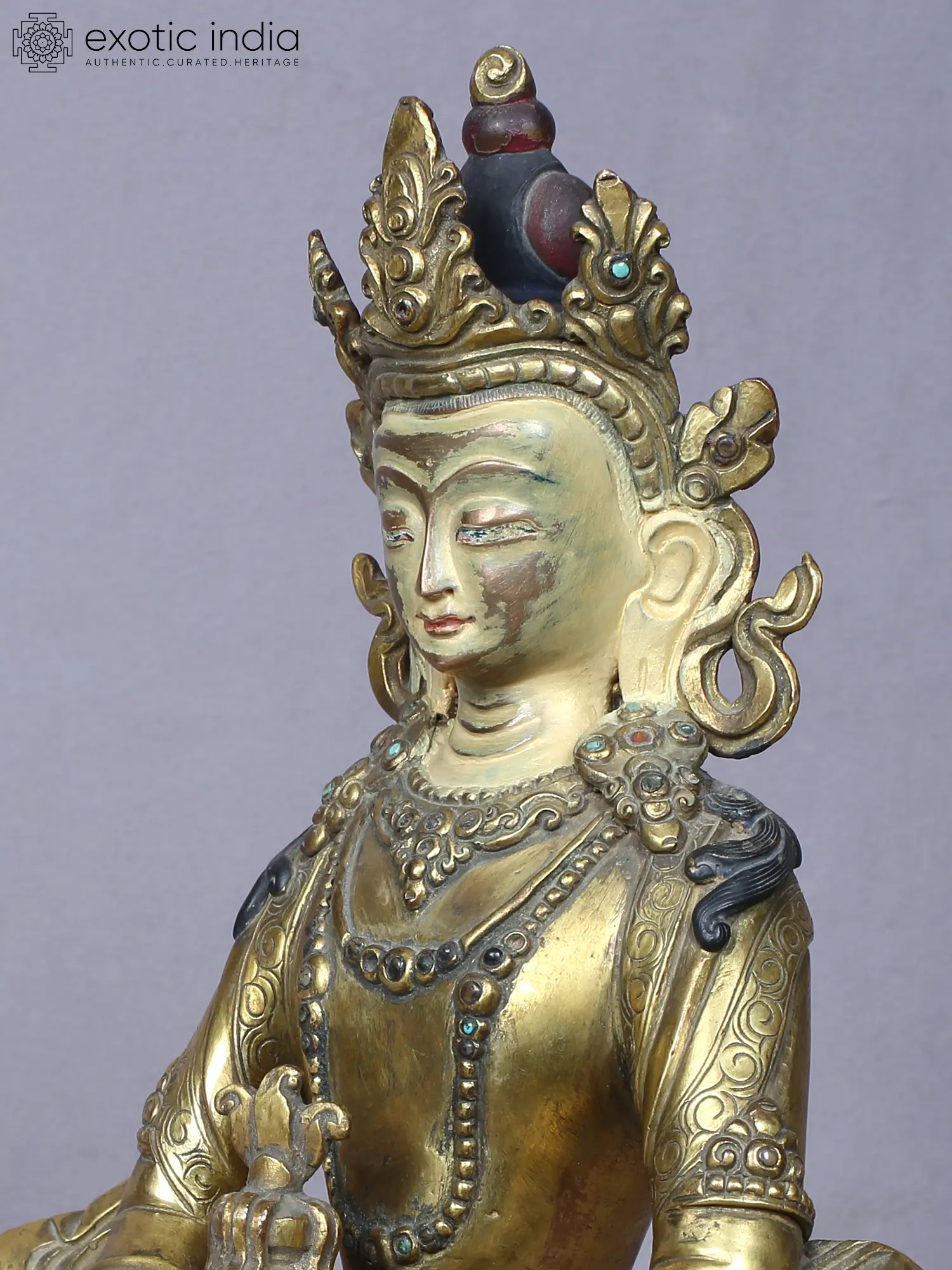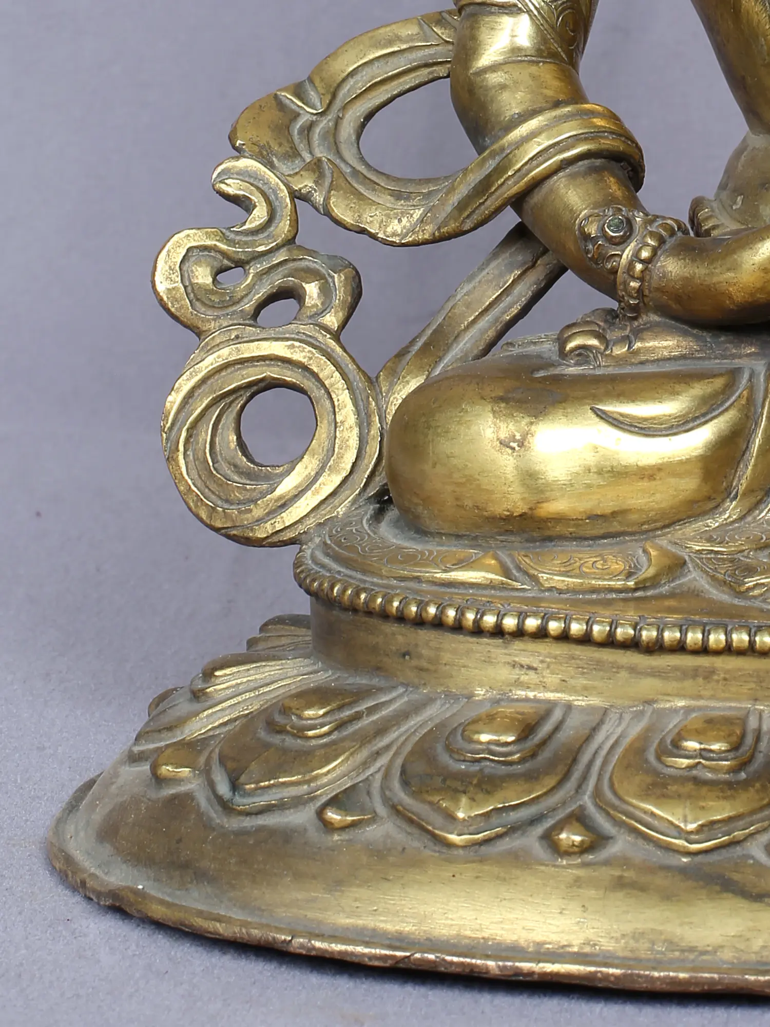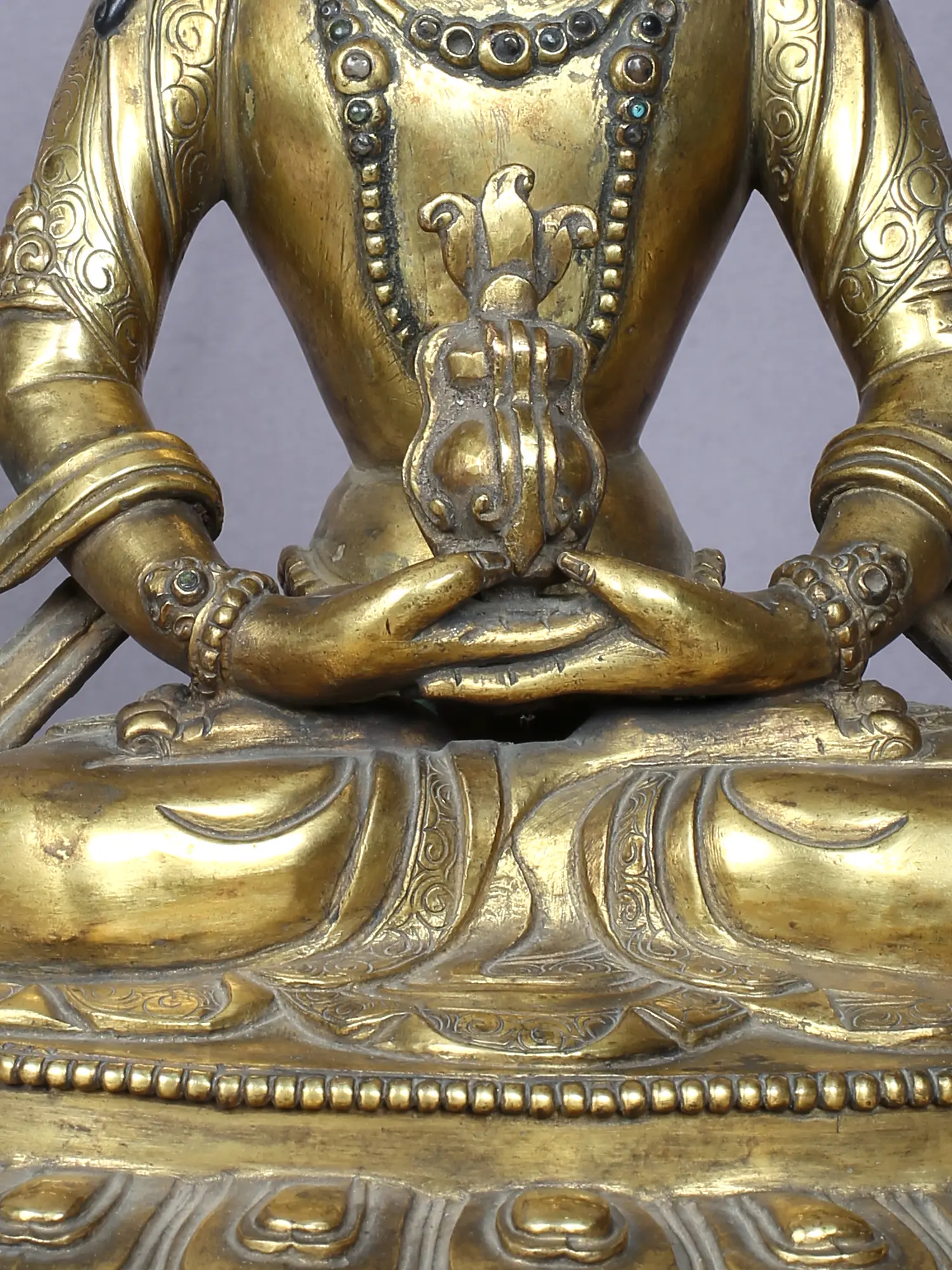 Amitayus Buddha is depicted seated in a meditative posture with his hands in the Dhyana Mudra, symbolizing meditation. He holds a vessel, known as a Kalasha, in his hands. The Kalasha contains the nectar of immortality, representing the boundless life and compassion that Amitayus Buddha bestows upon devotees. He is often praised for blessings of long life, health, and the aspiration to be reborn in Sukhavati, the pure land associated with Amitayus, where they can continue their journey towards enlightenment in an ideal environment.