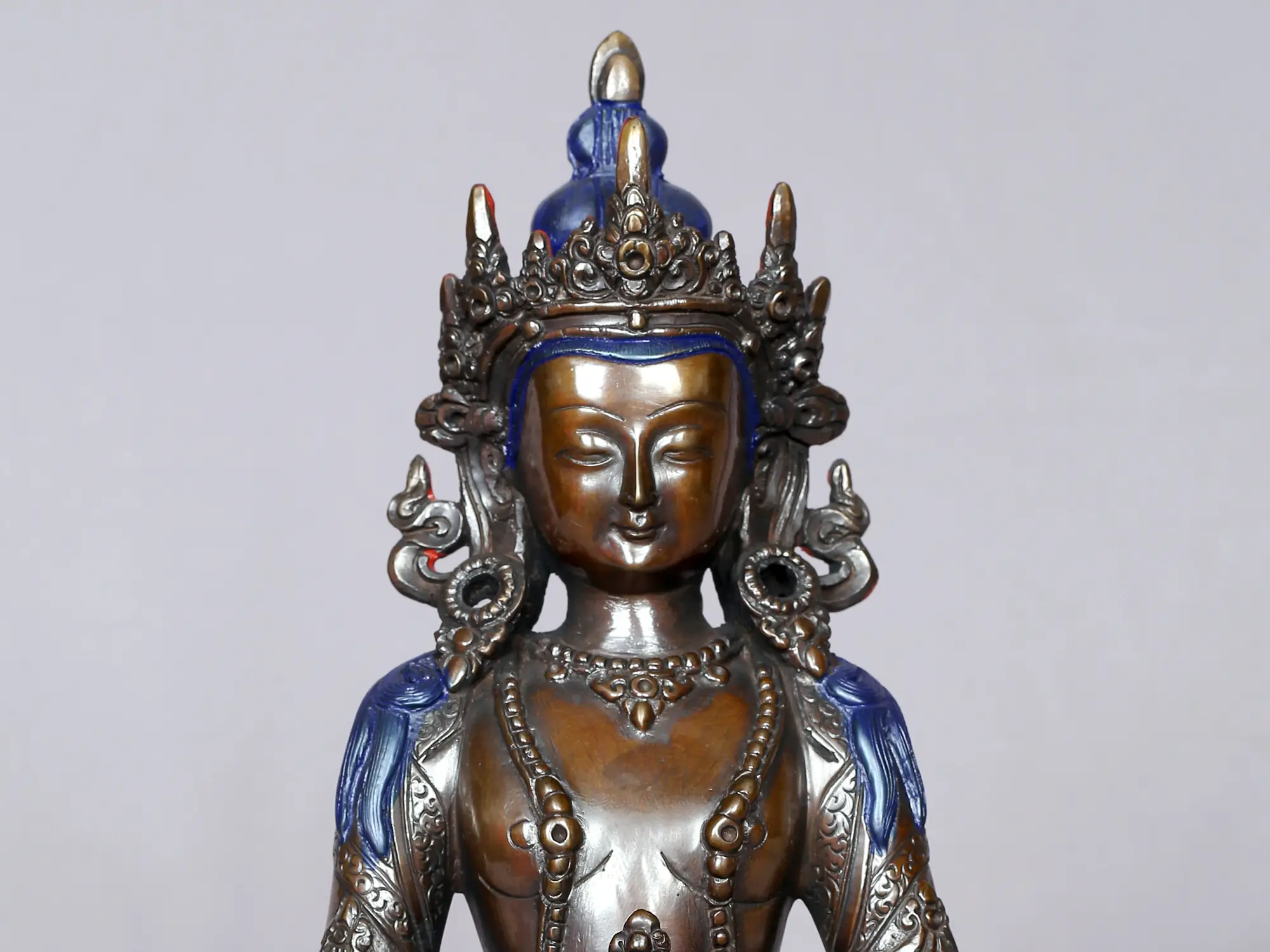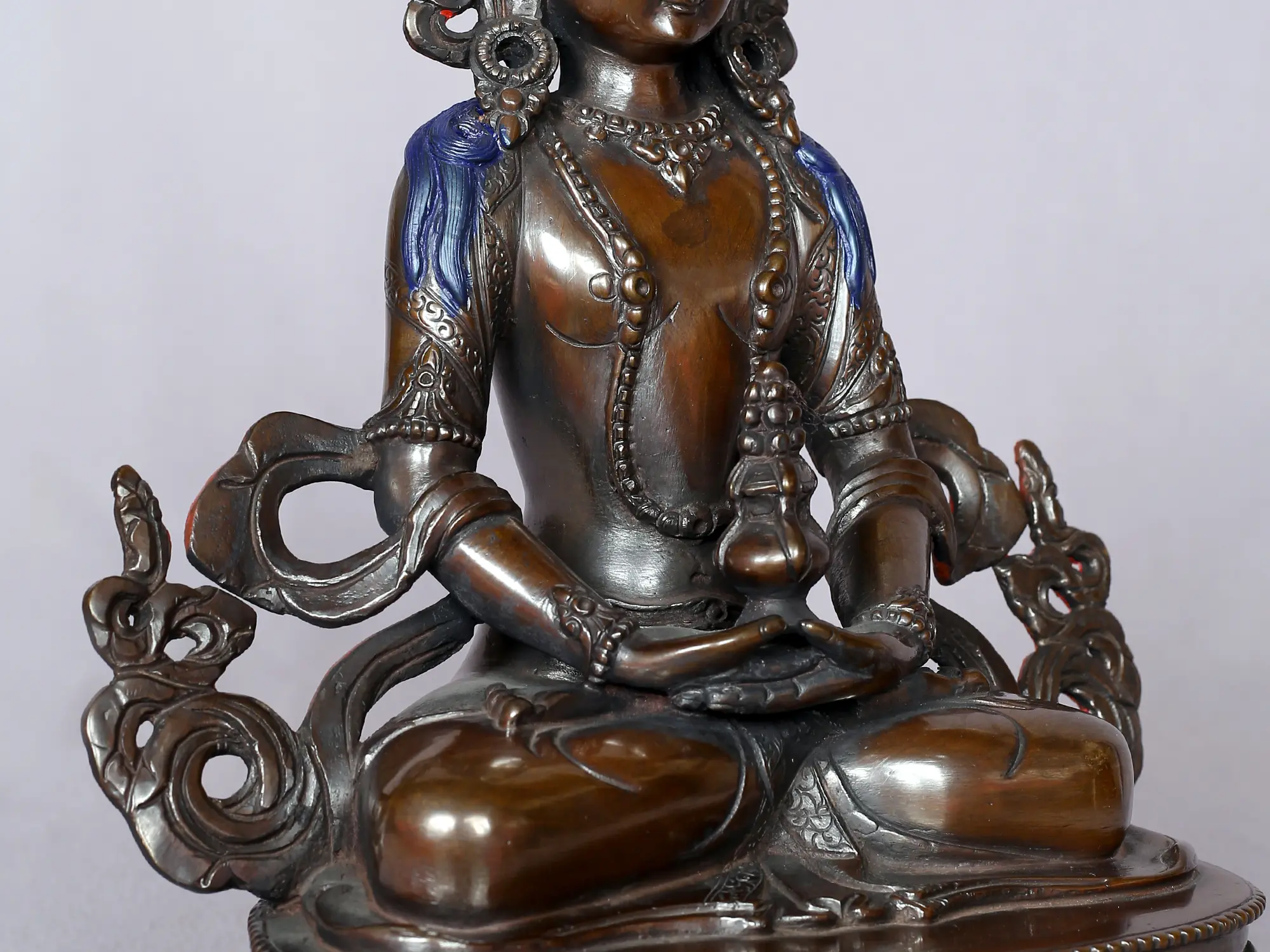 Aparmita Buddha seated in meditation, often depicted with a crown of the five Dhyani Buddhas and wearing monastic robes. His hands are typically in the Dhyana Mudra (meditative gesture) with a bowl in his palms, symbolizing the elixir of immortality.