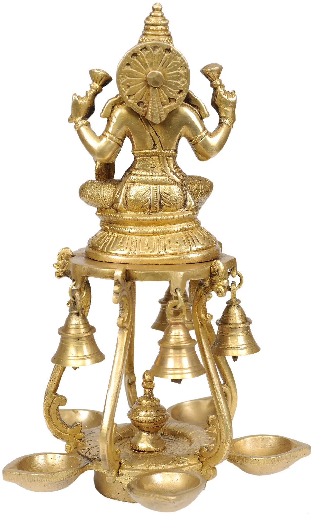The one who dwells in the Lotus is respected by the Devas, bestows great qualities, and has a kind heart. Madhusudhana's beloved (consort), Goddess Adi Lakshmi is the one. This brass artistic brass lamp with five wicks and bells, as well as a stand and a Goddess Lakshmi figure, is a soothing reminder of the Goddess's role in delivering the warmth of her love and bestowing good luck, wealth, and health. The depiction of the deity showering blessings on her worshippers is made more favorable by the use of bells and candles. Placing this lamp in private worship areas and lighting it twice a day will undoubtedly result in sanctification.