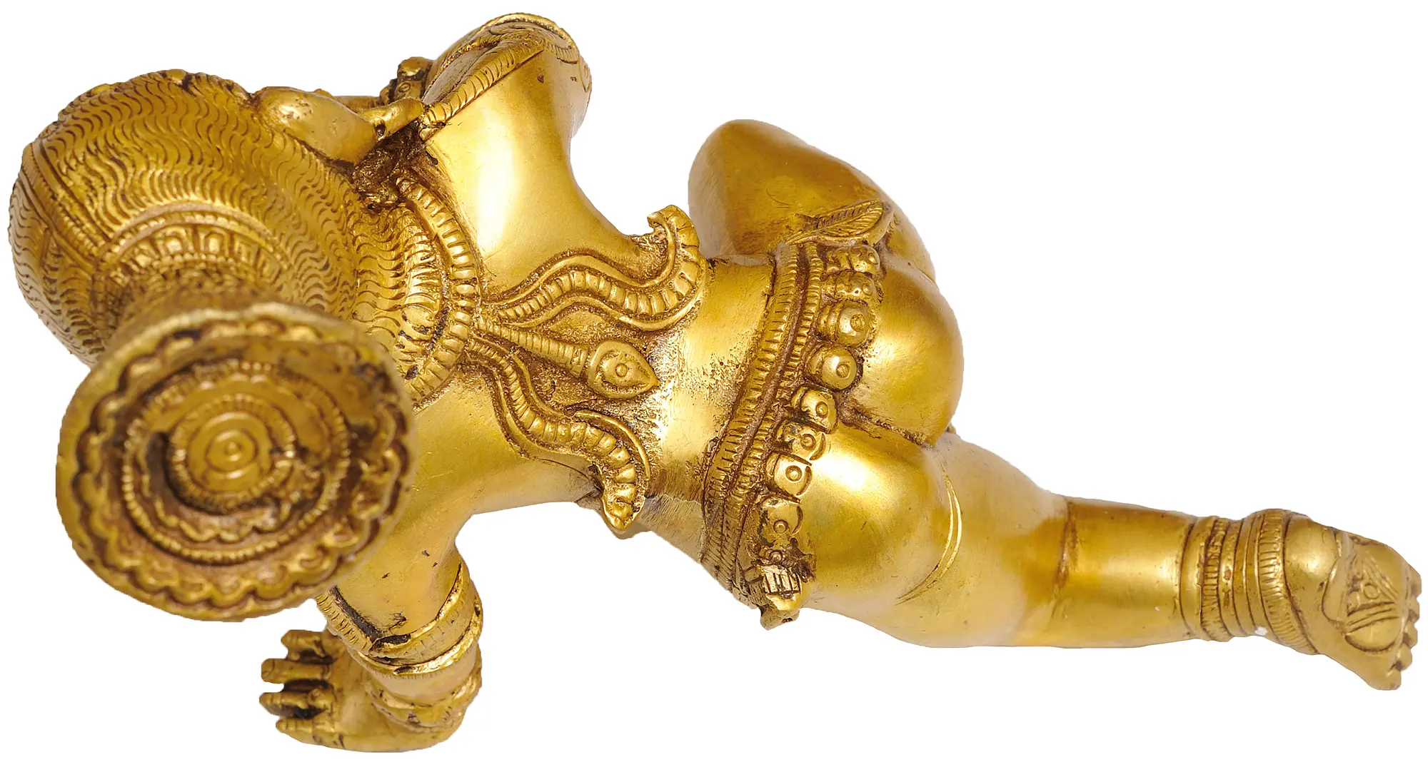 Witness the charming depiction of Lord Krishna as a playful baby with a tribal hair style in this captivating brass sculpture. Handmade with precision and devotion in India, this artwork beautifully captures the innocence and sweetness of the divine child. Lord Krishna, in his childhood form, is known for his endearing antics, particularly his love for butter. This sculpture showcases Krishna enjoying a delightful moment with a pot of butter, his tribal hairstyle adding a unique touch to his character. The childlike innocence of Krishna represents purity, simplicity, and the freedom of the soul.