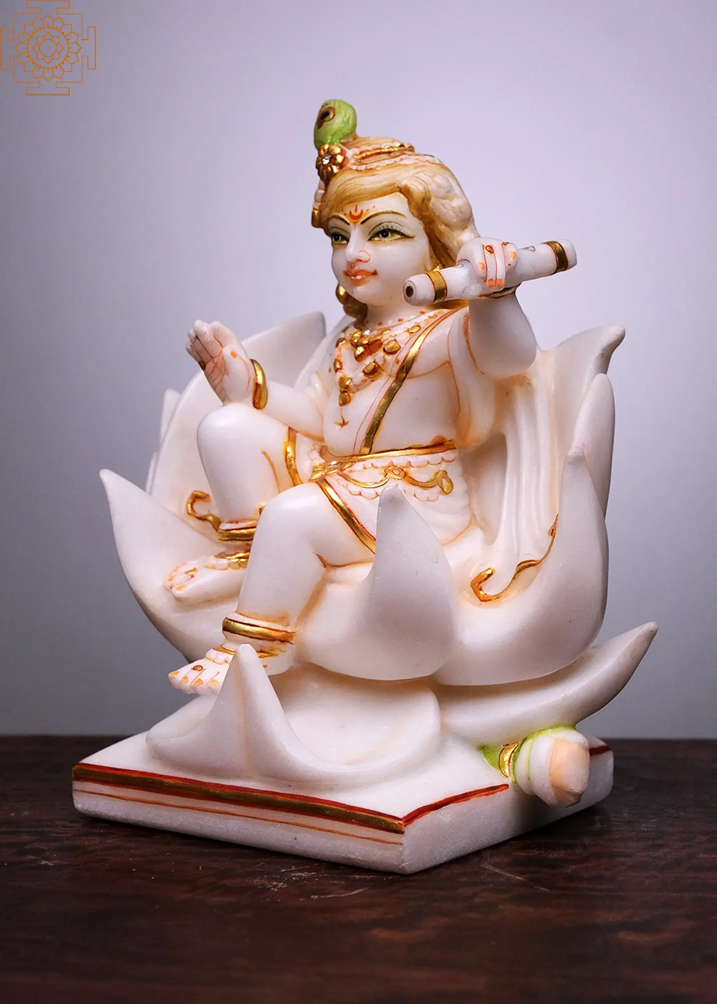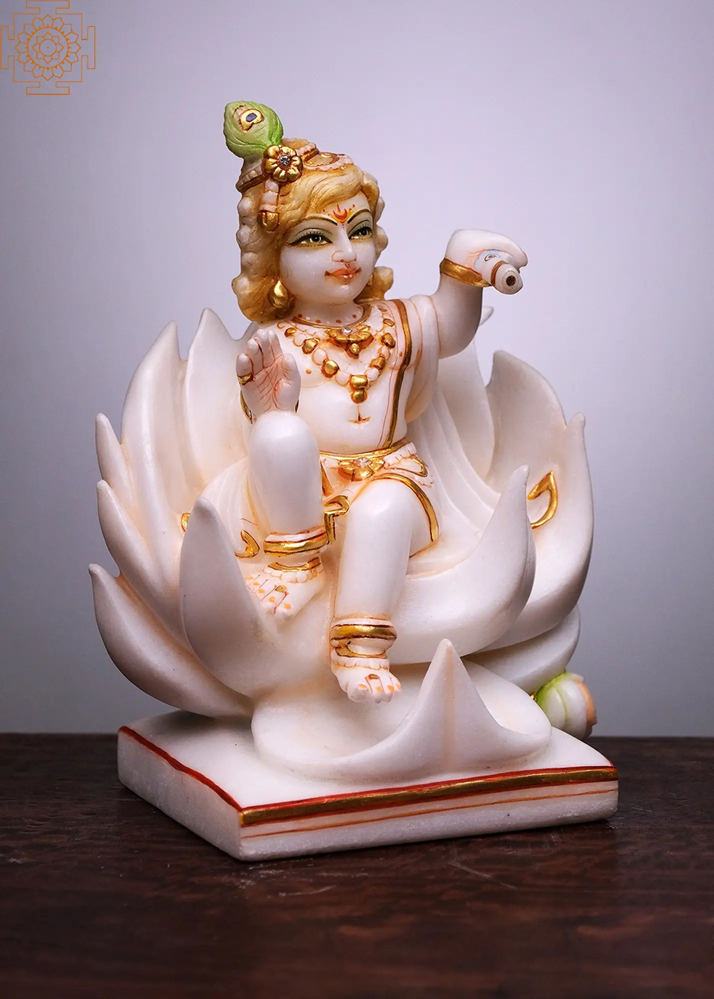 9" Bal Krishna Sitting on Lotus | Handmade | White Marble Krishna | Lord Krishana Idol | Kanha Murty | Gopala | Govinda