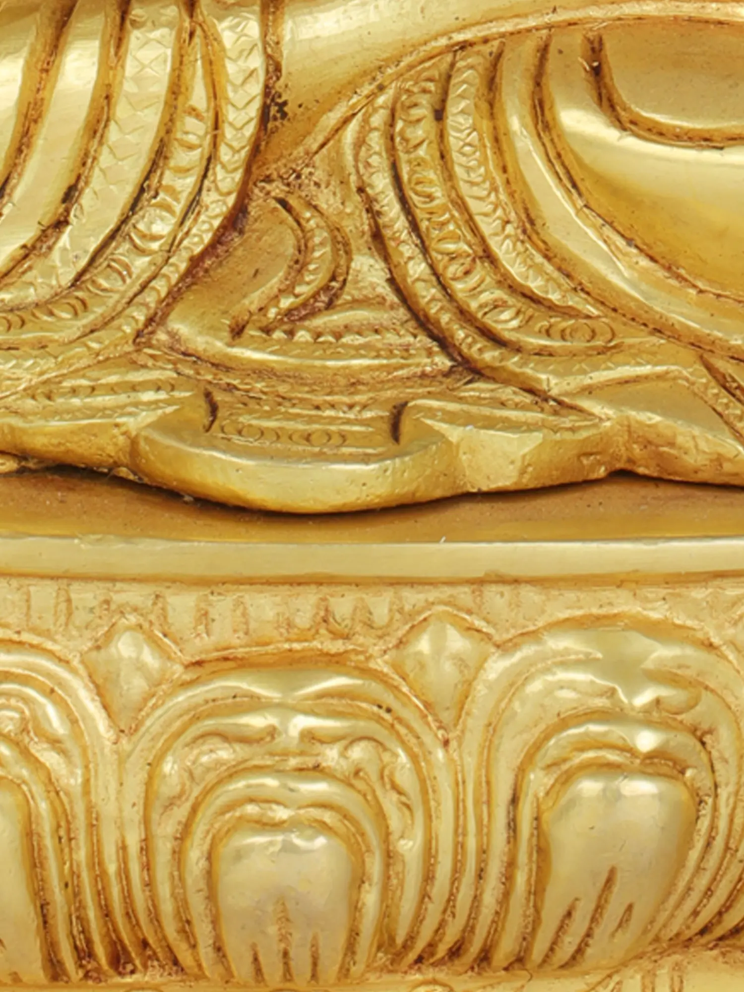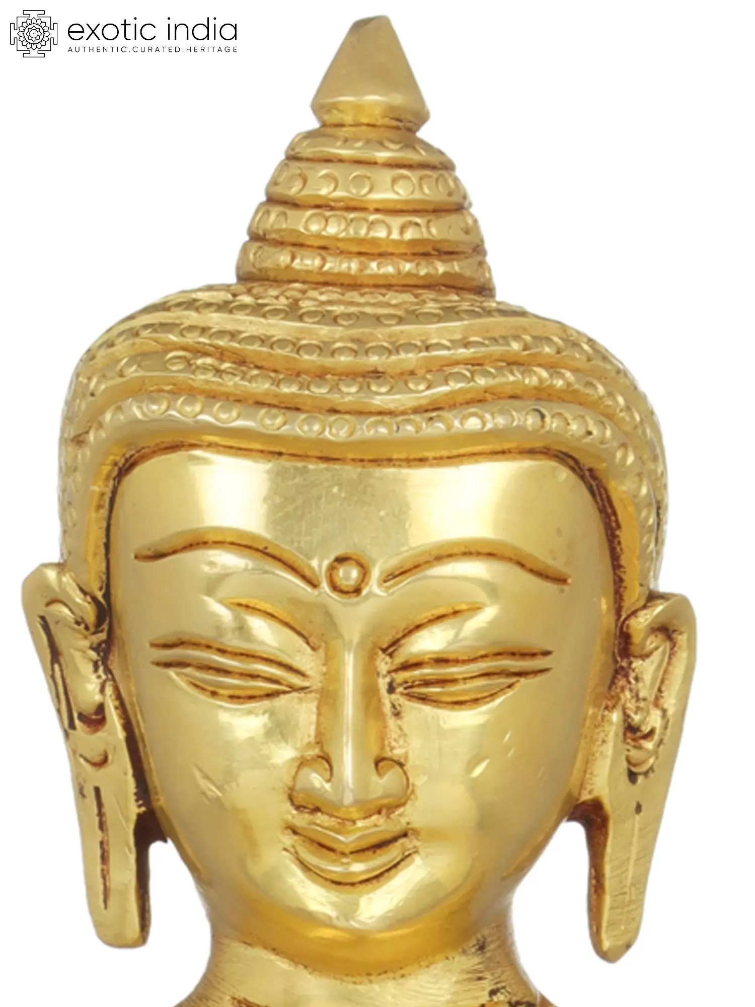 This exquisite brass statue captures the serene presence of the Buddha in a posture of profound contemplation and benevolent blessing. Crafted with meticulous attention to detail by skilled artisans in India, the statue exudes a timeless aura of peace and spiritual enlightenment. The warm, golden sheen of the brass, polished to a radiant luster, reflects the inner light and wisdom attributed to the awakened one. Seated in the meditative *vajrasana* pose, with legs crossed and feet resting on the thighs, the Buddha embodies perfect stillness and balance. The intricate folds of his monastic robe are rendered with remarkable realism, hinting at the simple yet dignified life embraced by Siddhartha Gautama. ––––––––––––––––––––