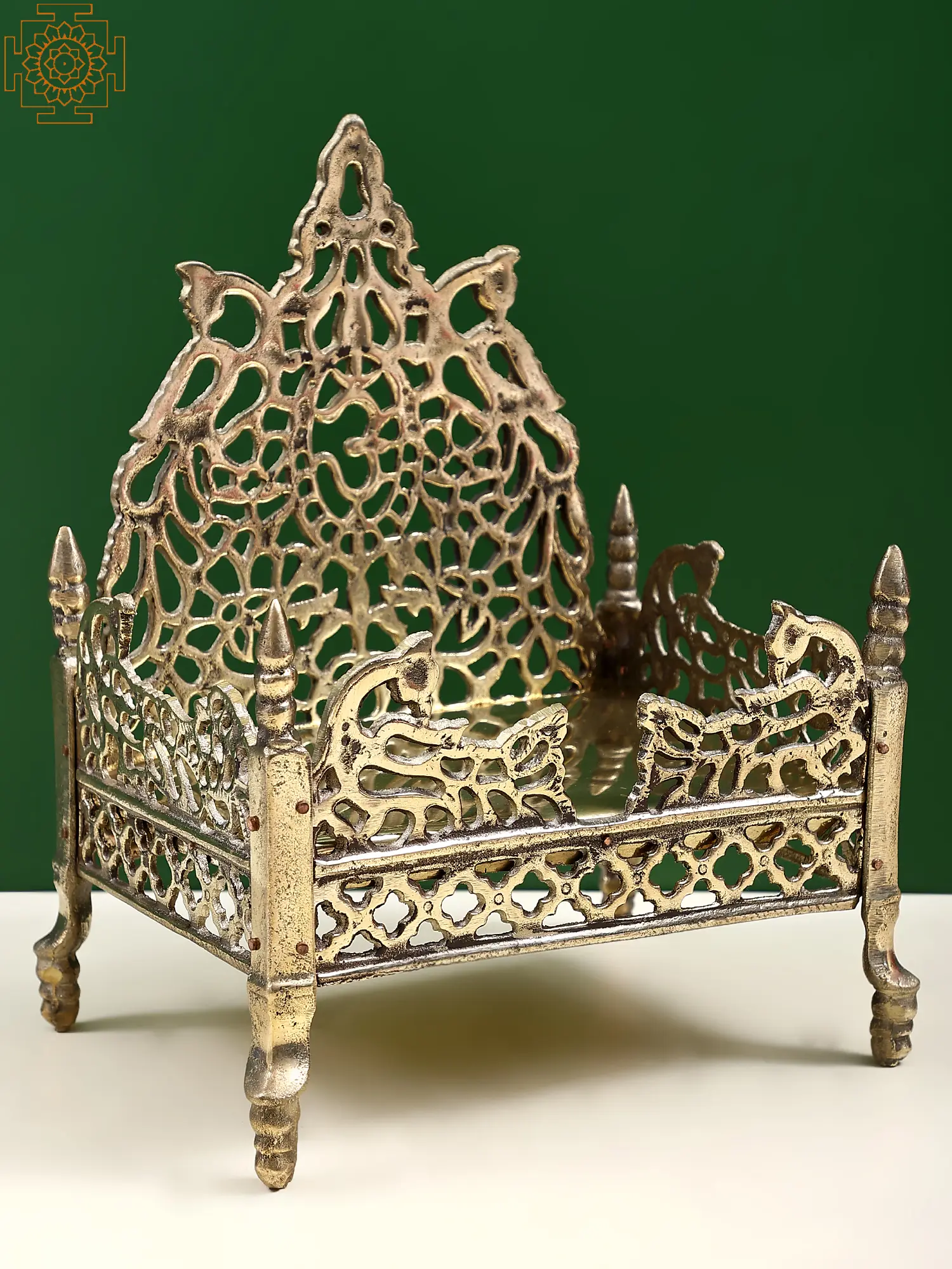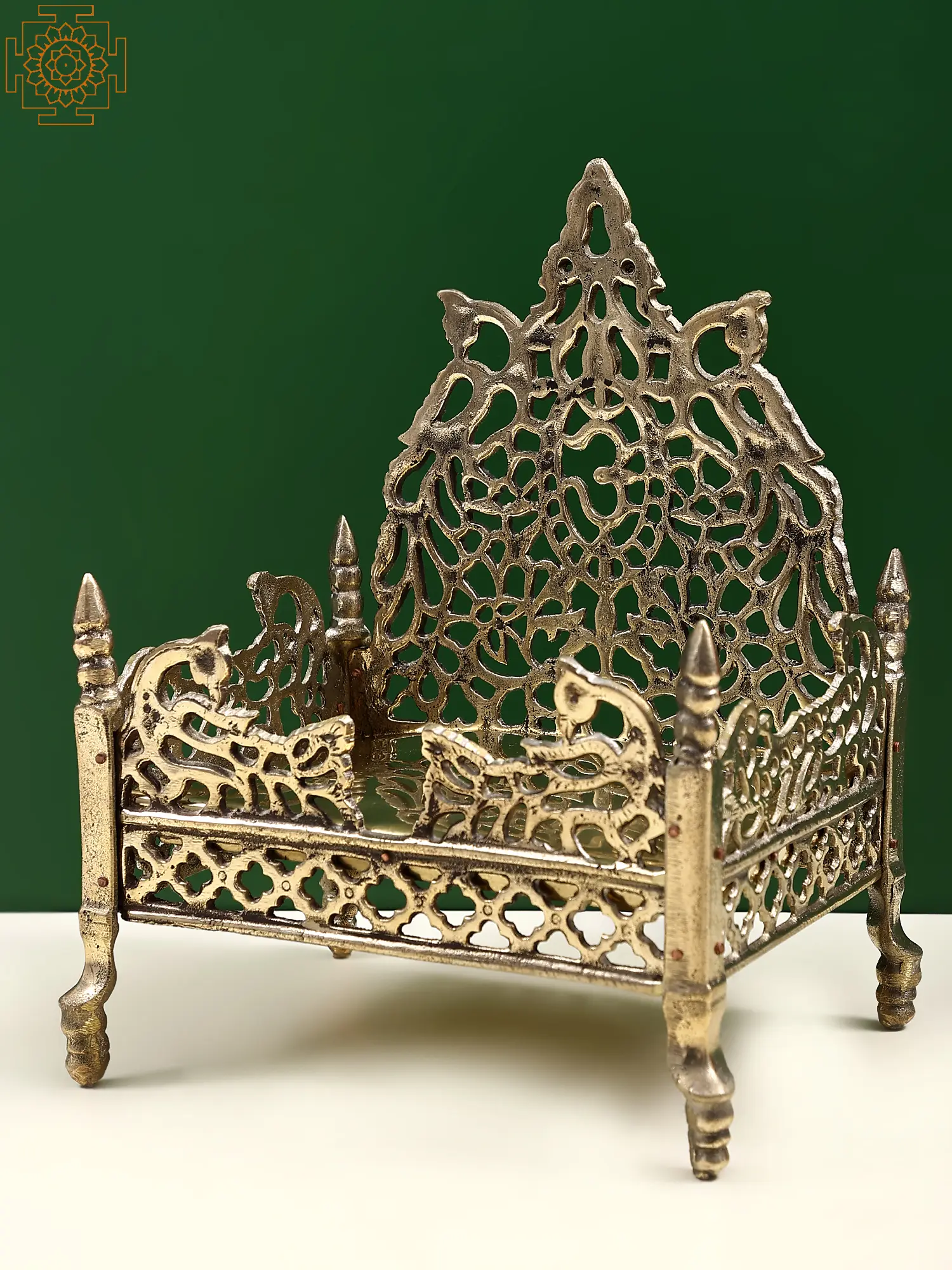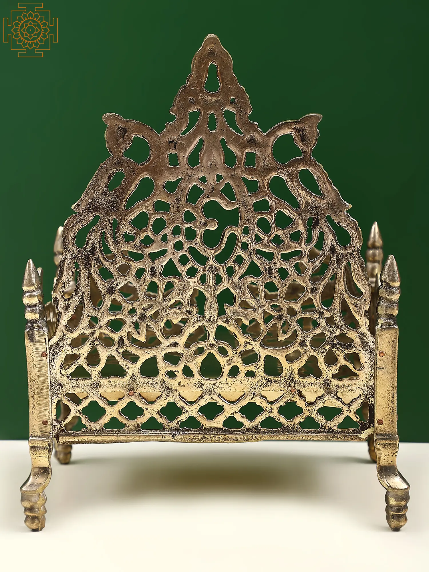 In Hindu tradition, placing the deities on a higher pedestal is a ritual and carries significance. Small thrones are made for small-sized deities. This brass throne is a significant ritual object that carries auspicious symbols of peacocks and Om. The peacocks are considered to be vehicles of many Gods and Goddesses. The Jaal work technique is used for making the boundaries of the throne and the symbols. The design gives a different dimension to the piece. This throne is a magnificent piece of art that enhances the look of a personal worship space.