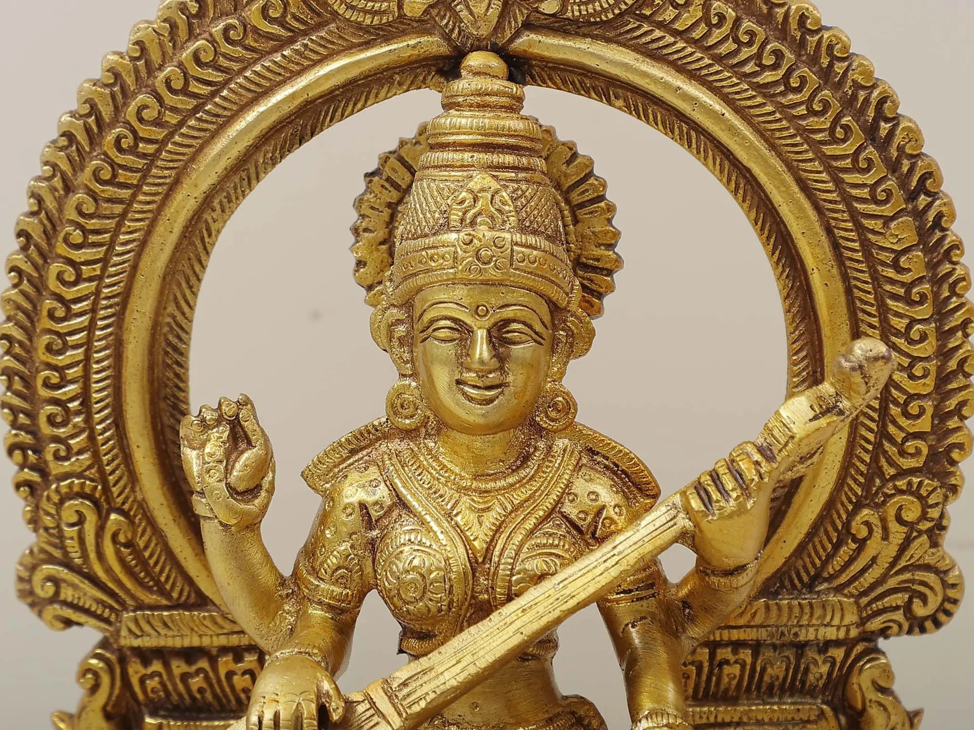 Seated within a beautifully crafted prabhavali (arch), she plays the veena, filling the surroundings with the mellifluous tunes of wisdom and creativity.