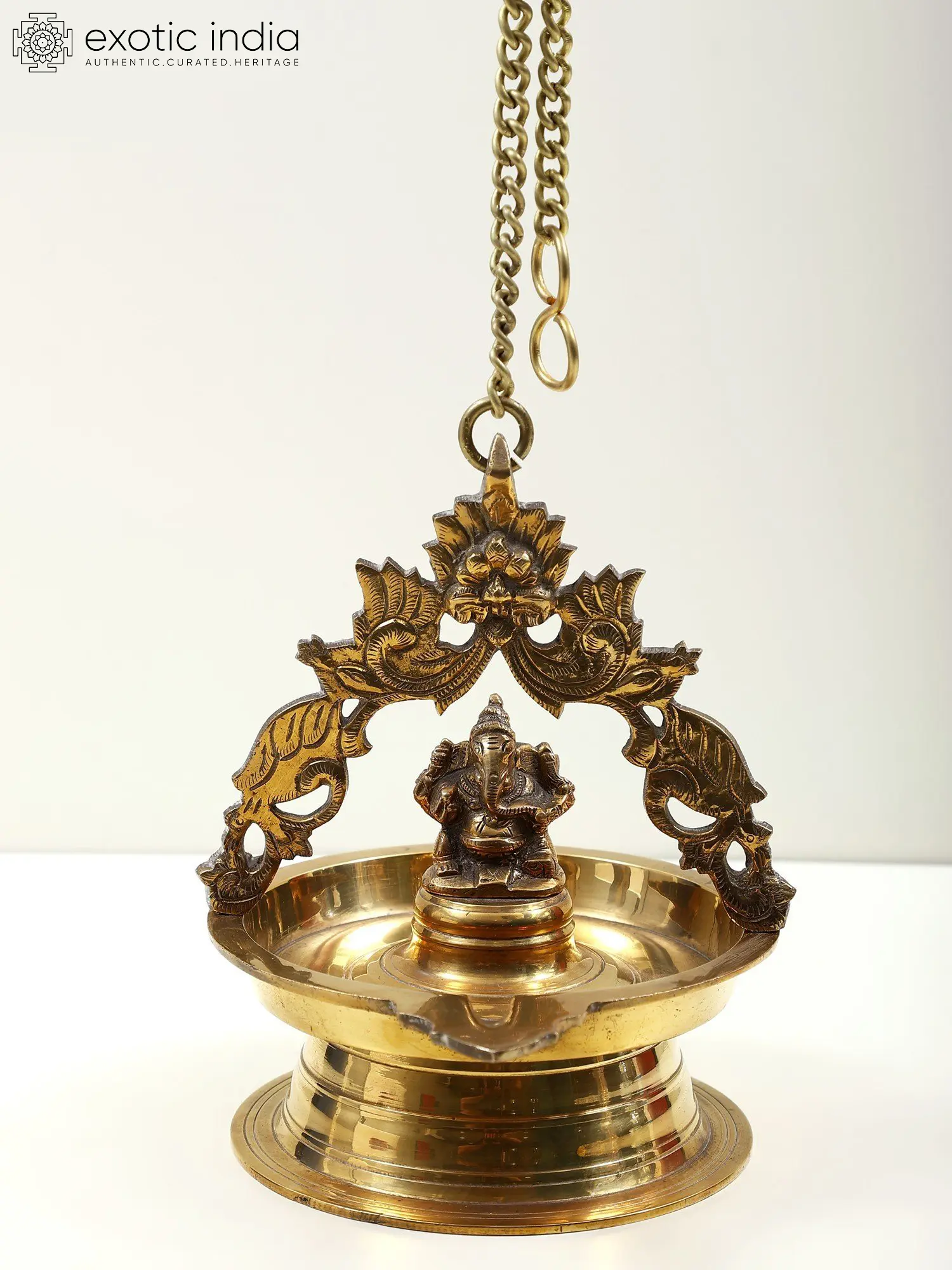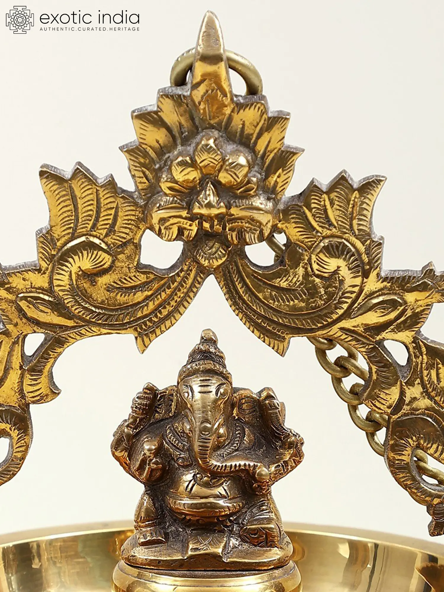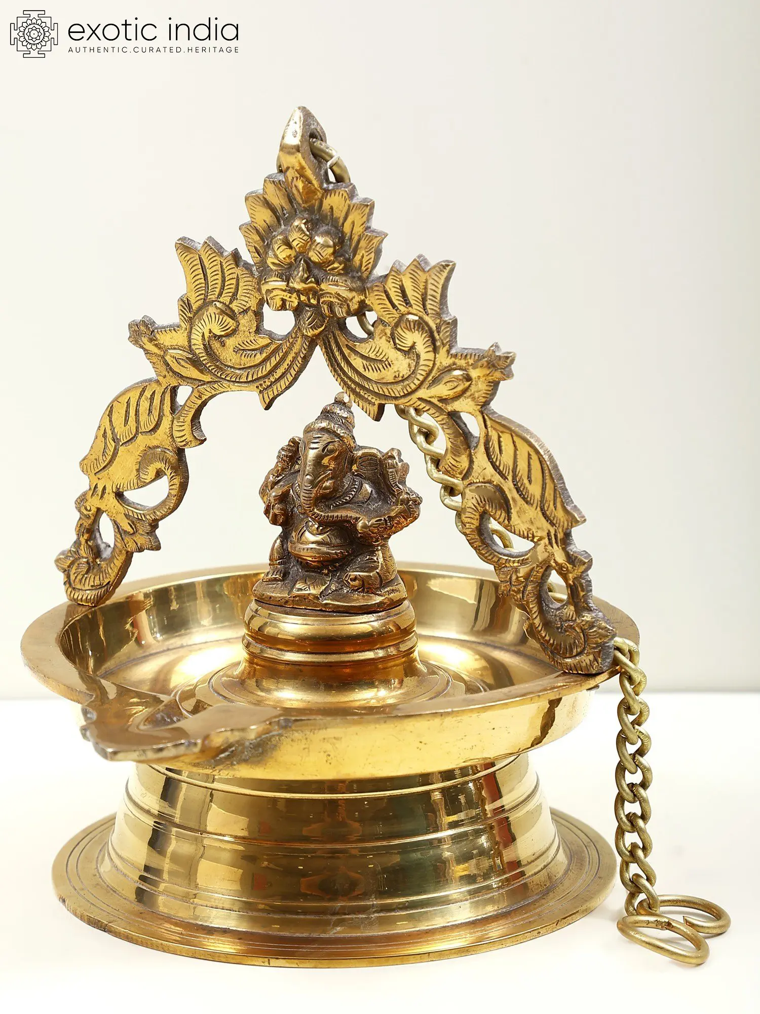 This brass wall hanging Diya with an intricate aureole, single wicks, and a Lord Ganesha pattern as the crown is a medium that combines the sanctity of Lord Ganesha's blessings with the warmth of light to unite the devotee with the almighty. The lamp's focal point the is aureole with a Kirtimukha at the center and covering the Lord Ganesha motif from all sides. The lamp has a traditional oil basin with a single wick. Lighting this lamp not only improves the appearance of the area but also adds a heavenly sensation to the worship place.
