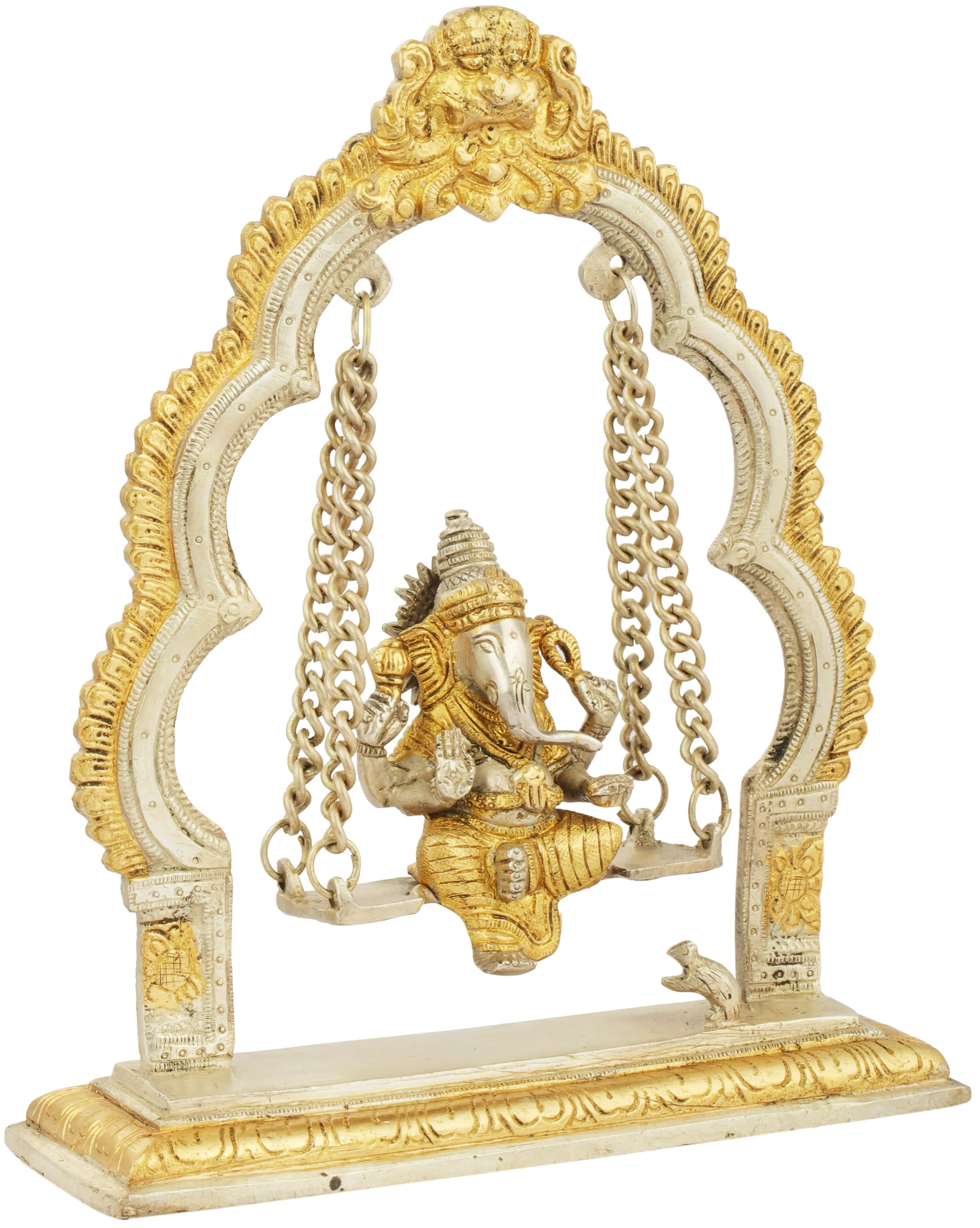 This Lord Ganesha Idol on a Swing with Kirtimukha in Brass is a divine embodiment of joy and auspiciousness. Ganesha, the revered remover of obstacles, sits gracefully on a swing, symbolizing the playful aspect of his divine persona. The swing, adorned with intricate details, adds a touch of festivity to the depiction. The presence of Kirtimukha, a mythical and majestic face often associated with Hindu art, enhances the sacred aura surrounding Lord Ganesha.