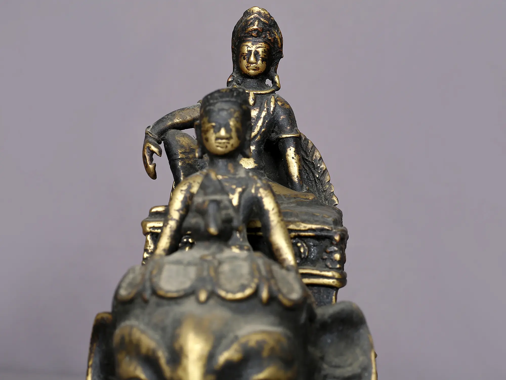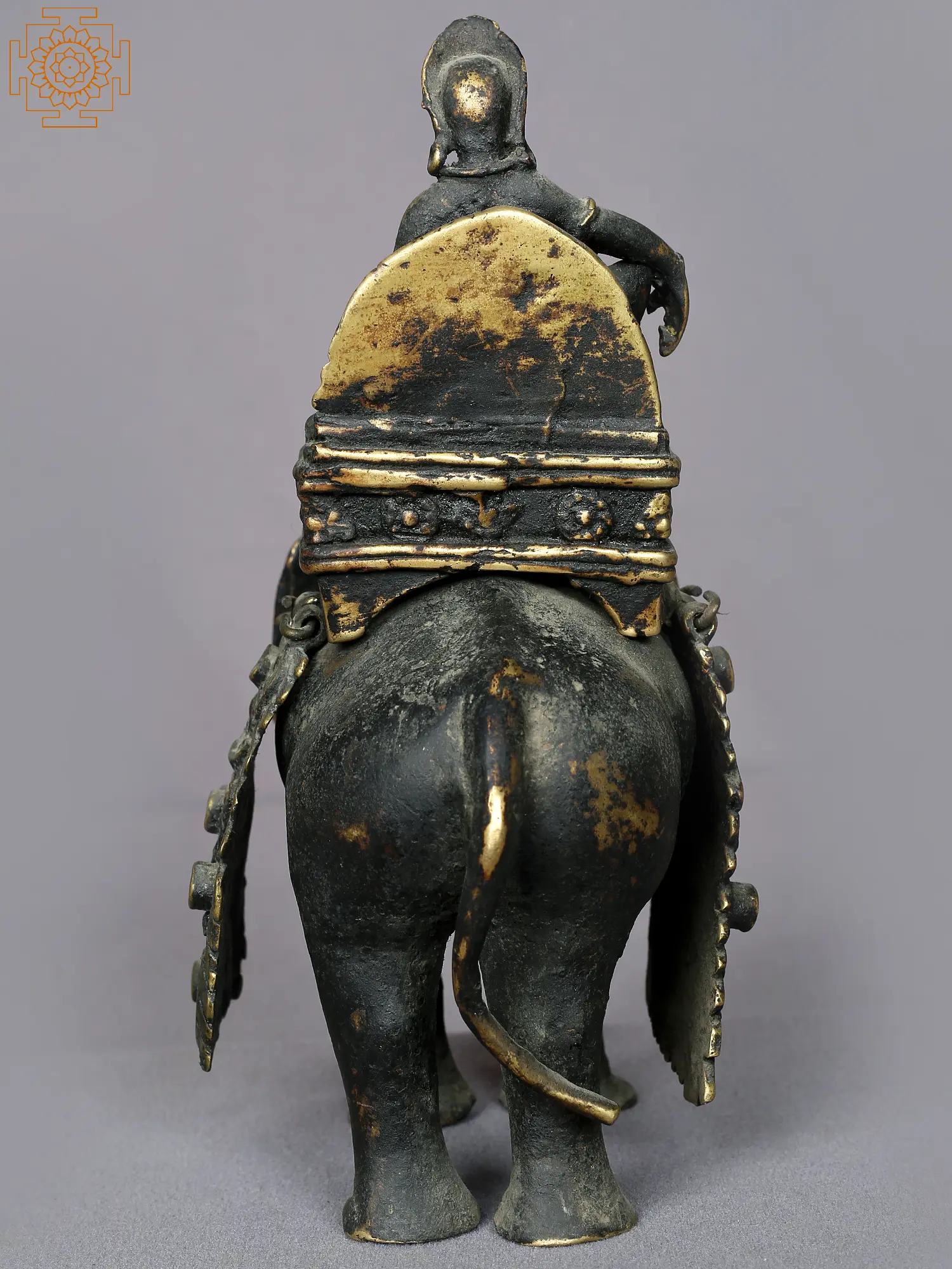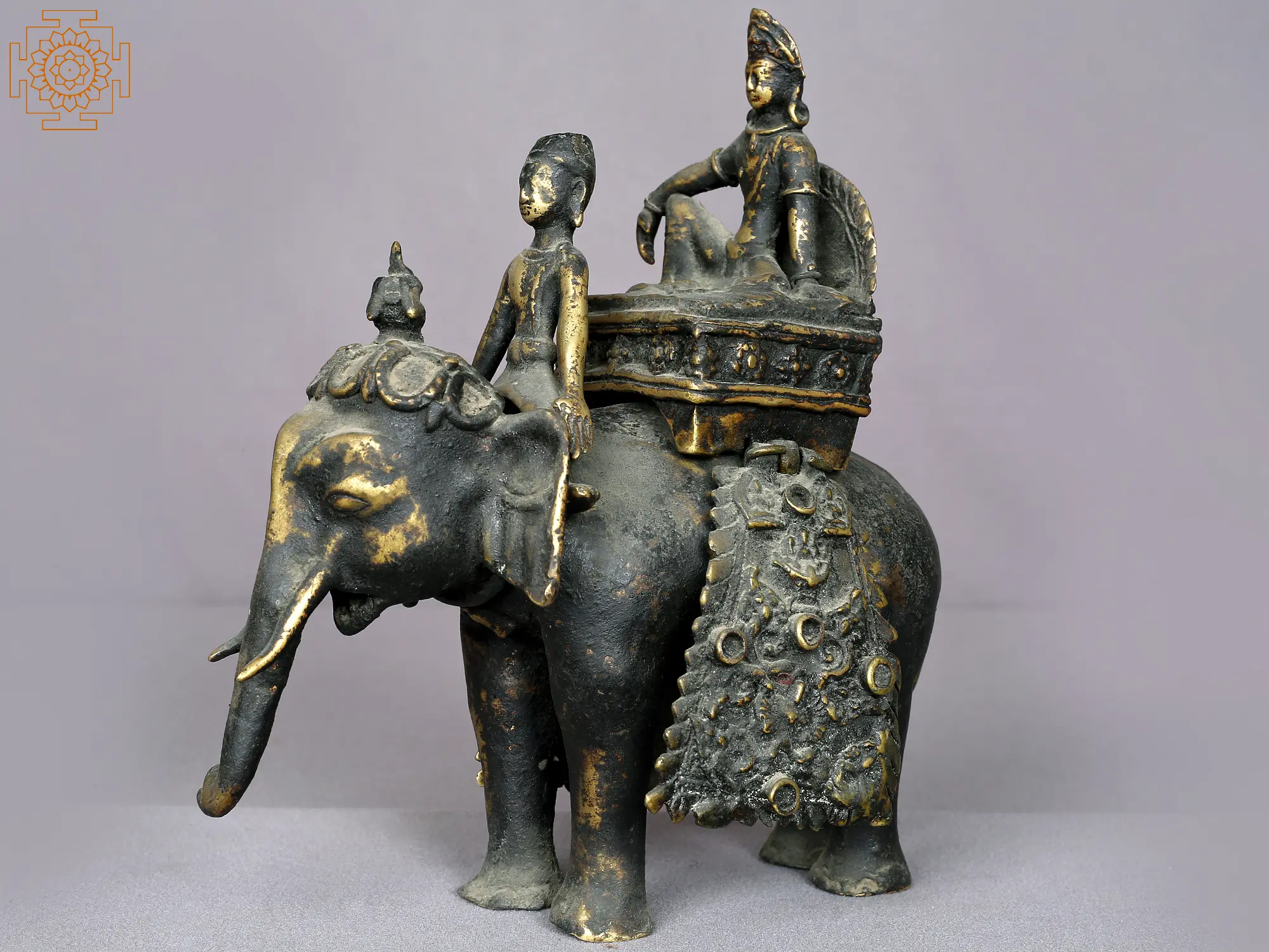 This brass statue from Nepal, depicting Indra seated on Airavat in a regal Maharajalilasana pose, reminds one of the many legends of the Lord of gods, Devaraja. Accompanied by a Mahawat (elephant rider), Indra exudes grandeur and divinity. Adorned beautifully with paraphernalia, Airavat has a pot of ambrosia on his head, symbolizing eternal life.