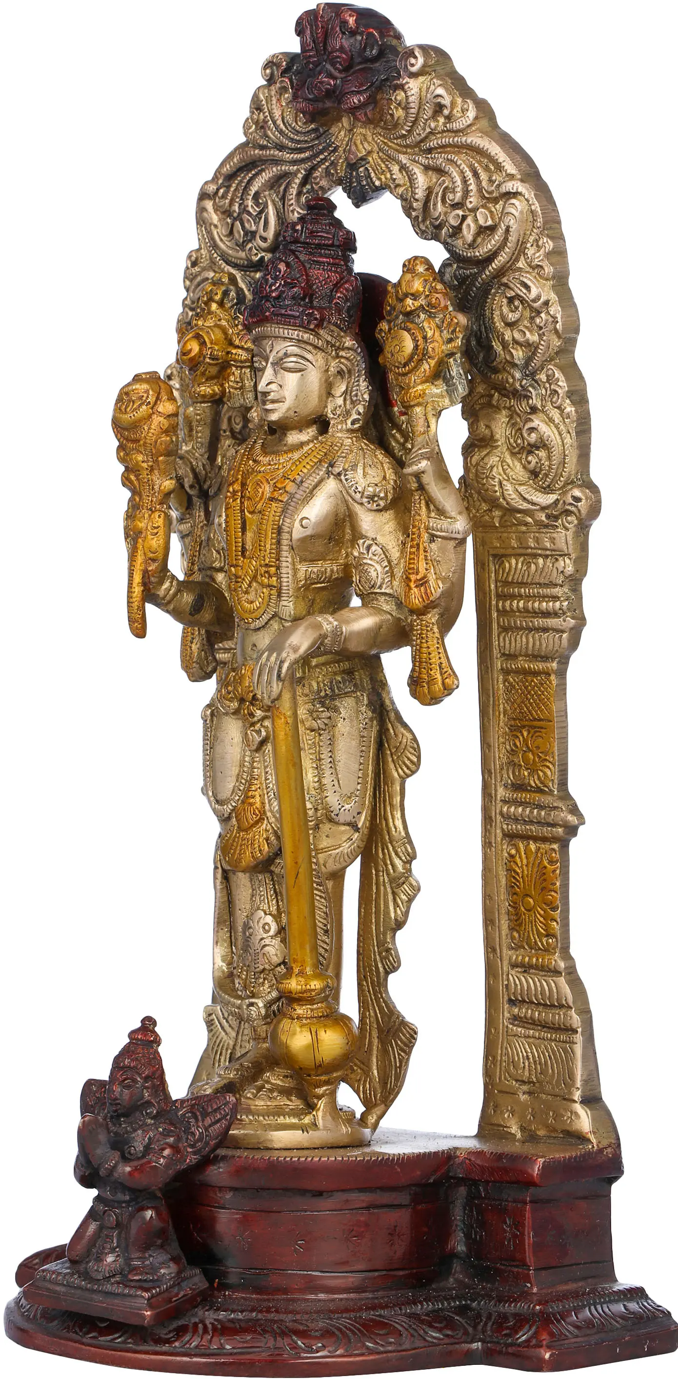 Experience the divine energy of Lord Vishnu with this magnificent brass statue. Lord Vishnu, the preserver and protector, is a prominent figure in Sri Vaishnava tradition. This statue portrays Lord Vishnu standing on a Garuda pedestal, symbolising his eternal vigilance. Display it in your home to invite blessings of protection and preservation, in alignment with the sacred principles of Hinduism.