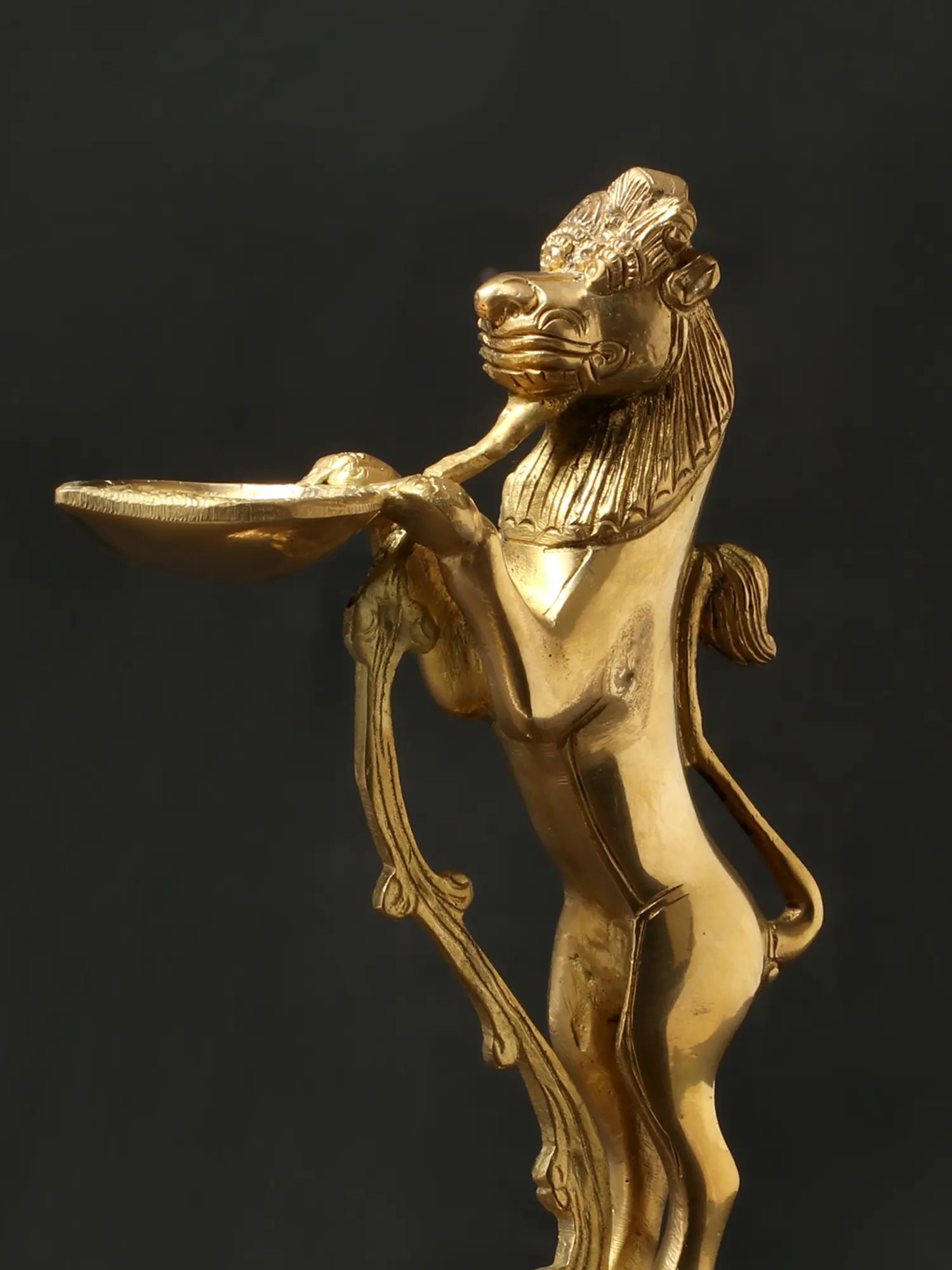 Illuminate your sacred space with the radiant presence of this exquisite brass Yali lamp. A creature of myth and legend, the Yali, often depicted as a fantastical hybrid combining the attributes of a lion, elephant, and horse, is a powerful symbol of strength, protection, and auspiciousness across various South Asian traditions. This intricately crafted piece captures the Yali in a dynamic posture, standing tall and vigilant, its paws resting gracefully on a detailed base.