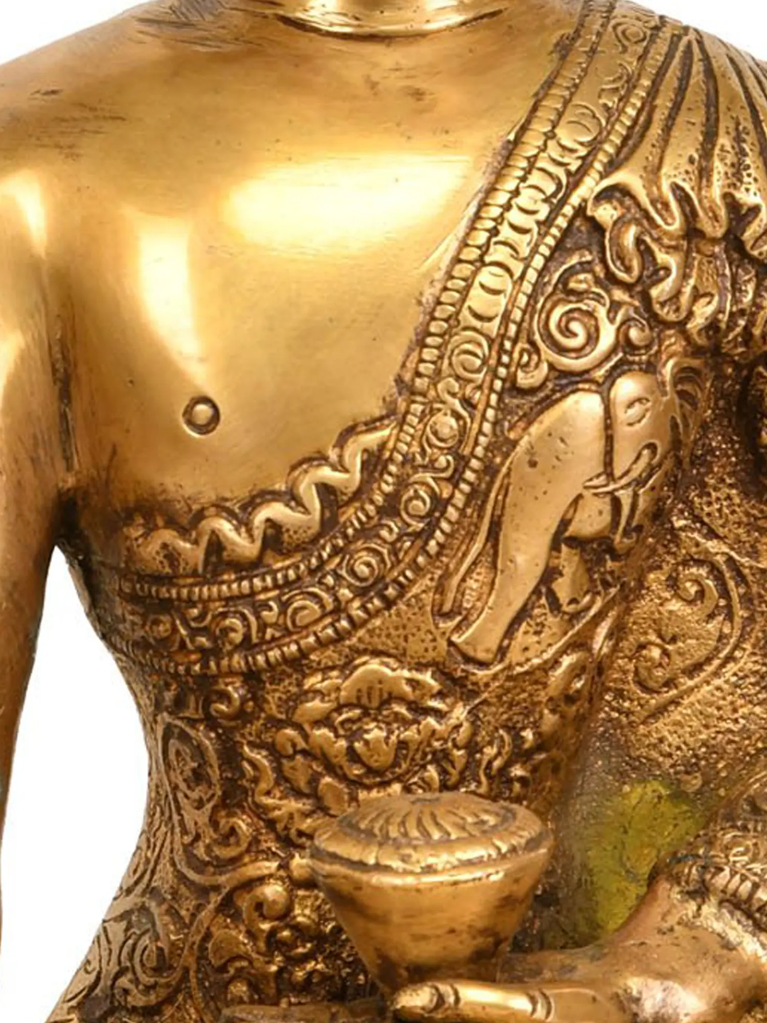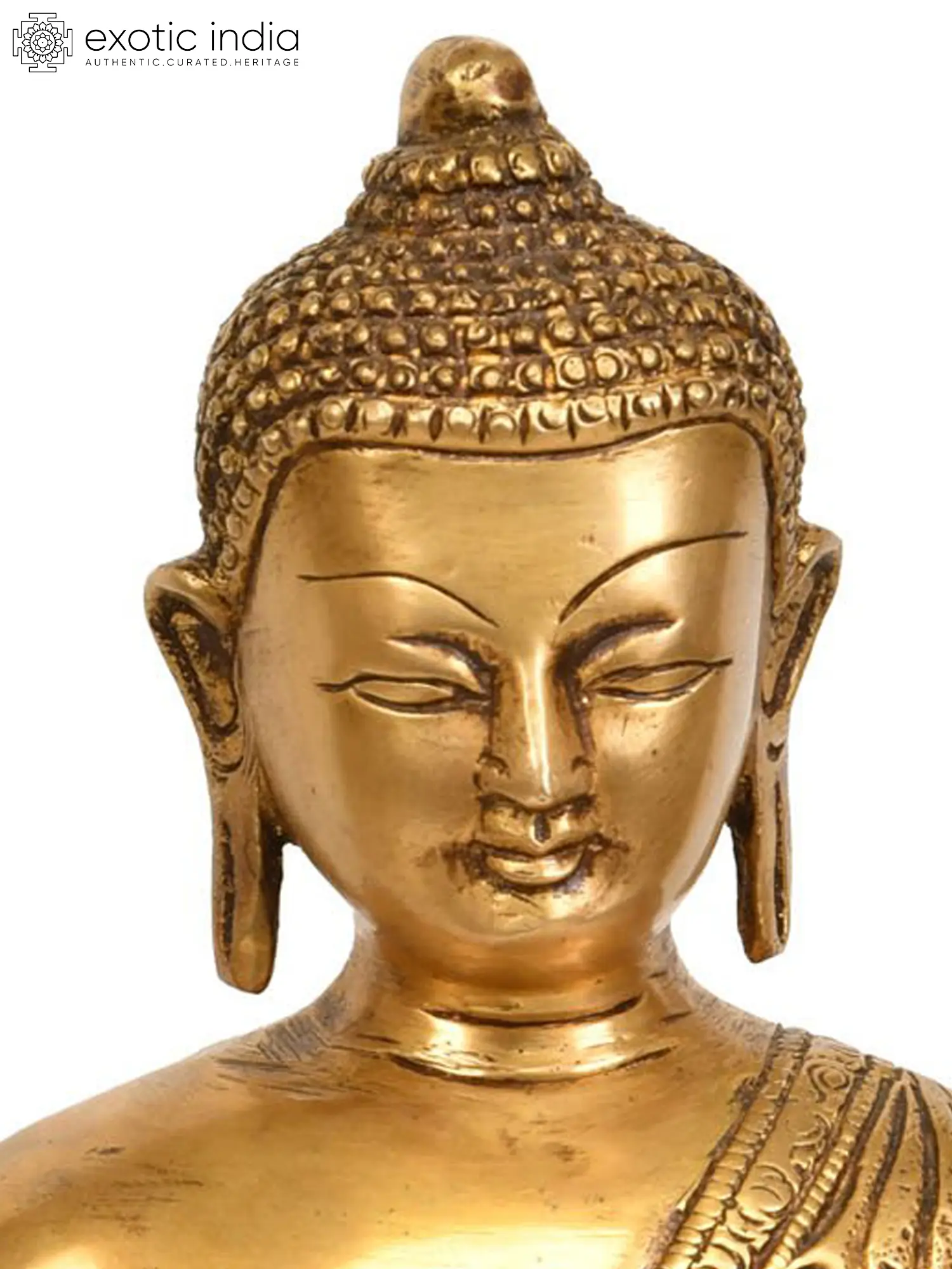 9" Buddha Seated in Bhumisparsha Mudra (Robes Ornately Decorated with Auspicious Symbols and Jataka Animals) In Brass | Handmade | Made In India