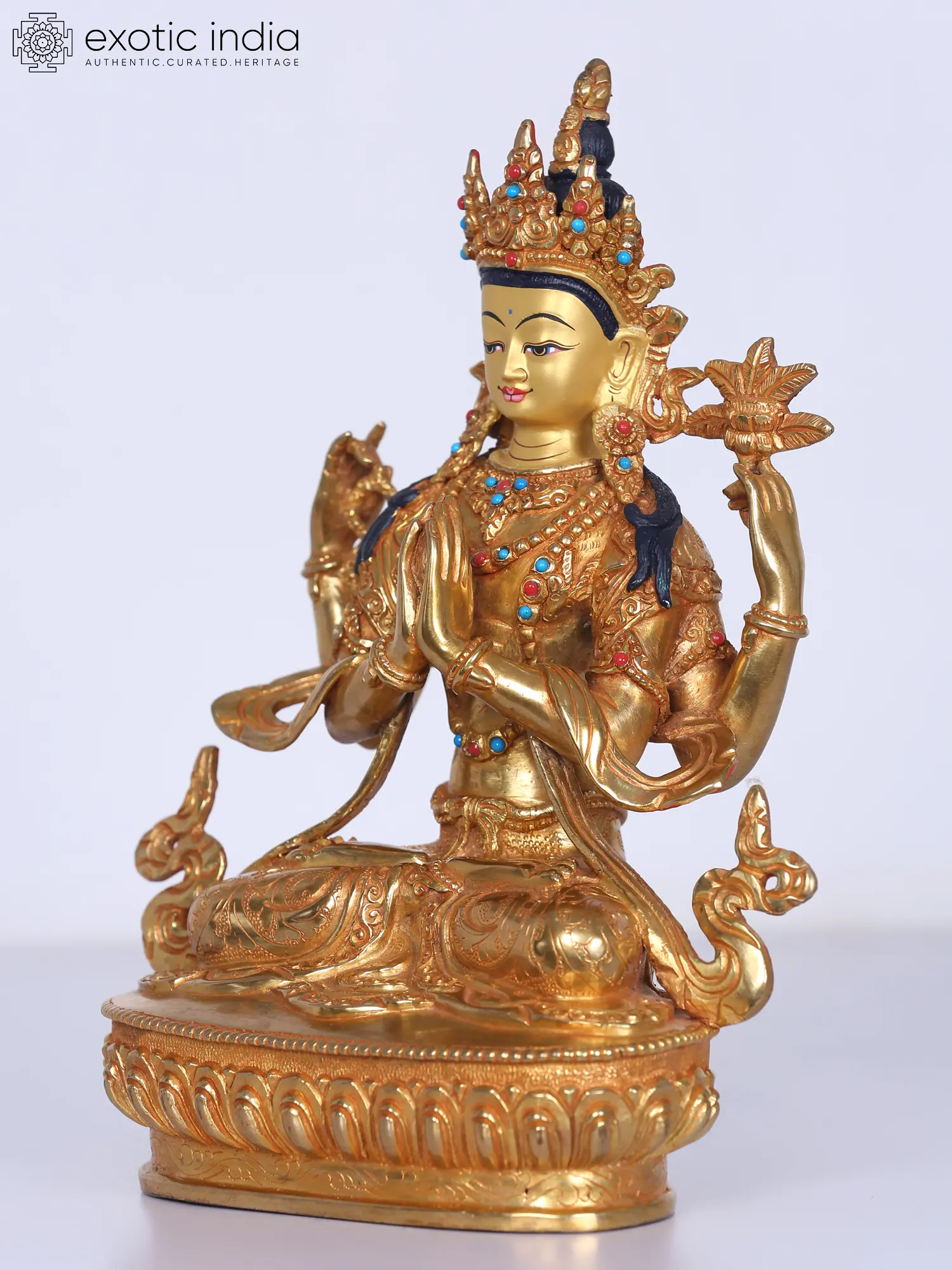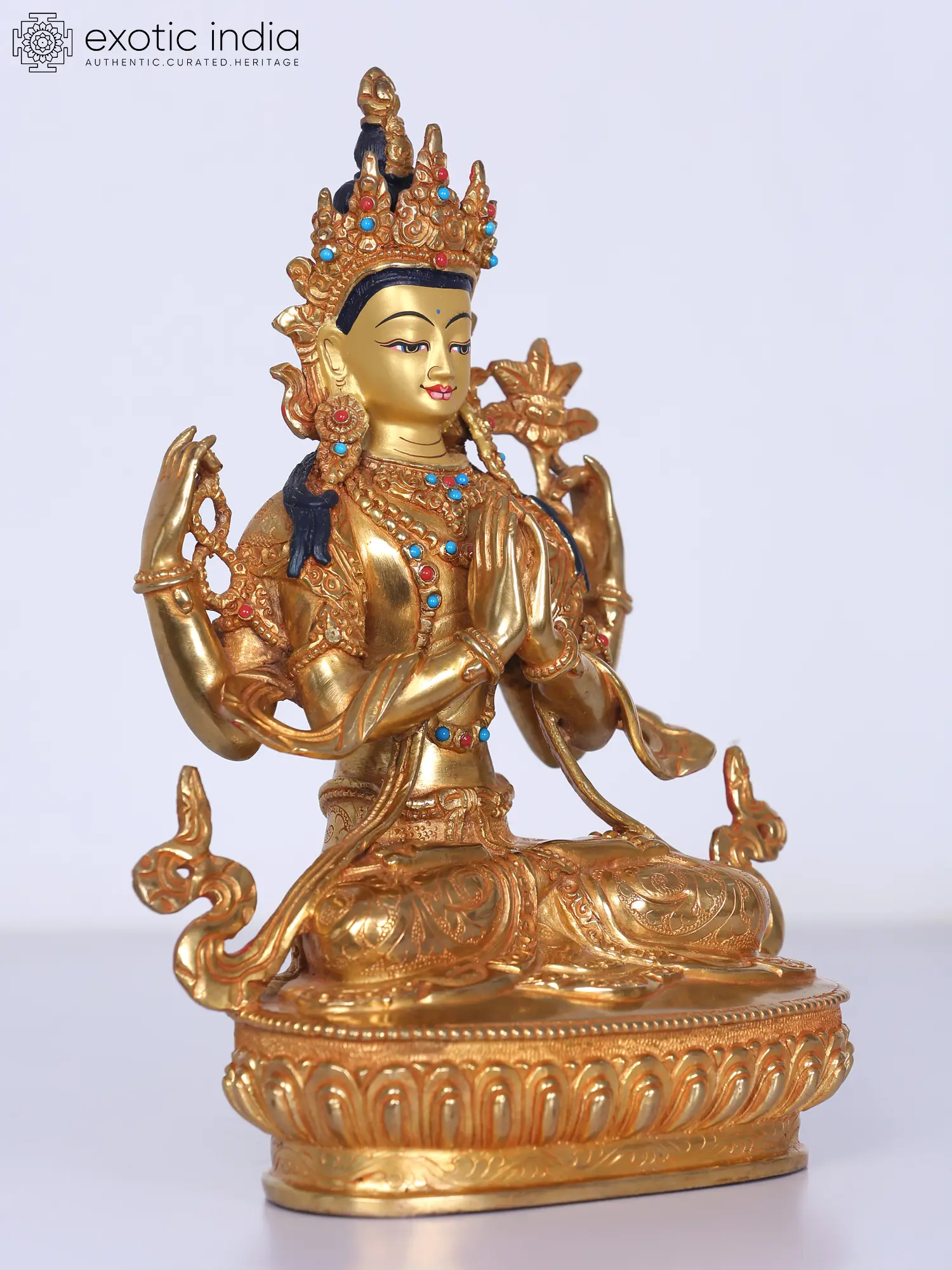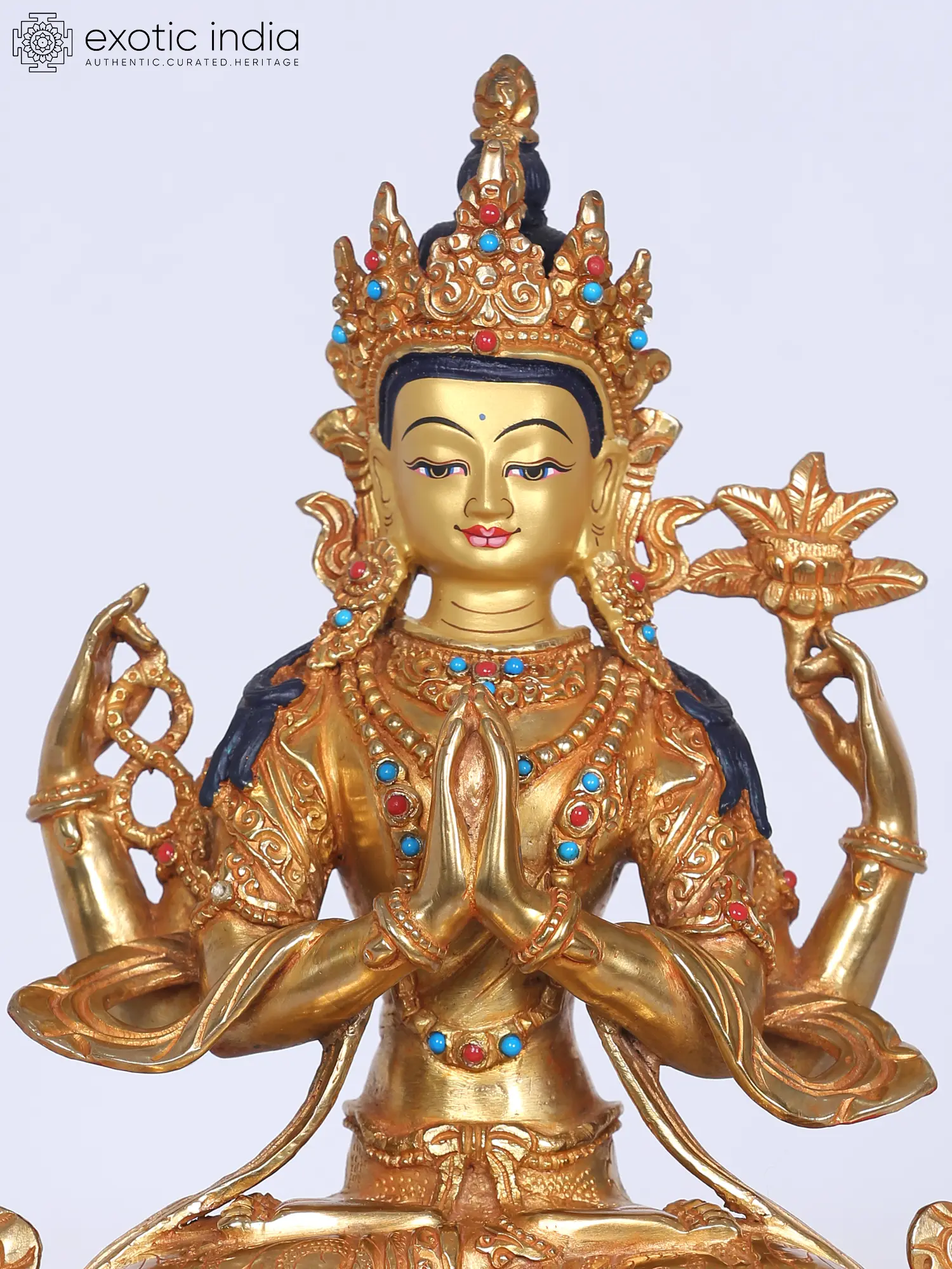 Enter the realm of Tibetan Buddhism, and you encounter the compassionate Bodhisattva, Chenrezig, an embodiment of altruistic love and boundless empathy. As the heartful emanation of Avalokiteshvara, Chenrezig stands with the countenance of serene compassion, adorned with four arms, each gracefully holding symbols that weave a tapestry of universal benevolence. In his primary hand, Chenrezig cradles a wish-fulfilling jewel, an emblem of his altruistic intent to fulfill the aspirations of all sentient beings.