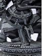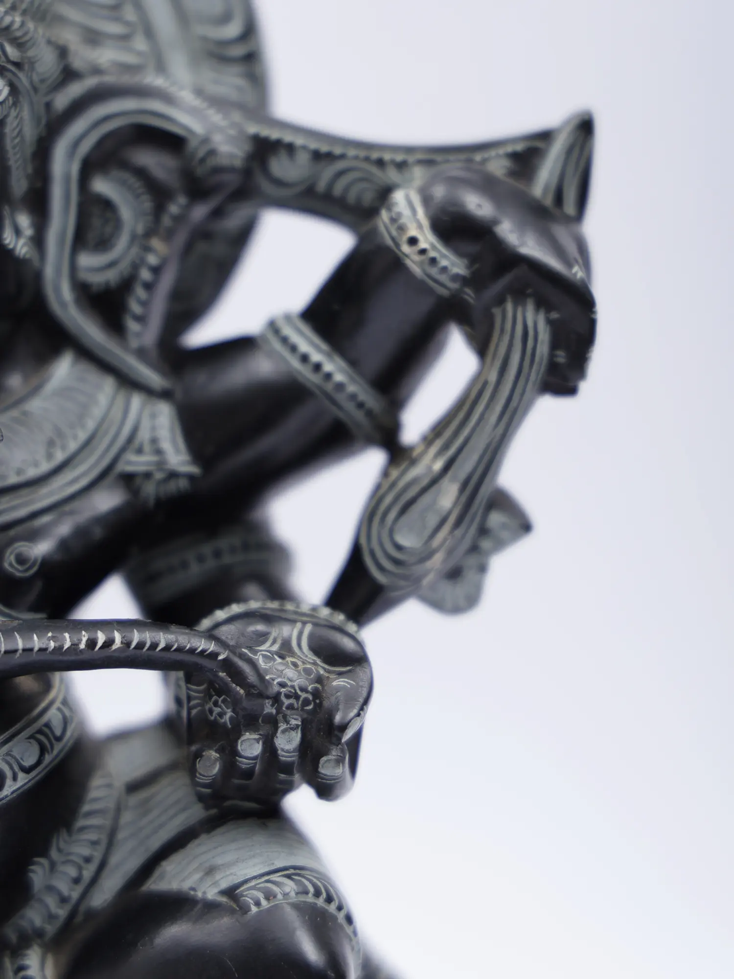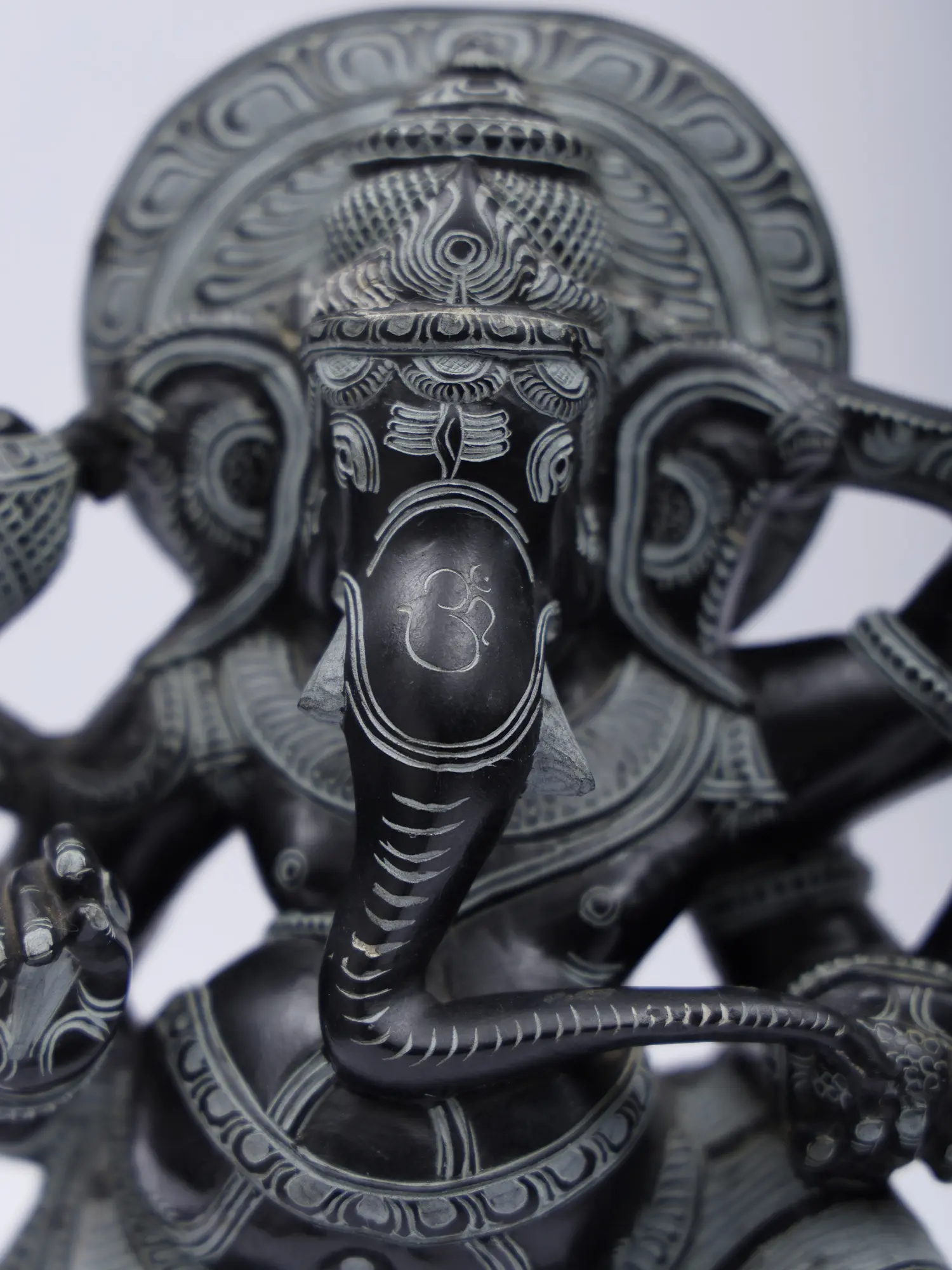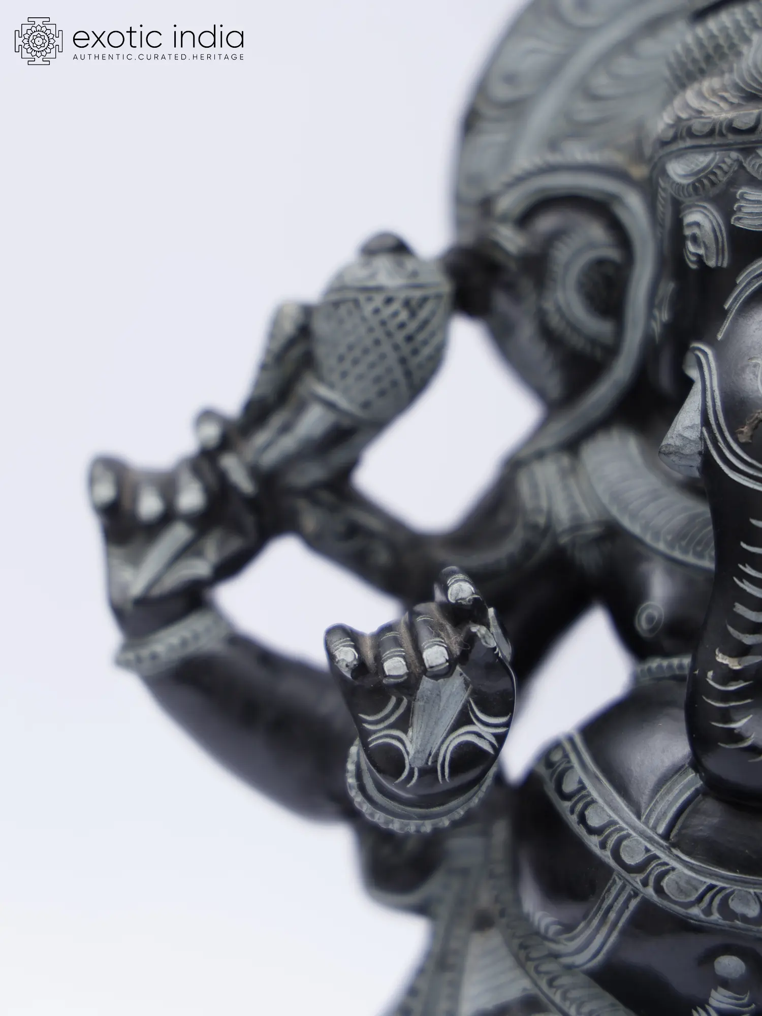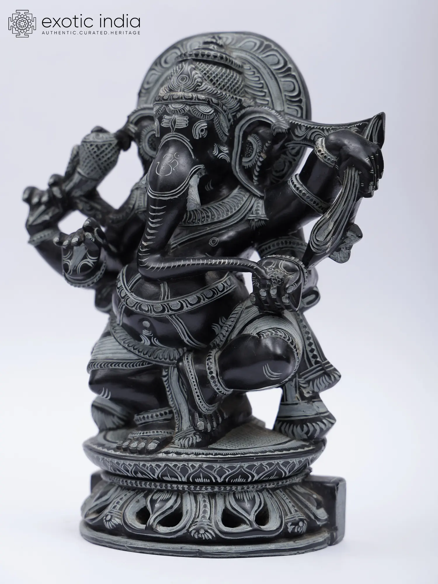 This exquisite 9-inch Dancing Ganesha statue, meticulously crafted from Katappa stone, is a captivating representation of the beloved Hindu deity. The deep black stone, accented with lighter grey detailing, showcases the intricate artistry of traditional Indian sculpting. Ganesha, the remover of obstacles and the god of beginnings, is depicted in a dynamic pose, embodying his playful and powerful nature. The statue's elegant design and high-quality craftsmanship make it a stunning addition to any home or collection. Its size (9.7 x 7.3 x 3.2 inches) is ideal for display on a mantelpiece, shelf, or altar.