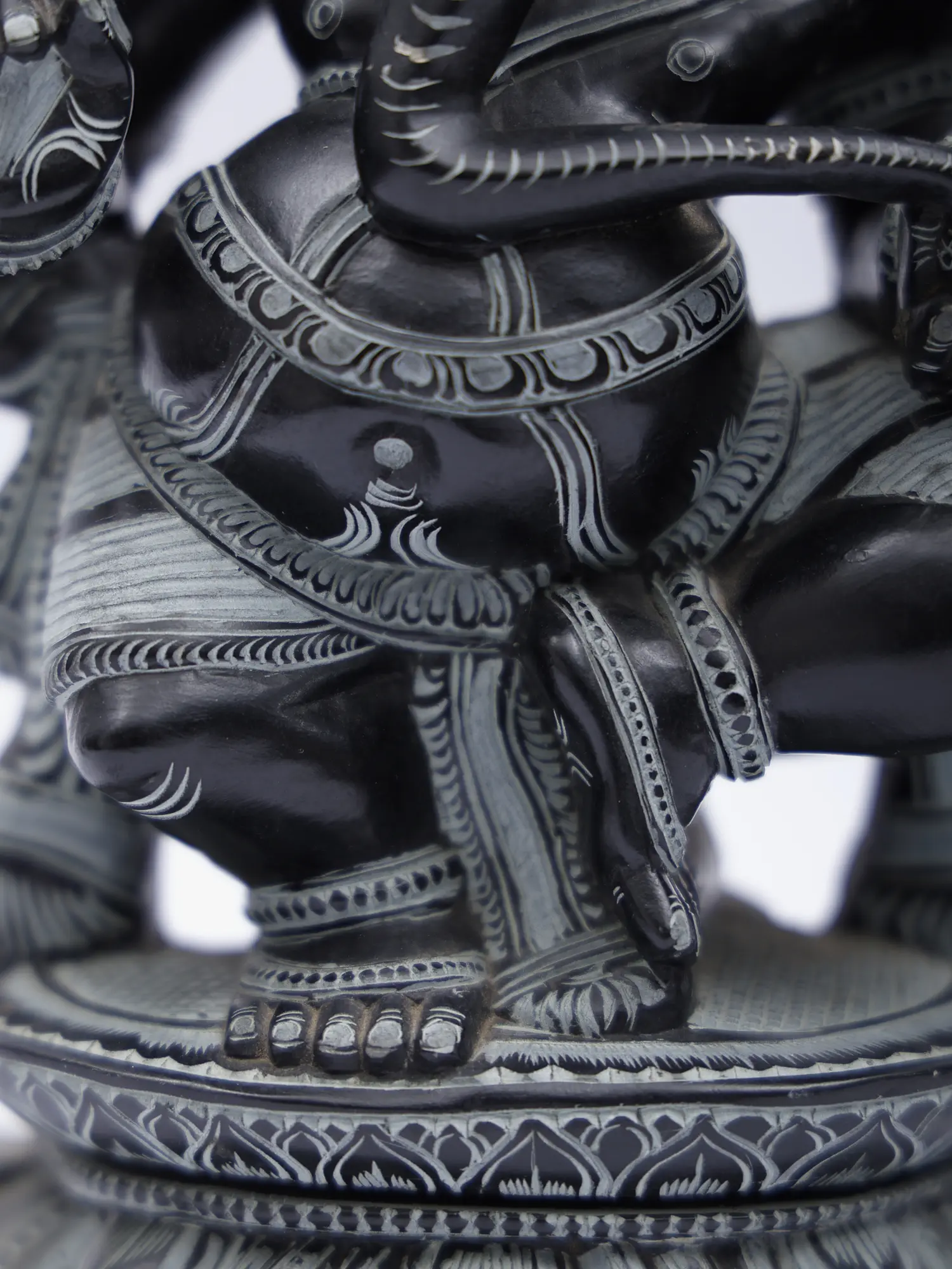 This Ganesha statue is carved from Katappa stone, a material known for its unique dark color and ability to hold intricate detail. The skilled artisans have captured the nuances of Ganesha's form with remarkable precision, highlighting the texture of the stone and the graceful flow of the sculpted lines. The intricate detailing, from the delicate patterns on his clothing to the expression on his face, speak to the dedication and expertise that went into creating this piece. Katappa stone, with its rich texture, ensures longevity and a timeless feel to this masterpiece. The darker shade of the stone adds an air of mystery and enhances the statue's overall visual appeal.