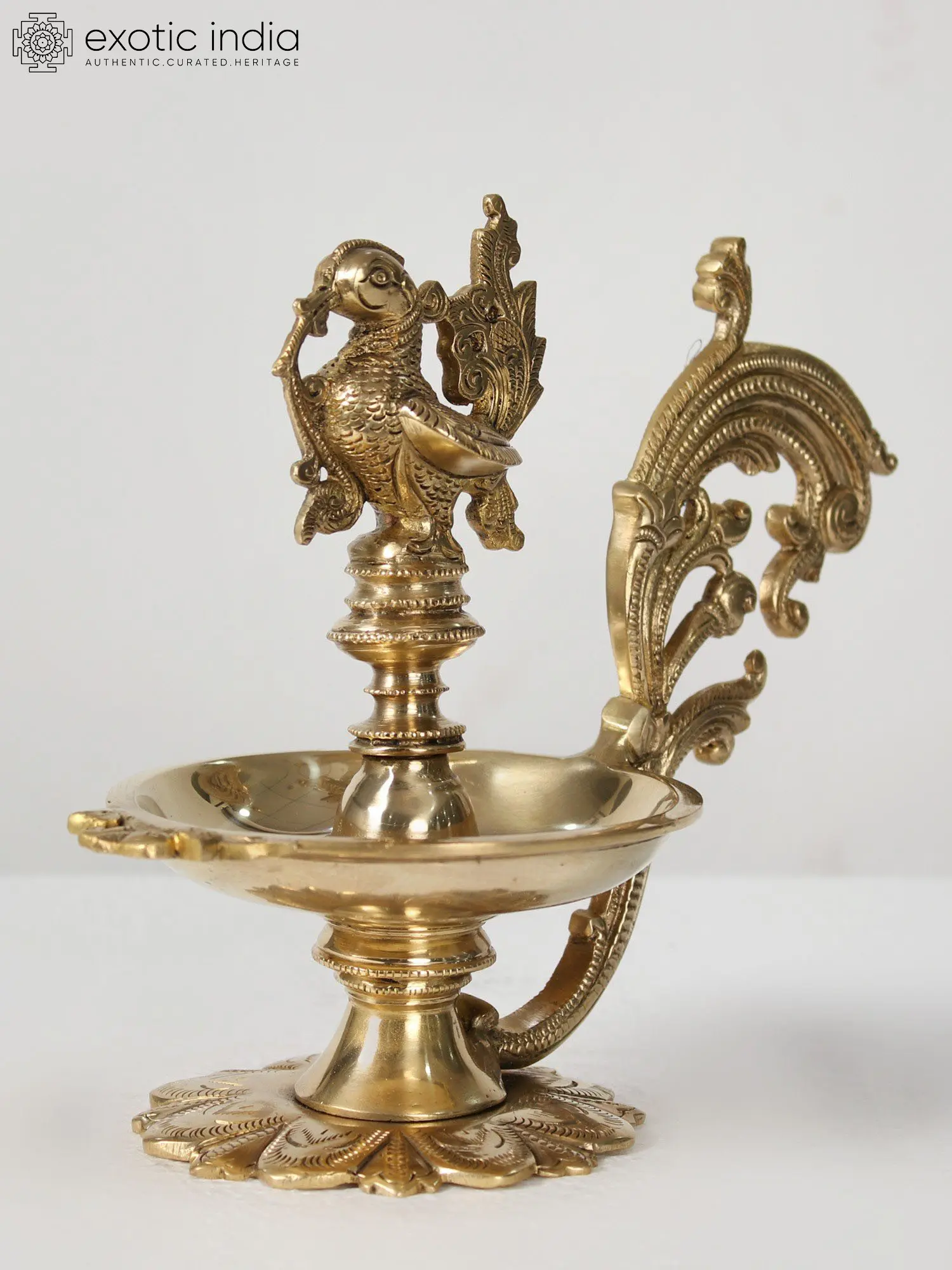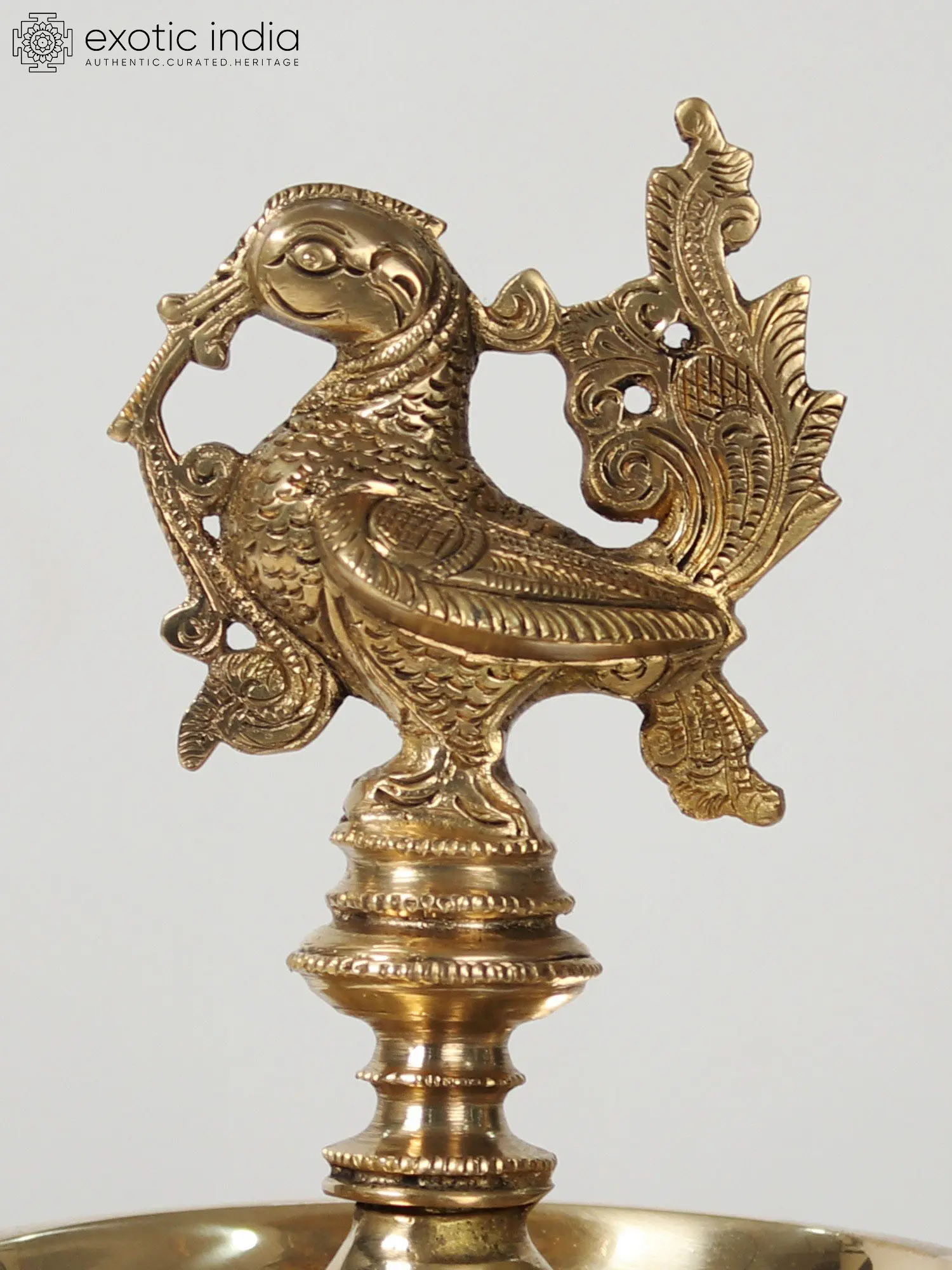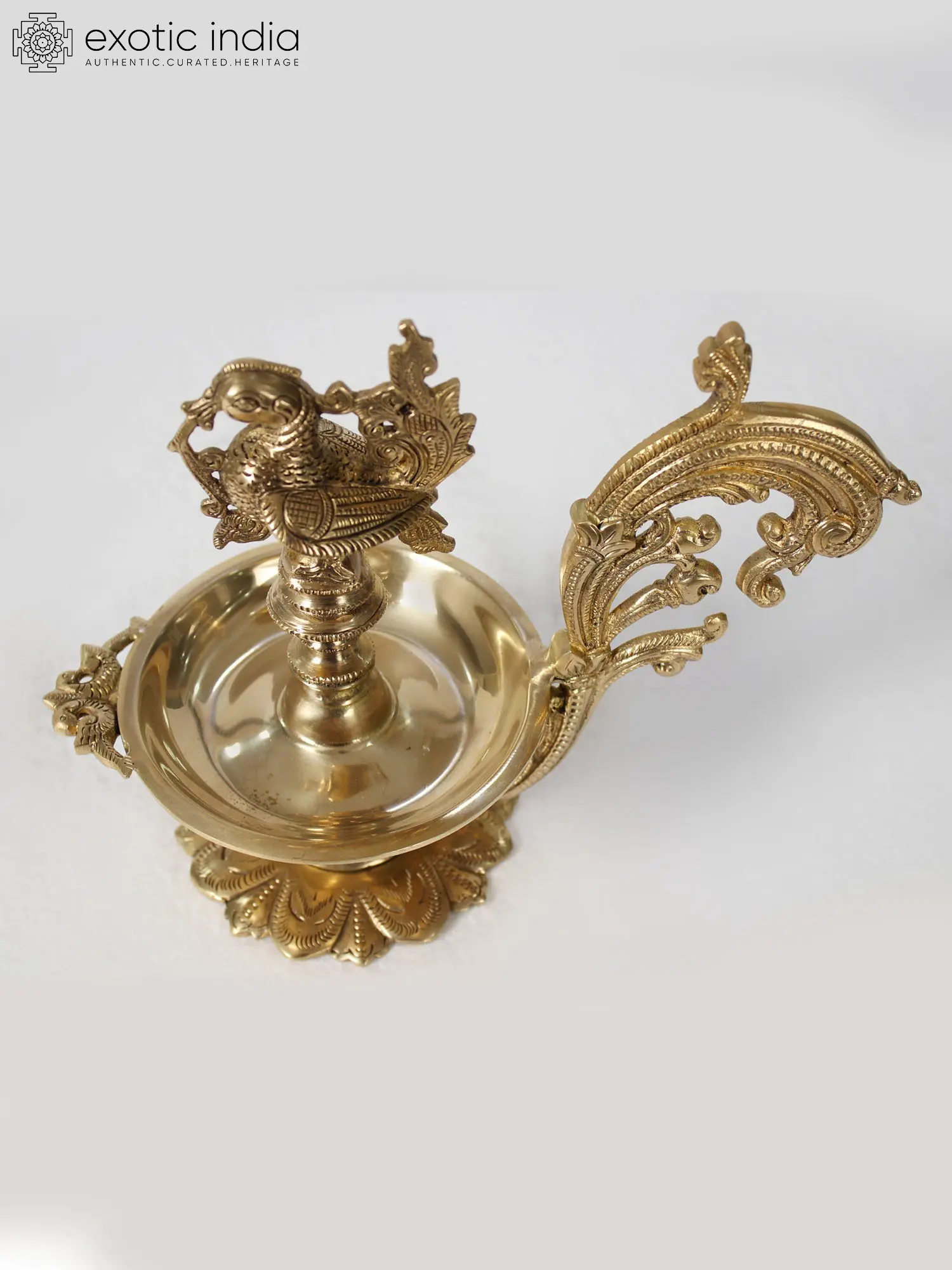 This stunning brass lamp, with a core theme of a lovely peacock clutching a branch in its beak, is the realization of the artist's most beautiful dream. The lotus-stand lamp features a central oil basin with a single wick and a peacock design in the center. The lamp's handle is embellished with a coiling vine design. The peacock, a symbol of grace and success, is honored in this lamp, and when lighted, it may bring the auspiciousness of symbolism into a location.