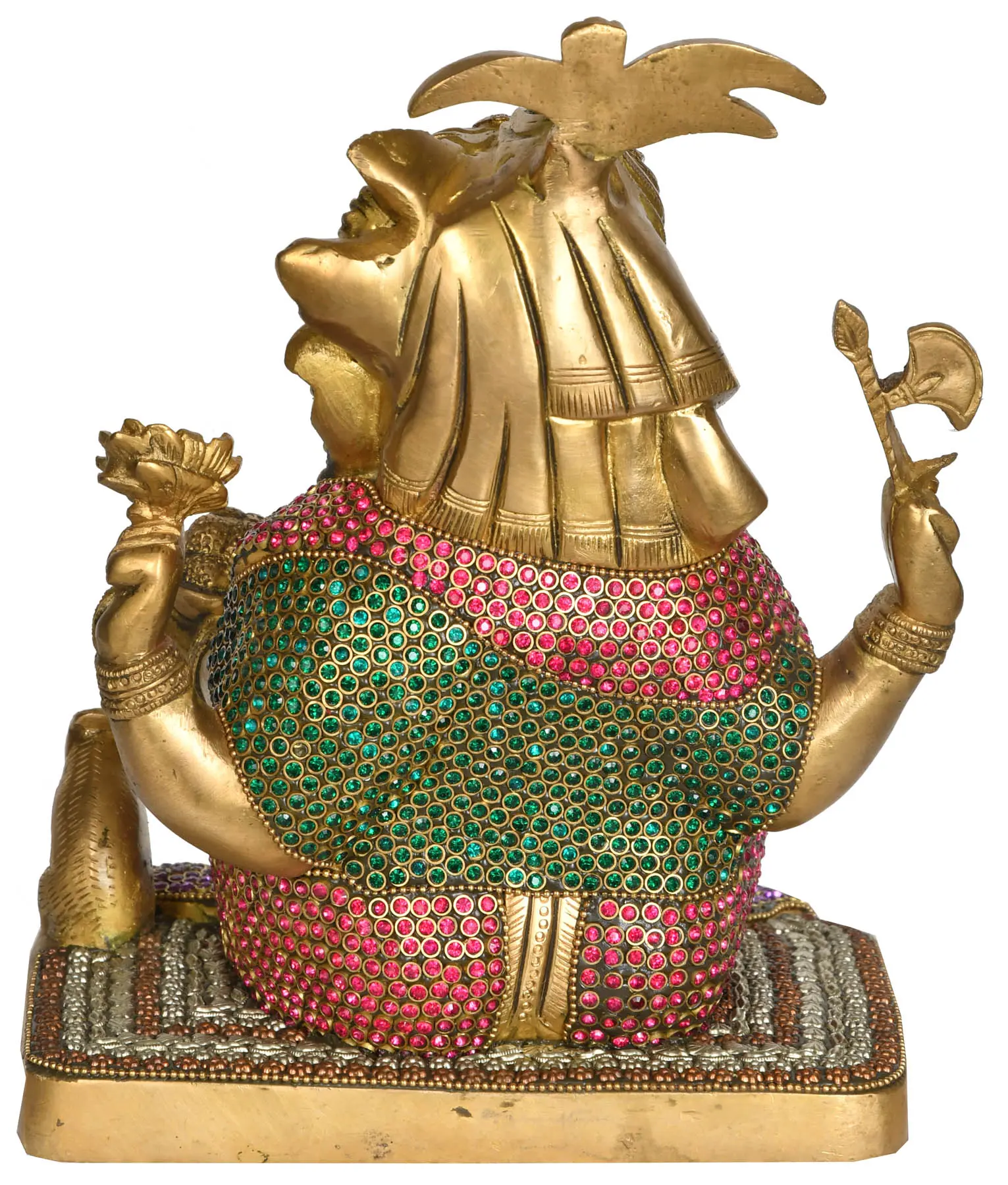 What truly elevates this idol is its elaborate embellishment. The brass form is adorned with a vibrant mosaic of colorful stones. The chest and belly are intricately covered in shimmering green and bright pink stones, creating a dazzling effect. The ears are highlighted with deep blue stones, adding a regal touch. The base and the deity's lower garments are further decorated with a spectrum of purple, red, and silver accents, forming a rich tapestry that signifies prosperity and abundance. These inlaid stones not only enhance the aesthetic appeal but also symbolize the manifold blessings that Lord Ganesha bestows upon his followers. The overall effect is one of opulence, divine grace, and auspiciousness.