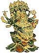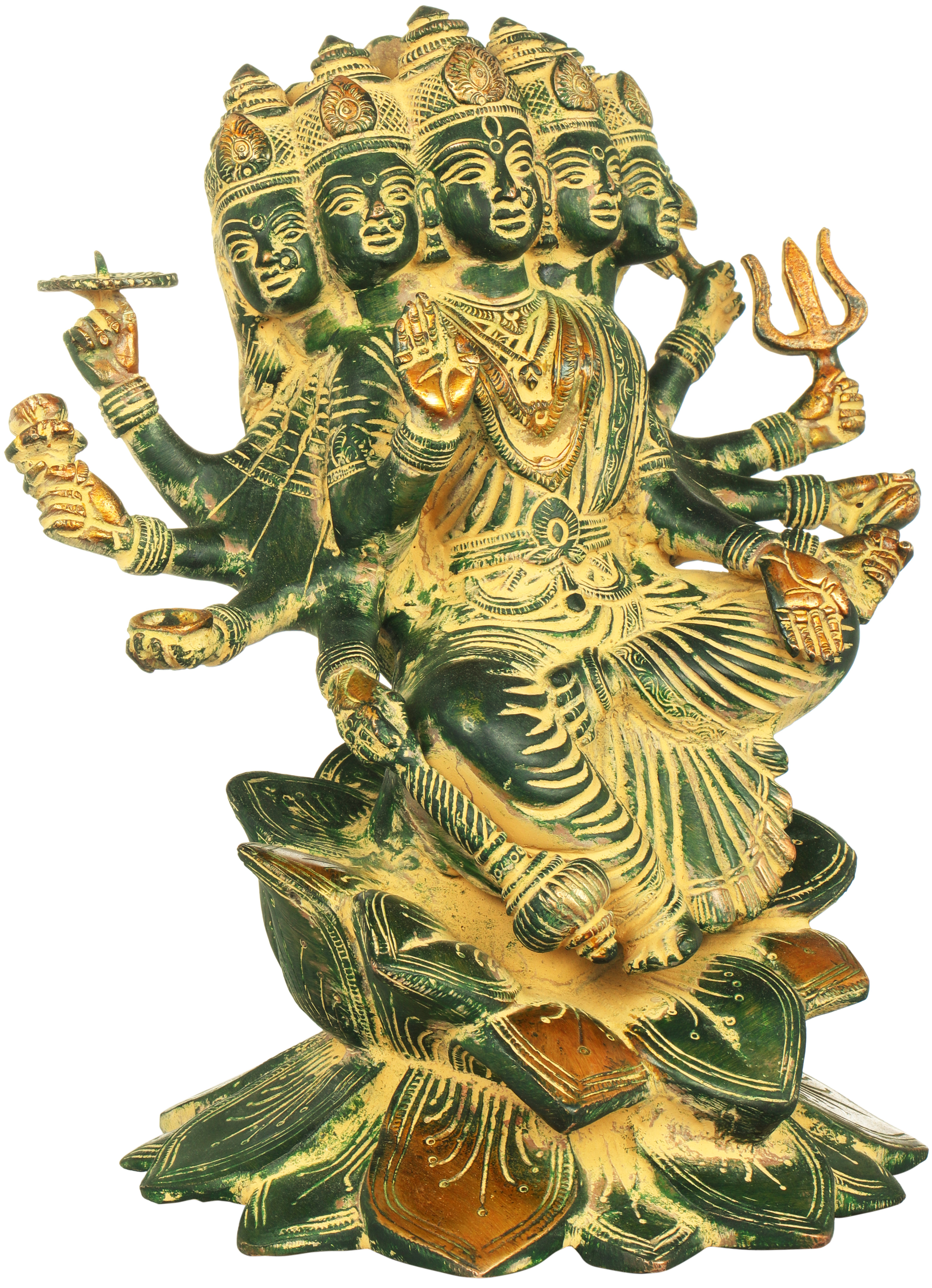 Anybody even remotely associated with Indian culture has listened to and probably chanted the Gayatri mantra, an amalgamation of sacred Sanskrit syllables that expresses one's veneration of Paramatma. Many sources identify Her to be the prakriti roopa of Gayatra (Savitra), a solar deity described in the Vedas. The Devi Gayatri is the parlokiya (otherworldly) personification of this all-important mantra, wife of the majestic Sadashiva, and a roopa of Parvati. Like Her husband, She is panchamukhi (five-headed) and dashabhujadhari (ten-armed), the most powerful form of the Hindu Devi that there is. In each of Her hands are dharmic implements such as the begging bowl, the dharmachakra, and divine weapons to defeat adharm; while the anterior pair of hands are poised in blessing.