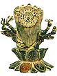 The sculptural depiction of the Devi is flawless in terms of the beauty and power expressed. Her gaze is straight; Her composure of Her full-featured countenance, determined. The folds of Her silken saree gather over Her lalitasana in lifelike folds. Starting from the crown and the kundalas to the rest of Her shringar, their luxuriance conveys Her divine presence. Zooming in on the back would enable you to appreciate the sheer amount of detail that the sculptor has put into this work - the five cascades of gorgeous hair gathering in one superb mane down the back, the petalled halo. What sets this Gayatri Devi sculpture apart from the usual Hindu devi iconographies is the majestic lotus arrangement that functions as Her pedestal. Two freshly bloomed lotuses have been placed with the bases of their pistils together, and the Devi Gayatri is seated amidst the flared petals of the one opening upwards.