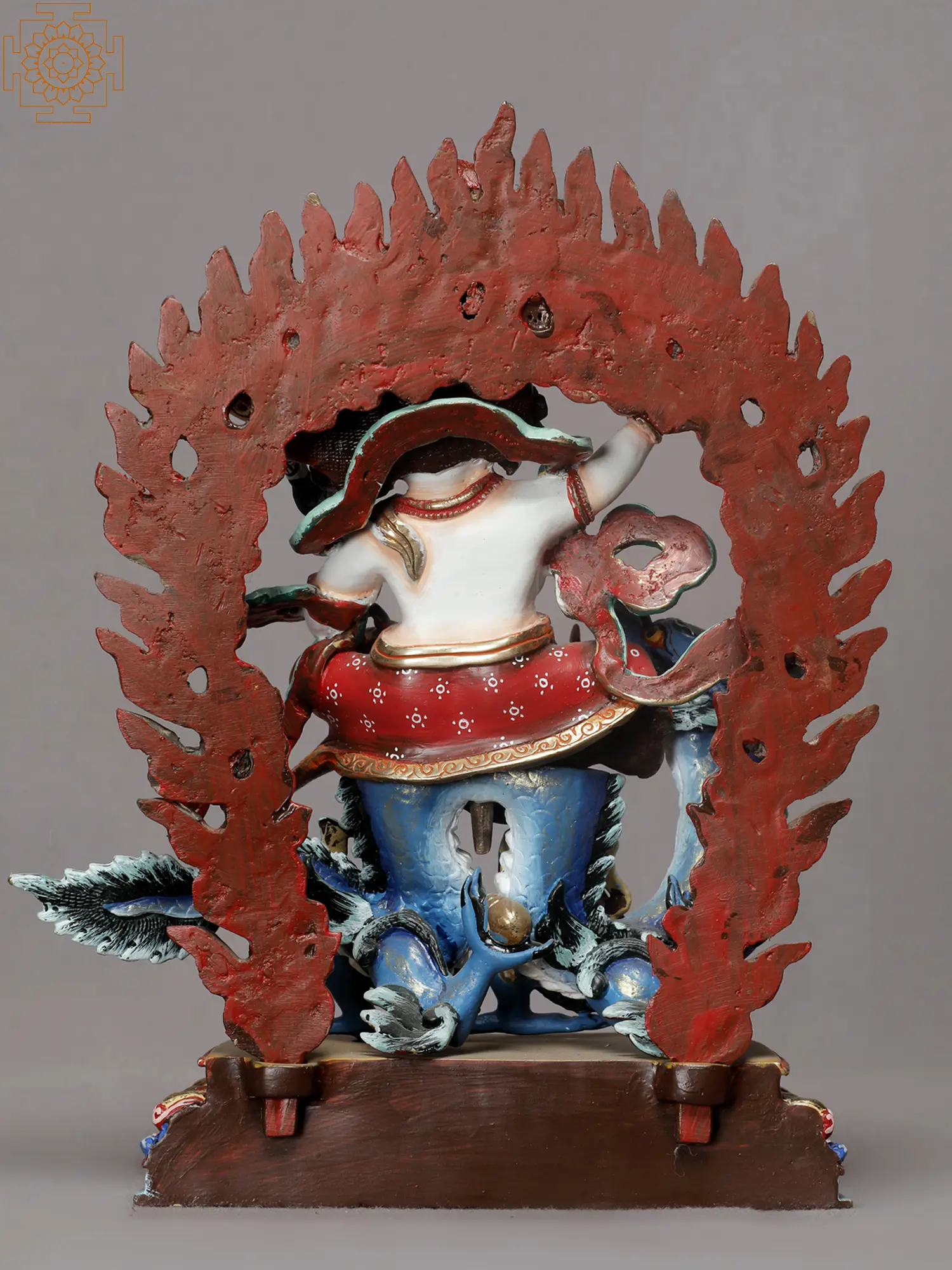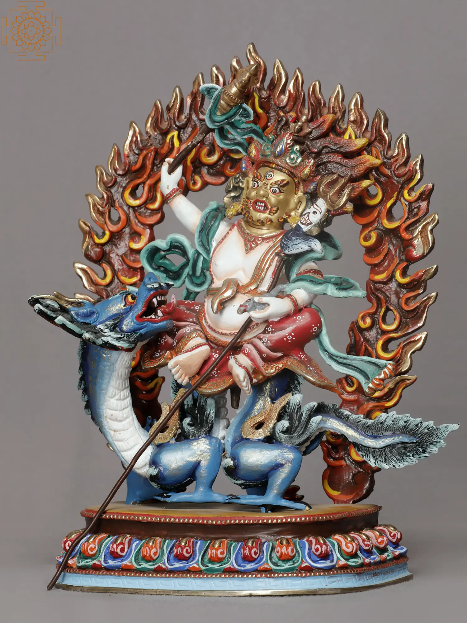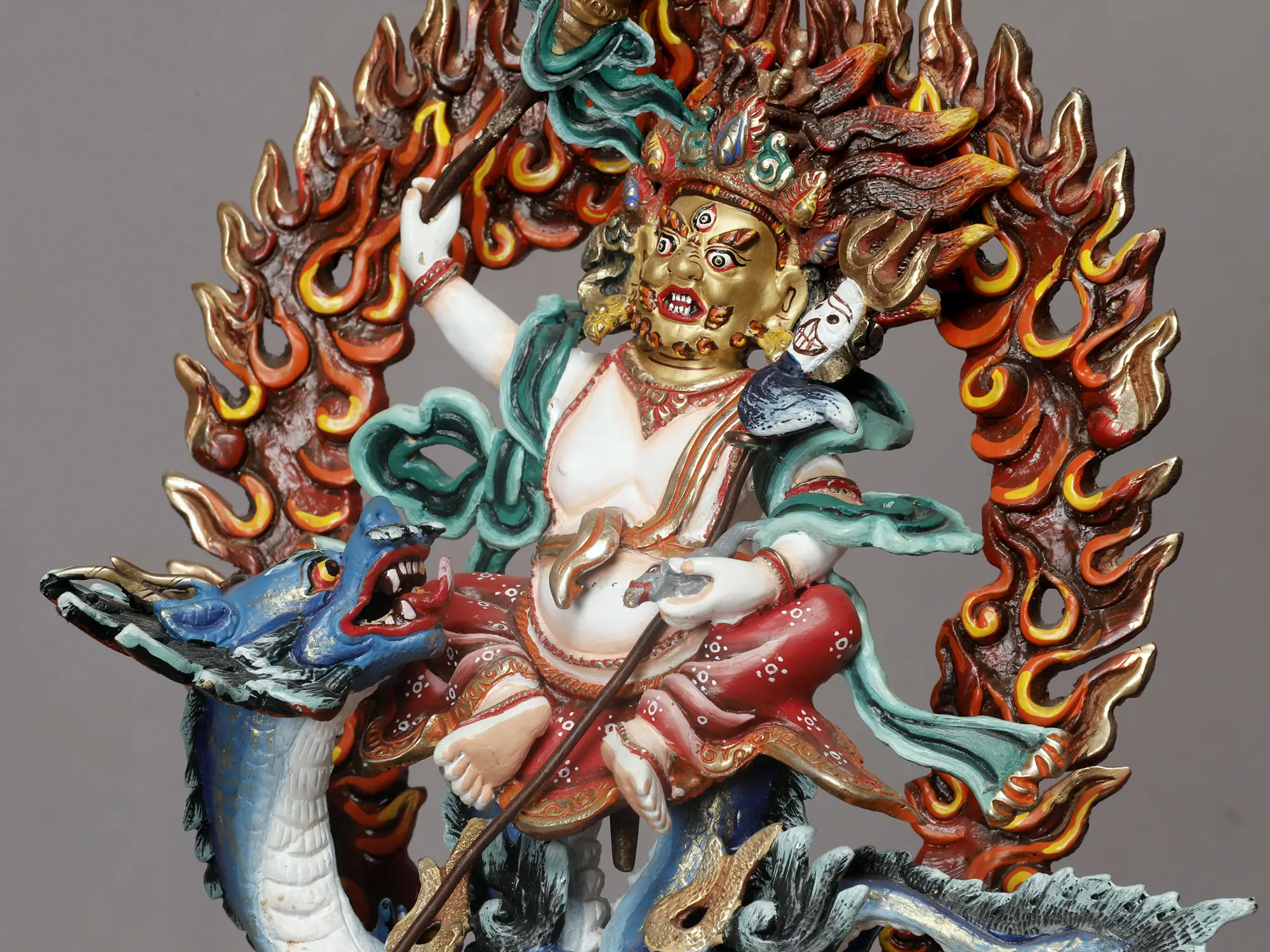 White Jambhala, recognized in Tibetan Buddhism as a deity associated with wealth and prosperity, is a part of the five Jambhala, each linked to different facets of abundance. White Jambhala specifically holds sway over material wealth and financial well-being. With one face and two hands, he holds a mongoose whose jewels flow from his mouth. This symbolizes the transformative power of turning ignorance and greed into wisdom and generosity, with a Katvanga staff resting on his shoulder. On the other hand, he holds a stick of gold, he is adorned with ornaments, and silk of various colors, riding on the back of a green dragon.