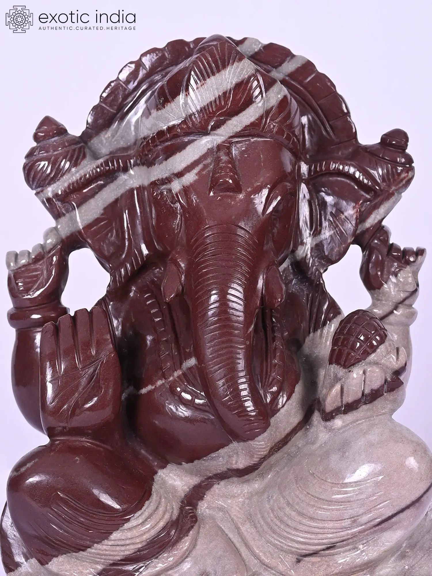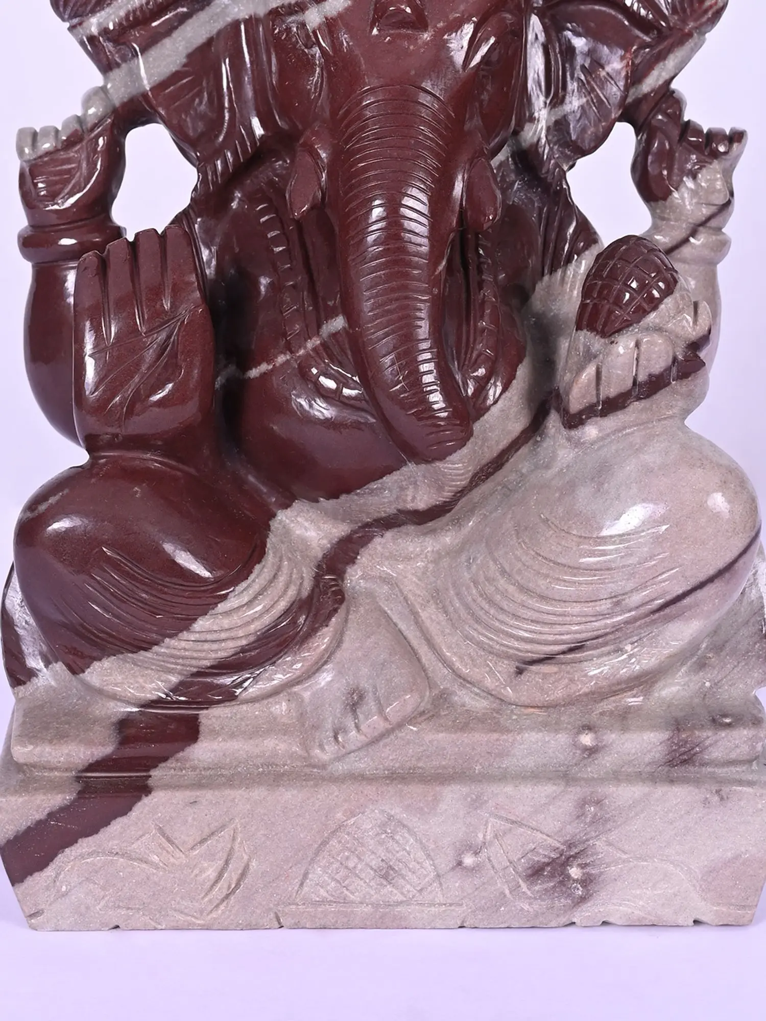 The striking visual appeal of this piece is deeply rooted in its material and form. Rich, earthy tones are artfully marbled with creamy highlights, creating a natural elegance that enhances the divine presence. The four-armed form of the deity, seated in a posture of quiet contemplation, is rendered with profound grace and expressive detail. From the gentle curl of the trunk to the serene expression on the face and the articulated fingers, every element speaks of thoughtful creation and inherent beauty, inviting you to discover new nuances with every glance.