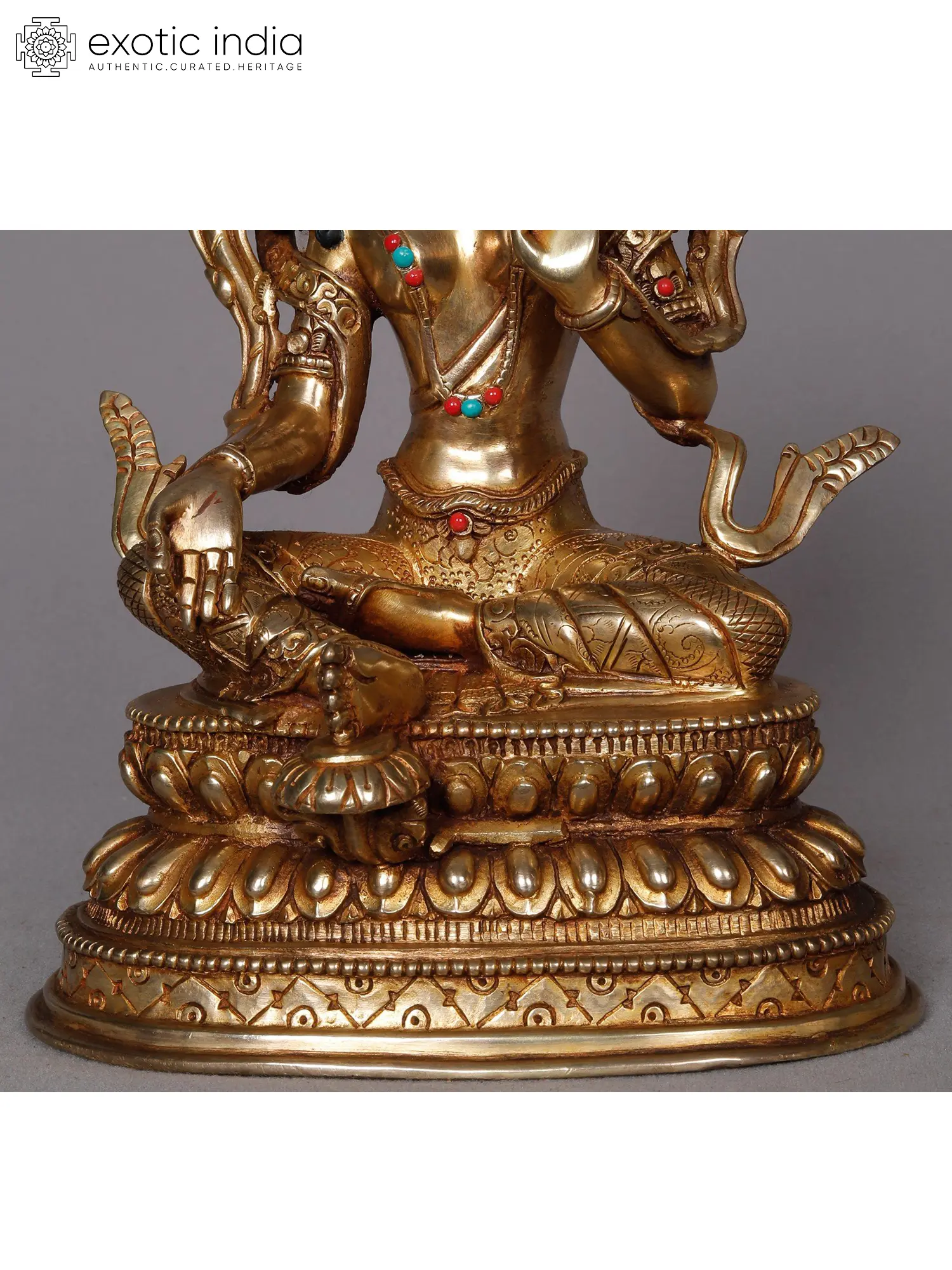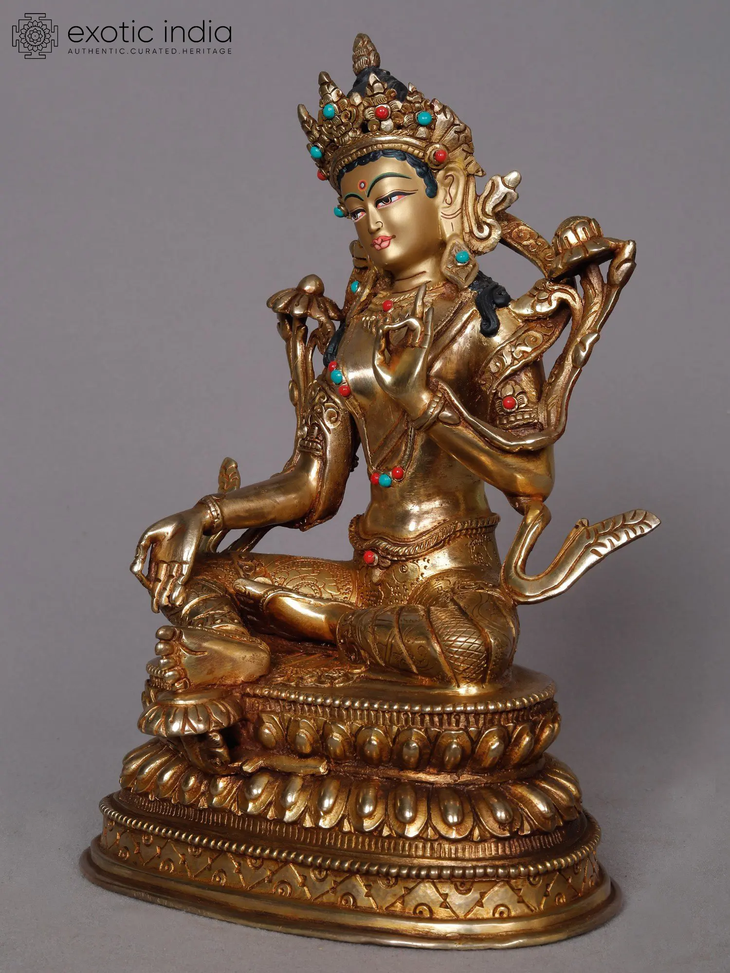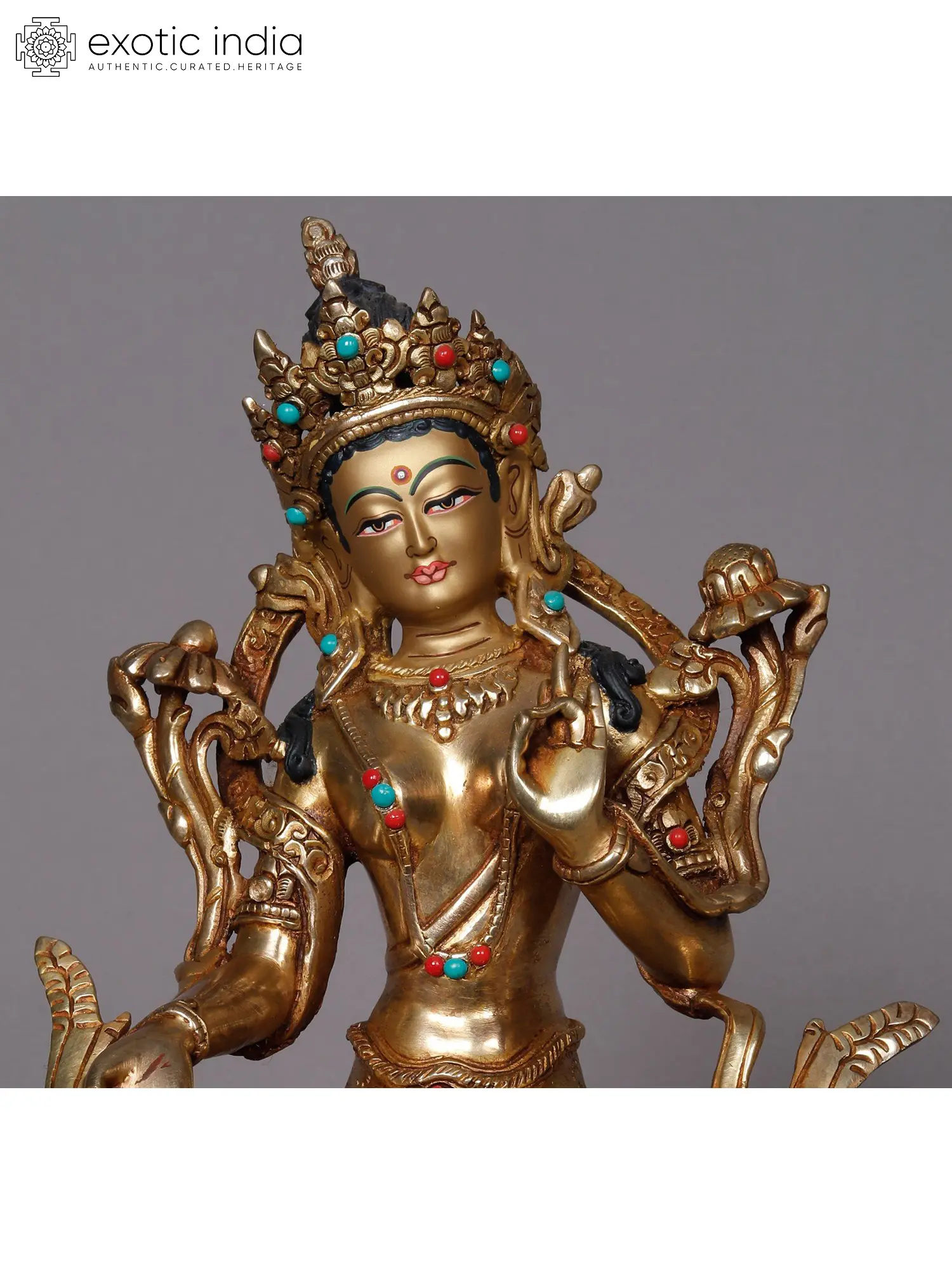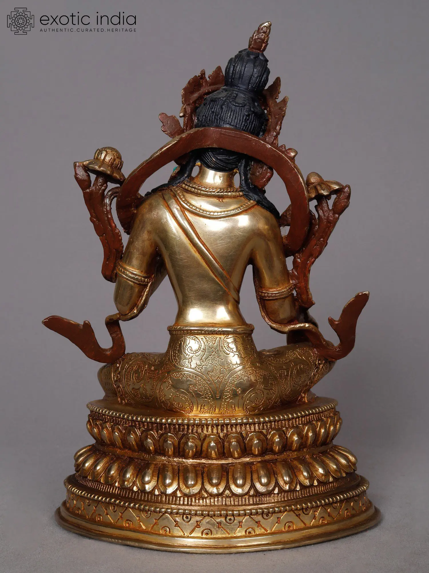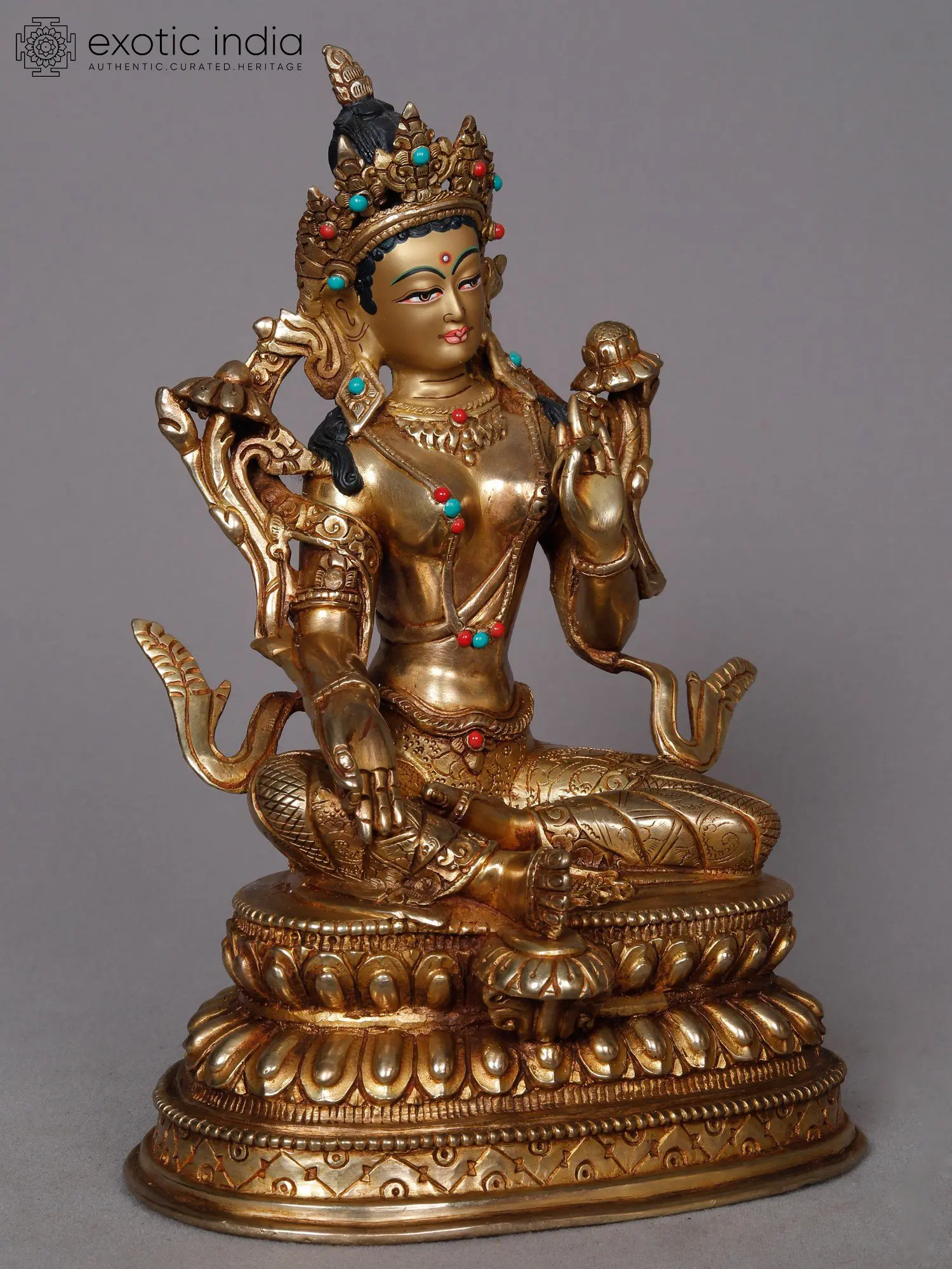 Originating in India, Tara's influence spread globally. 'Green Tara' shields against misfortune, safeguarding humanity and nature, especially plants. As Khadiravani, a forest goddess, she's linked to plant life, acacia trees, and the wind. A guardian of wildlife and wind, Tara stands with her consorts, Ekajata and Ashokanta. Her left-hand holds a long-stemmed lotus, an emblem of her essence.