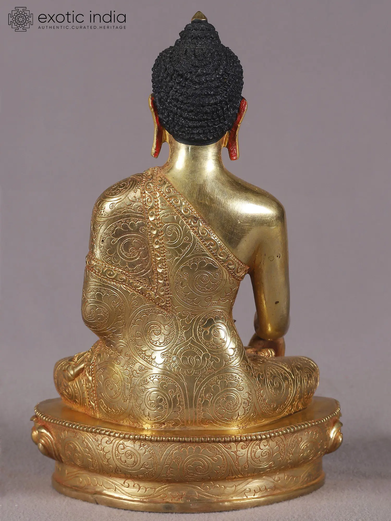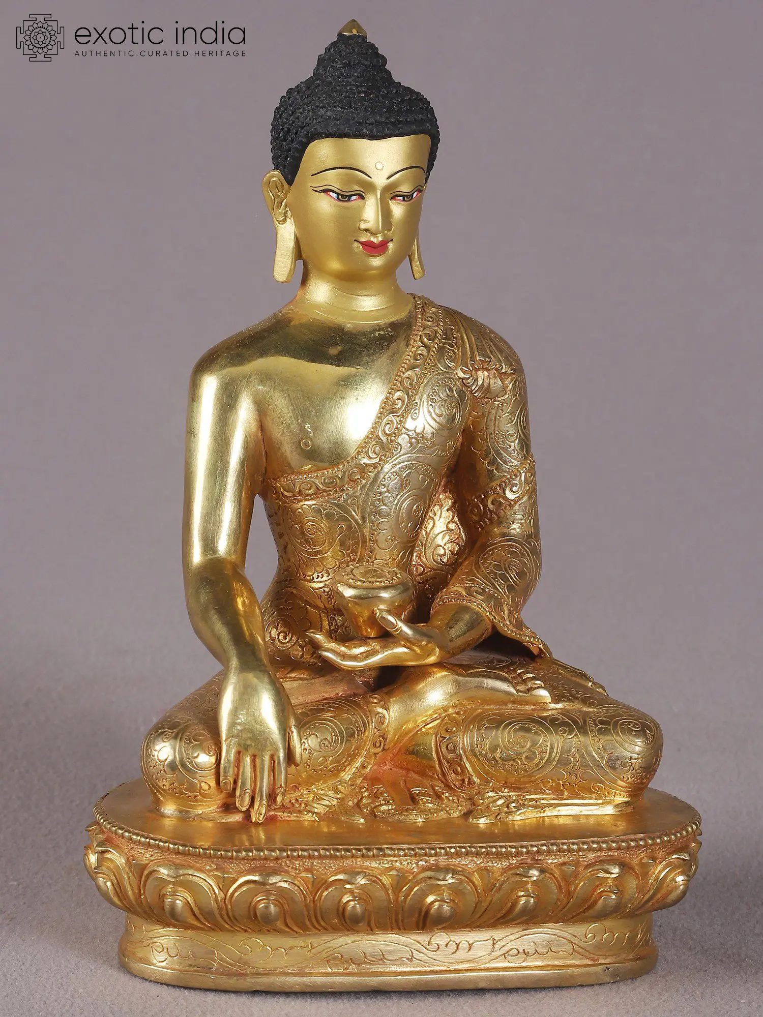 This exquisite statue captures the serene presence of Lord Buddha, meticulously crafted in Nepal, a land steeped in spiritual heritage. Fashioned from copper and adorned with a rich gold finish, this depiction radiates a luminous aura, symbolizing the profound enlightenment and inner peace that Lord Buddha embodied. The artist's skilled hand is evident in every detail, from the gentle curvature of the lips to the tranquil gaze of the eyes, inviting contemplation and a sense of calm. The traditional posture, with legs crossed in a meditative pose, signifies the practice of *padmasana* or the lotus position, a stance associated with deep spiritual absorption and detachment from worldly concerns. The robe, draped gracefully over the Buddha's shoulder, is adorned with intricate patterns, a testament to the artistry and dedication involved in its creation. These ornate designs often represent the cosmic order or the interconnectedness of all things, further enriching the spiritual narrative of the sculpture. ––––––––––