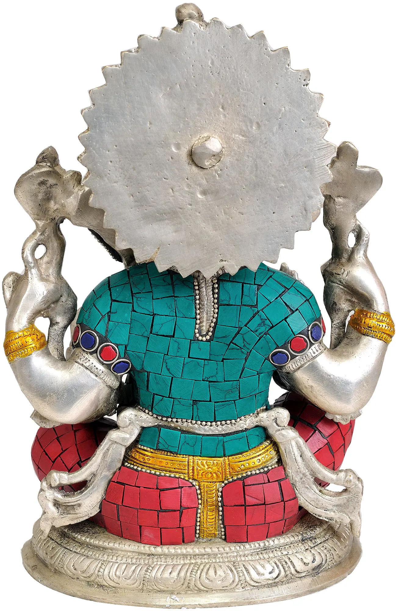 This captivating idol is meticulously handcrafted from high-quality brass, ensuring its durability and timeless appeal. The artist's skilled hands have brought to life the divine form of Ganesha, from the gentle curve of his trunk to the wise expression in his eyes. The brilliance of the brass is further enhanced by the exquisite inlay work, featuring a mosaic of vibrant turquoise, red, and deep blue stones. These colorful stones are strategically placed to accentuate Ganesha's serene attire and adornments, creating a visually stunning masterpiece that commands attention and reverence. Each tiny stone is carefully set, reflecting the dedication and artistry poured into its creation. The golden accents on his crown, jewelry, and weapons add a touch of regal splendor, making this idol a truly exceptional piece of art. ––––––––––